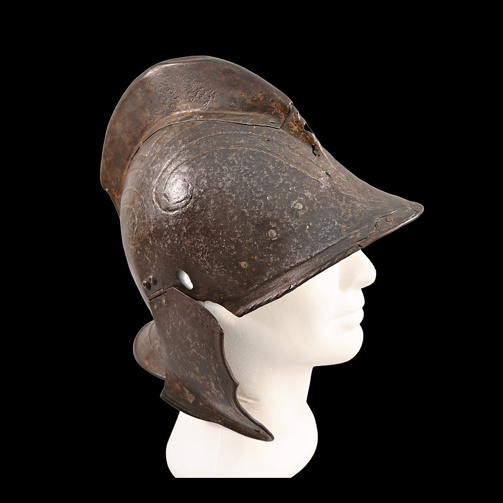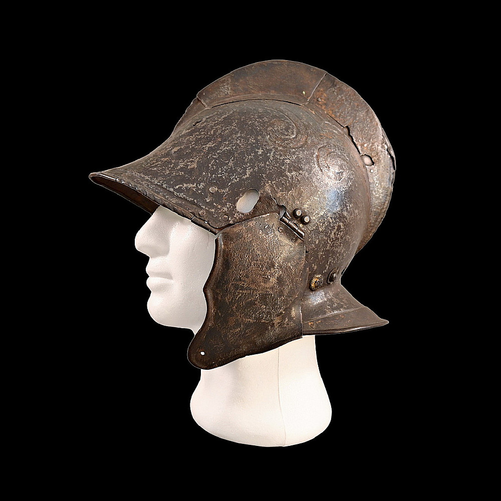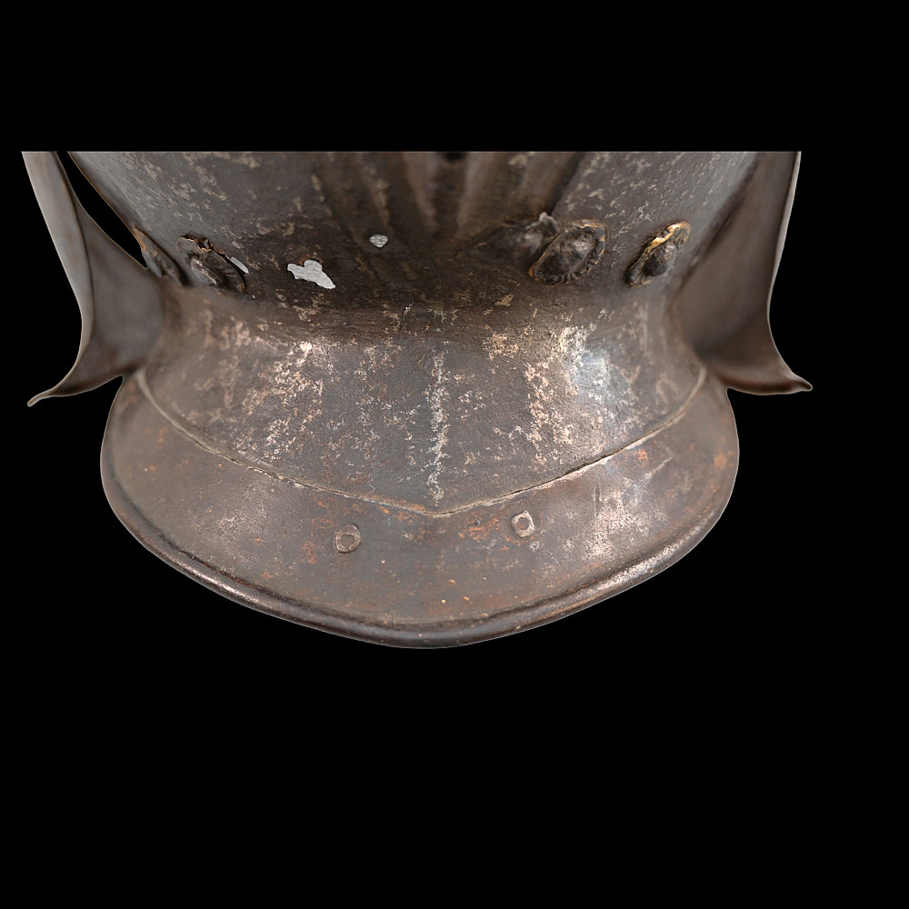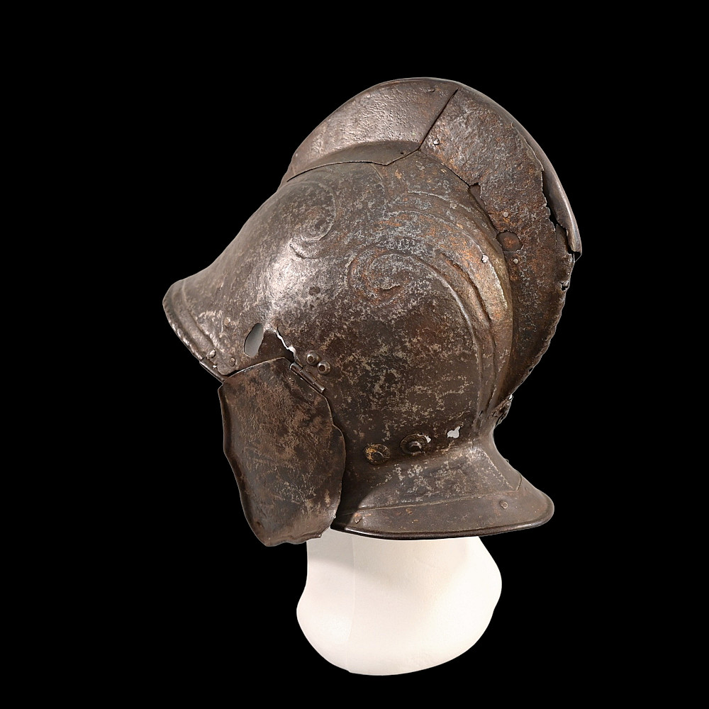 The burgonet helmet, Europe, 16th century. Decorated with relief pattern and remains of gilding. Restoration of the period of existence of the helmet. Probably the period of the religious war in France between Catholics and Protestants or the Huguenot war
