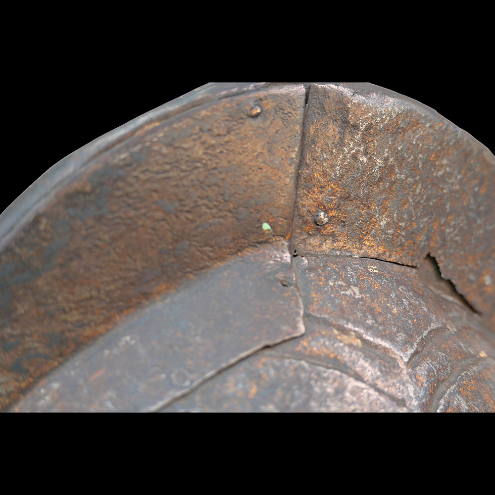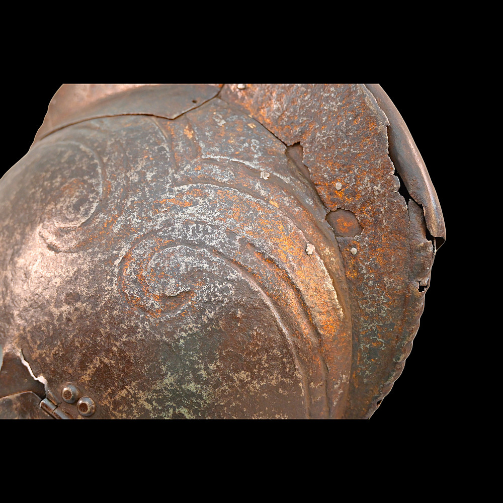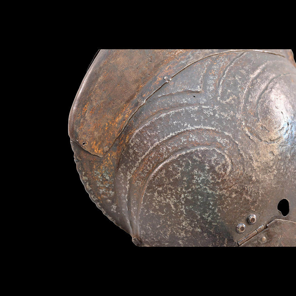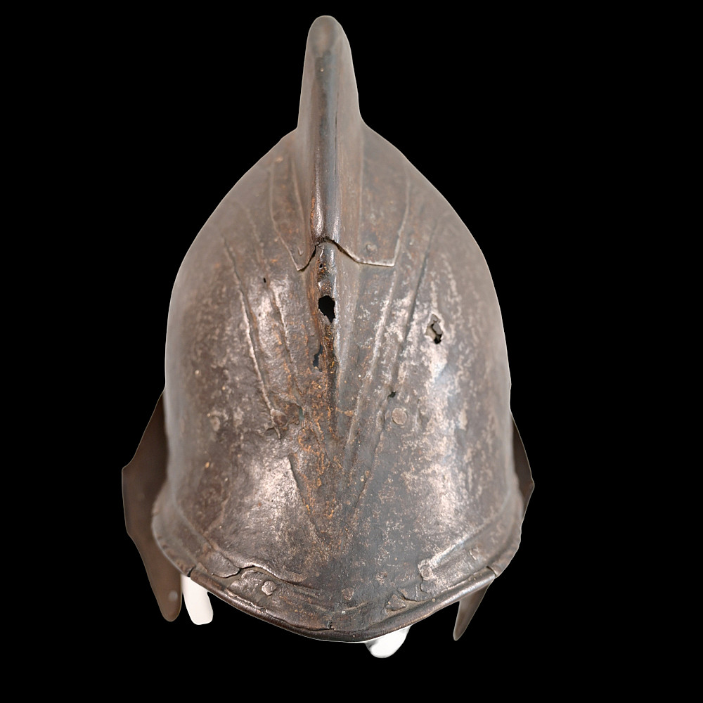 The burgonet helmet, Europe, 16th century. Decorated with relief pattern and remains of gilding. Restoration of the period of existence of the helmet. Probably the period of the religious war in France between Catholics and Protestants or the Huguenot war