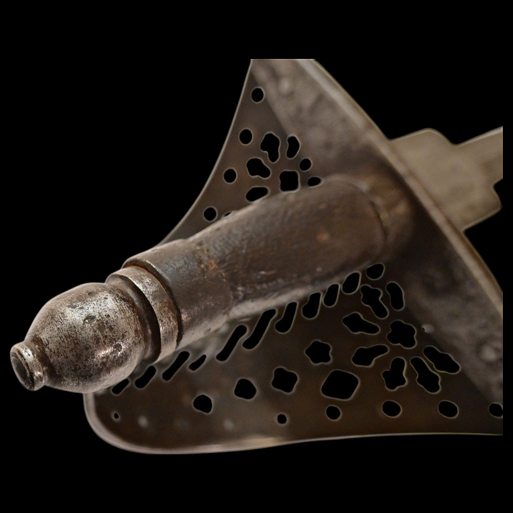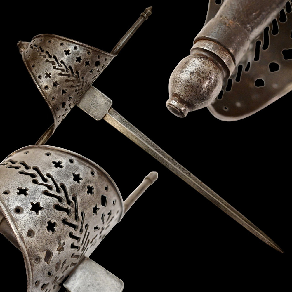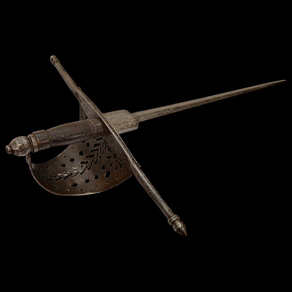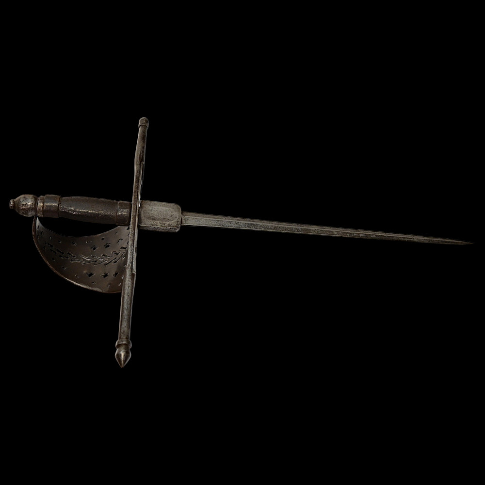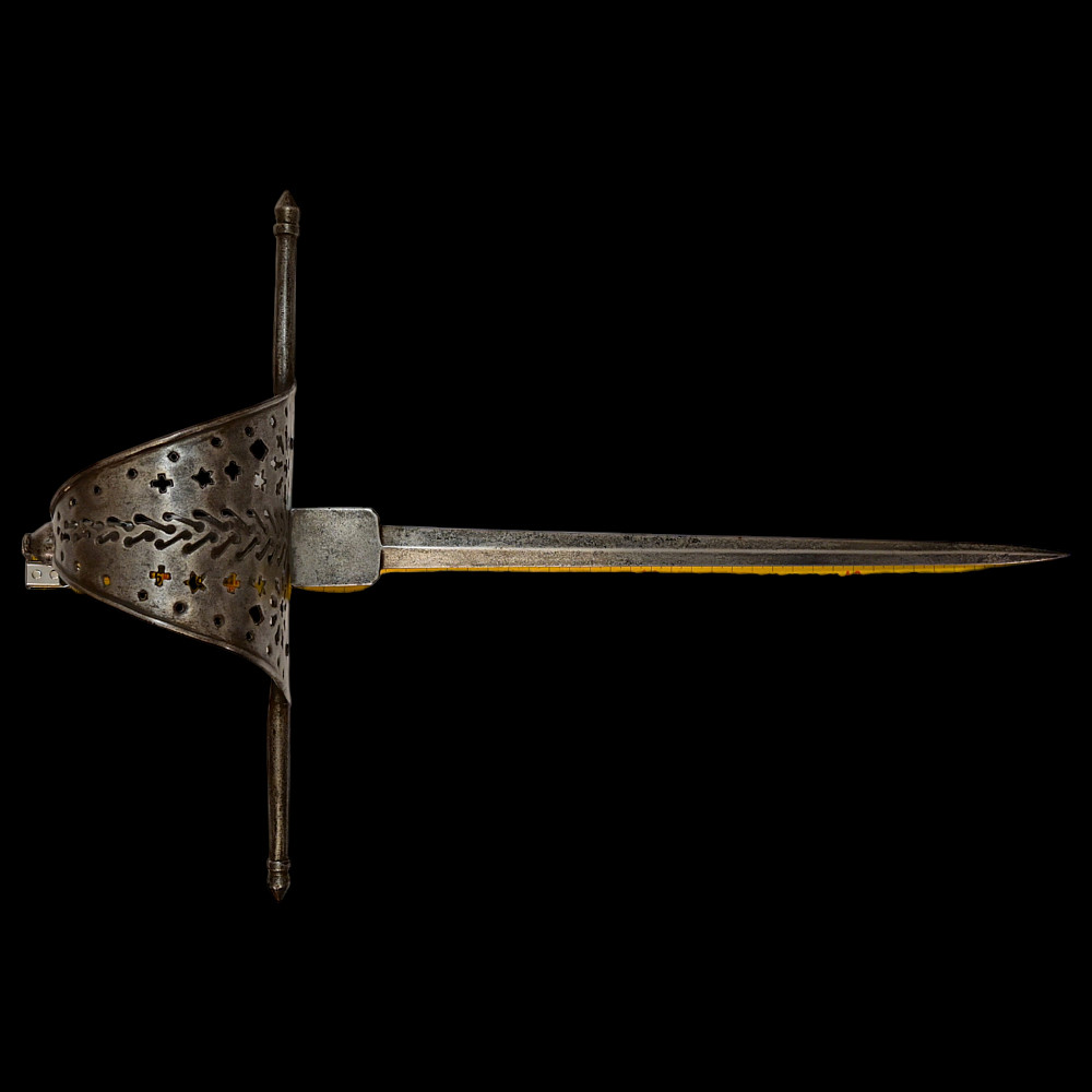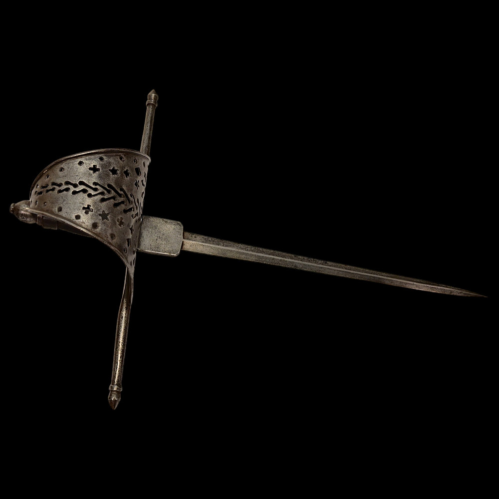 A beautiful Left-hand dagger, Spain, 18th century. Straight, double-edged blade. Guard of classical for Spanish Left-hand dagger shape. Exquisitely decorated with perforated patterns in geometric style. The steel pommel. The wooden handle. A fine example of weapon in good condition. Good condition, Length 51 cm.