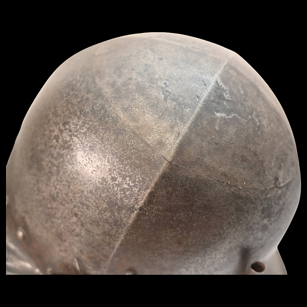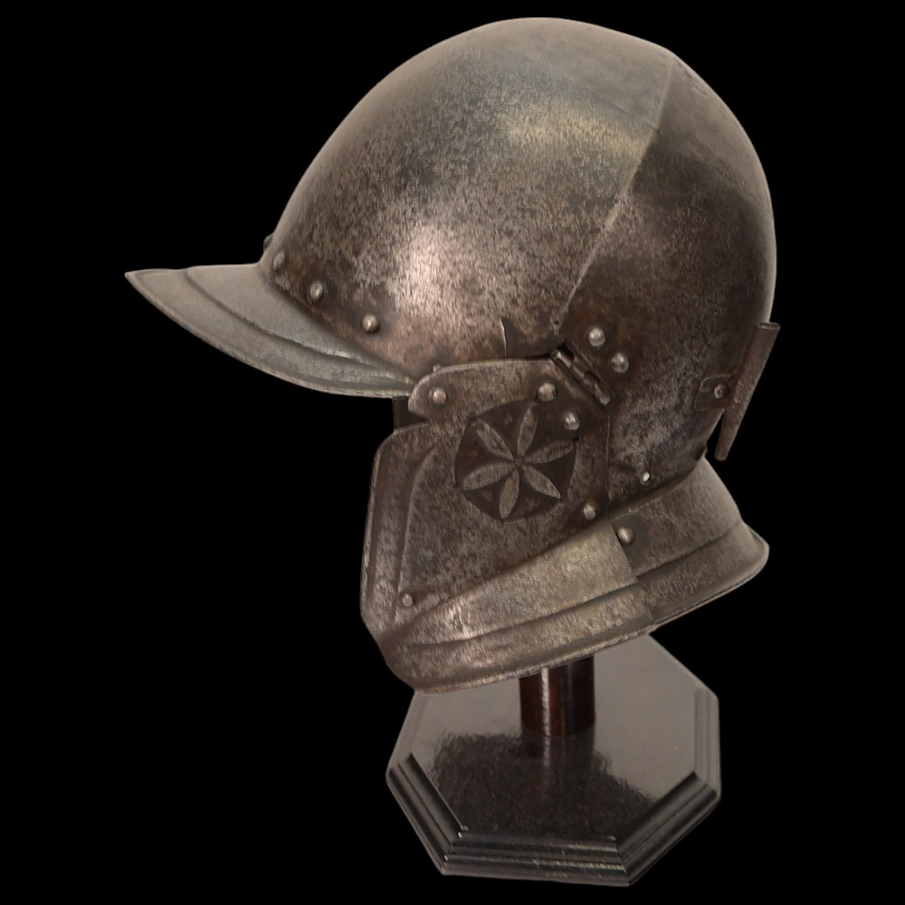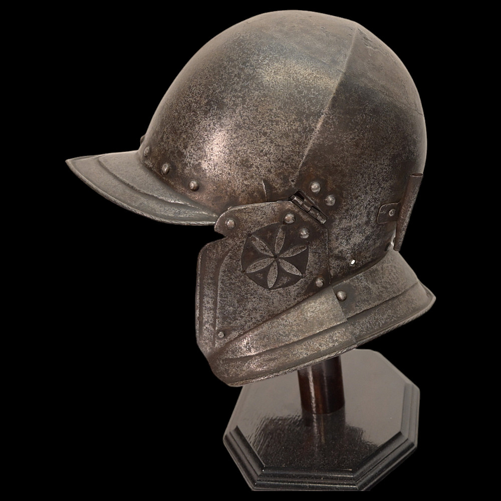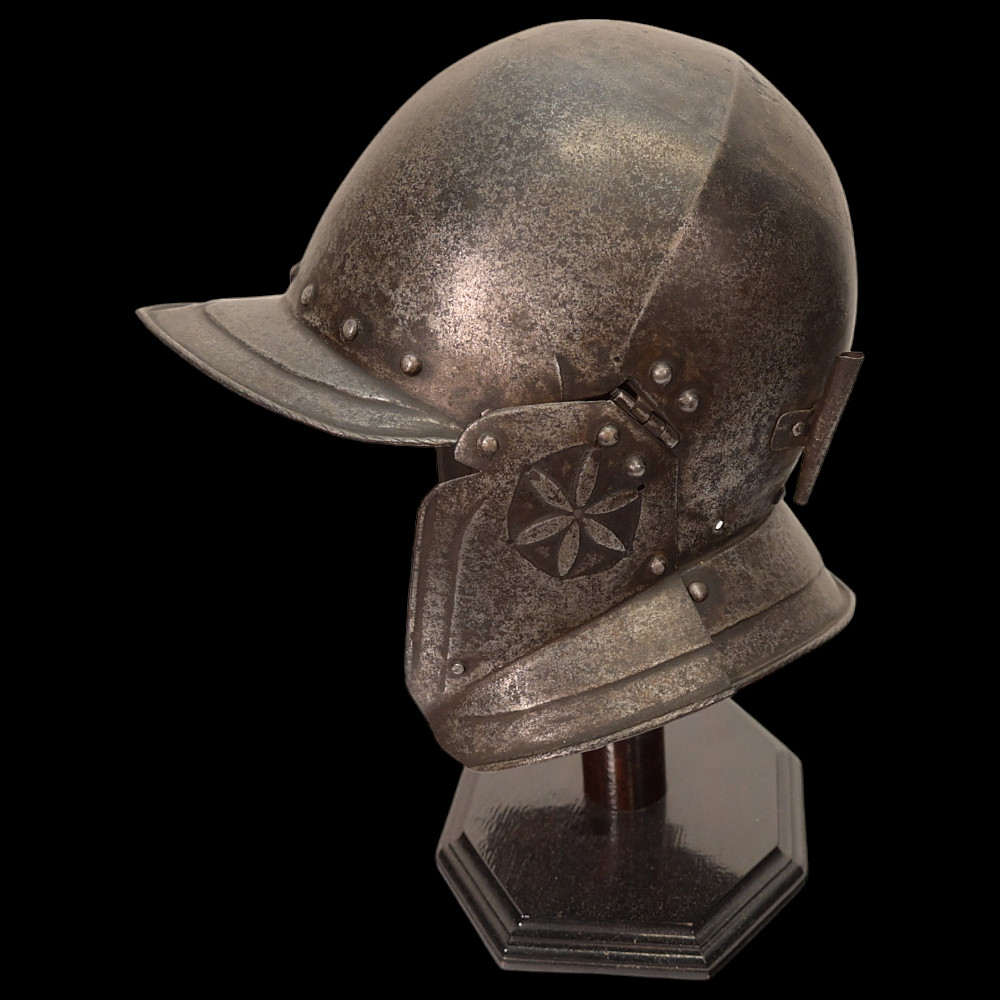 A burgonet, Germany, mid-16th century. The skull forged in three pieces. Hinged cheek pieces at the sides, the perforations for hearing chased with floral ornaments. Weight 1.03kg. length 23 cm.