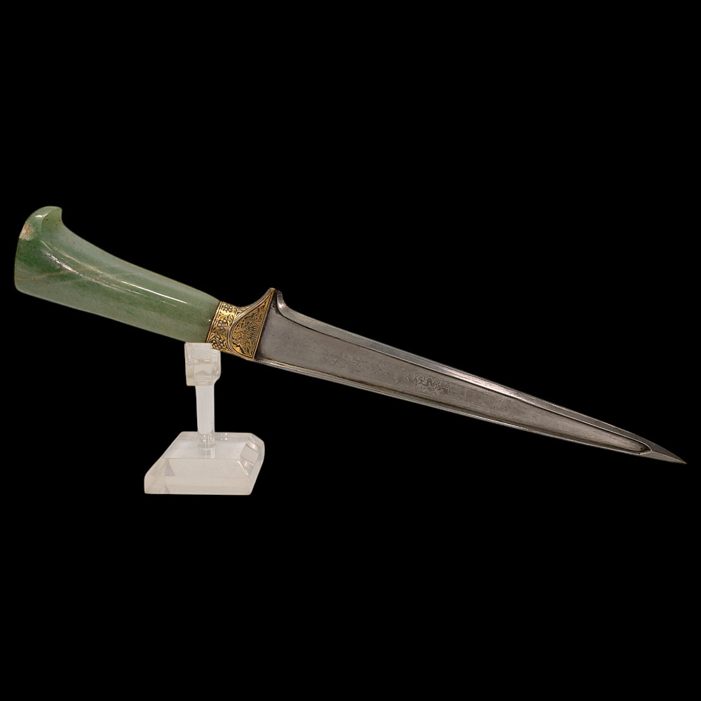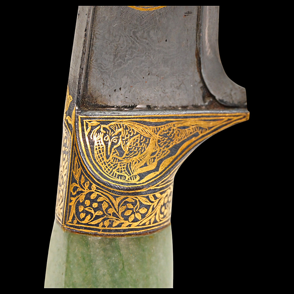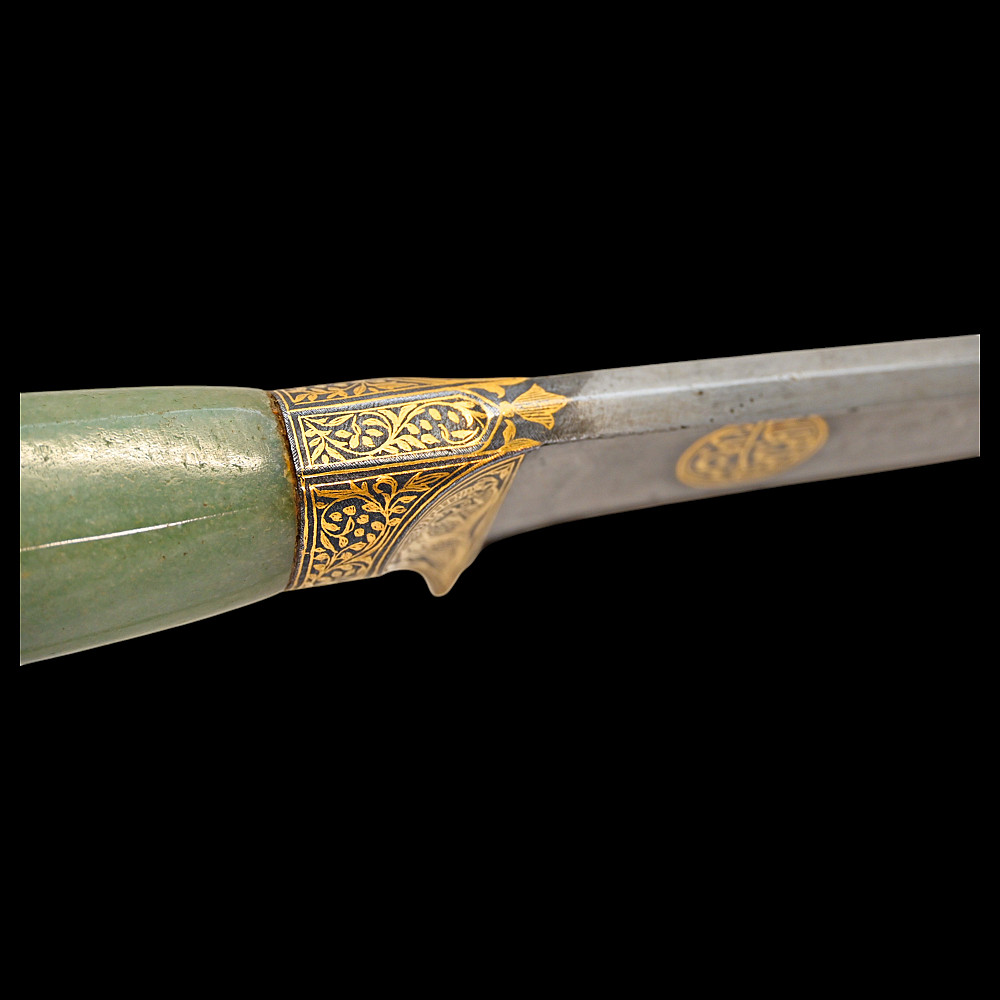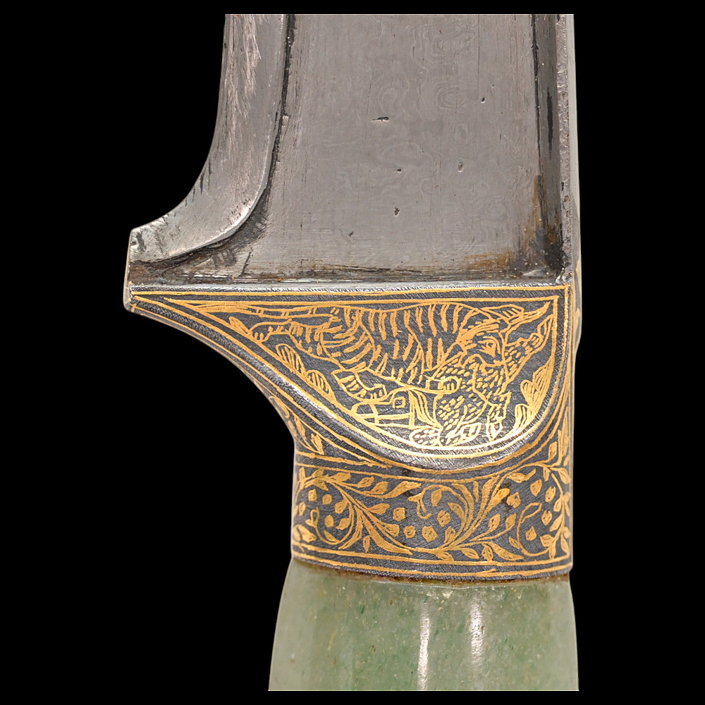 A fine Persian or Indian karud, jade handle, gold koftgari, late 19th century. A fine example of a classic type, with jade grips and a well-wrought blade with a T-back and armor-piercing tip, a round medallion with Arabic inscriptions made of gold using the koftgari technique. Ferrule between the handle and blade with gold koftgari. In its velvet-covered wooden scabbard. Late 19th century. A fine collector's dagger from the Indo-Iranian region. 46 cm.