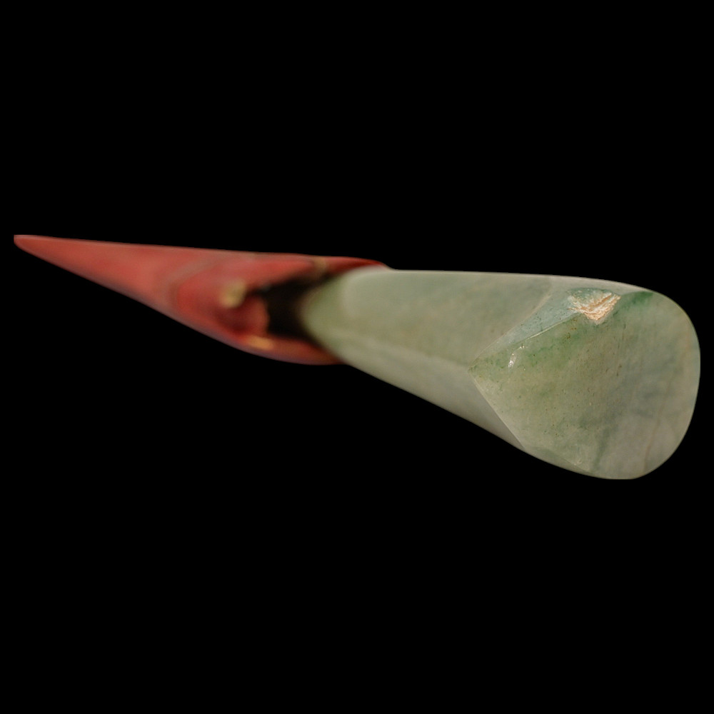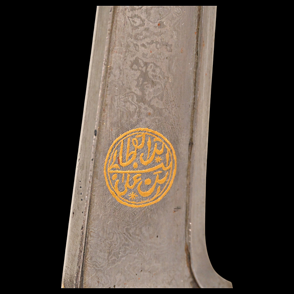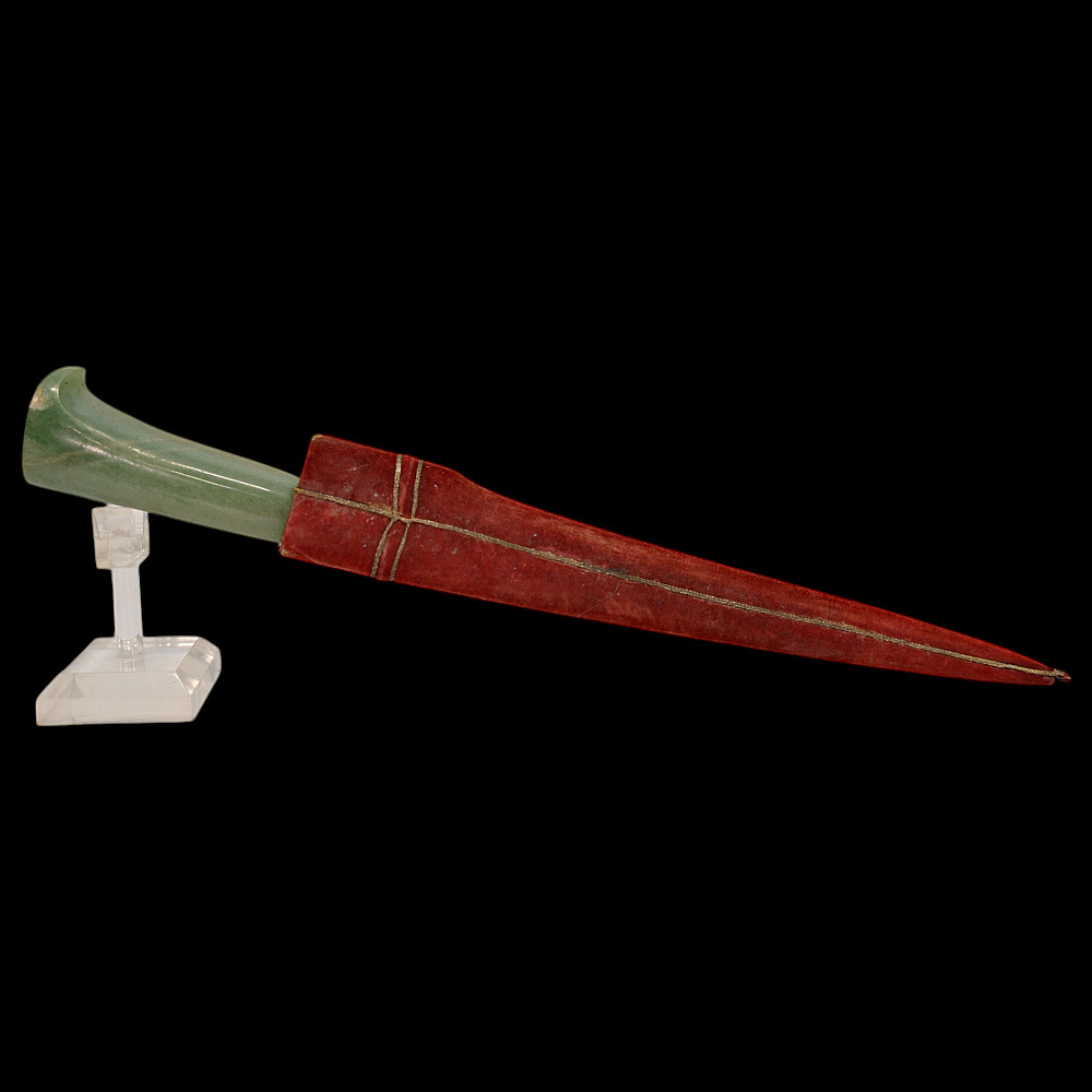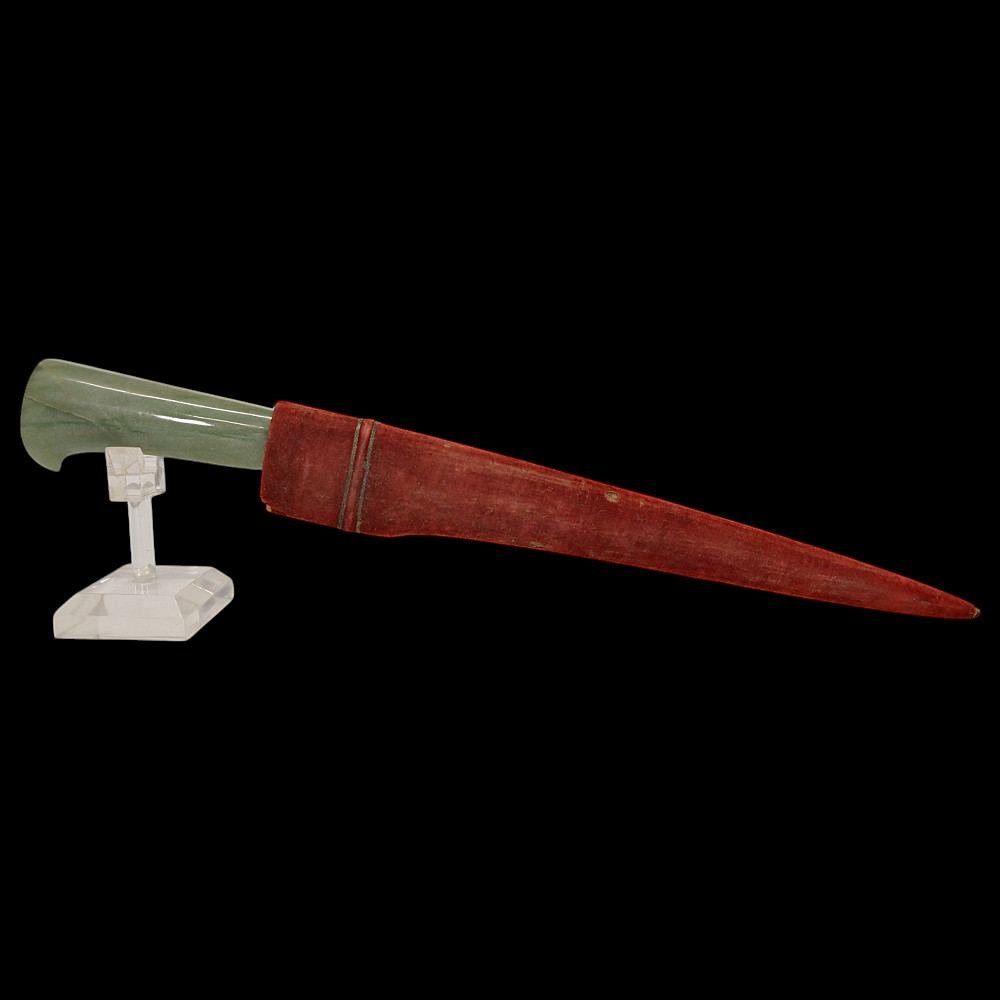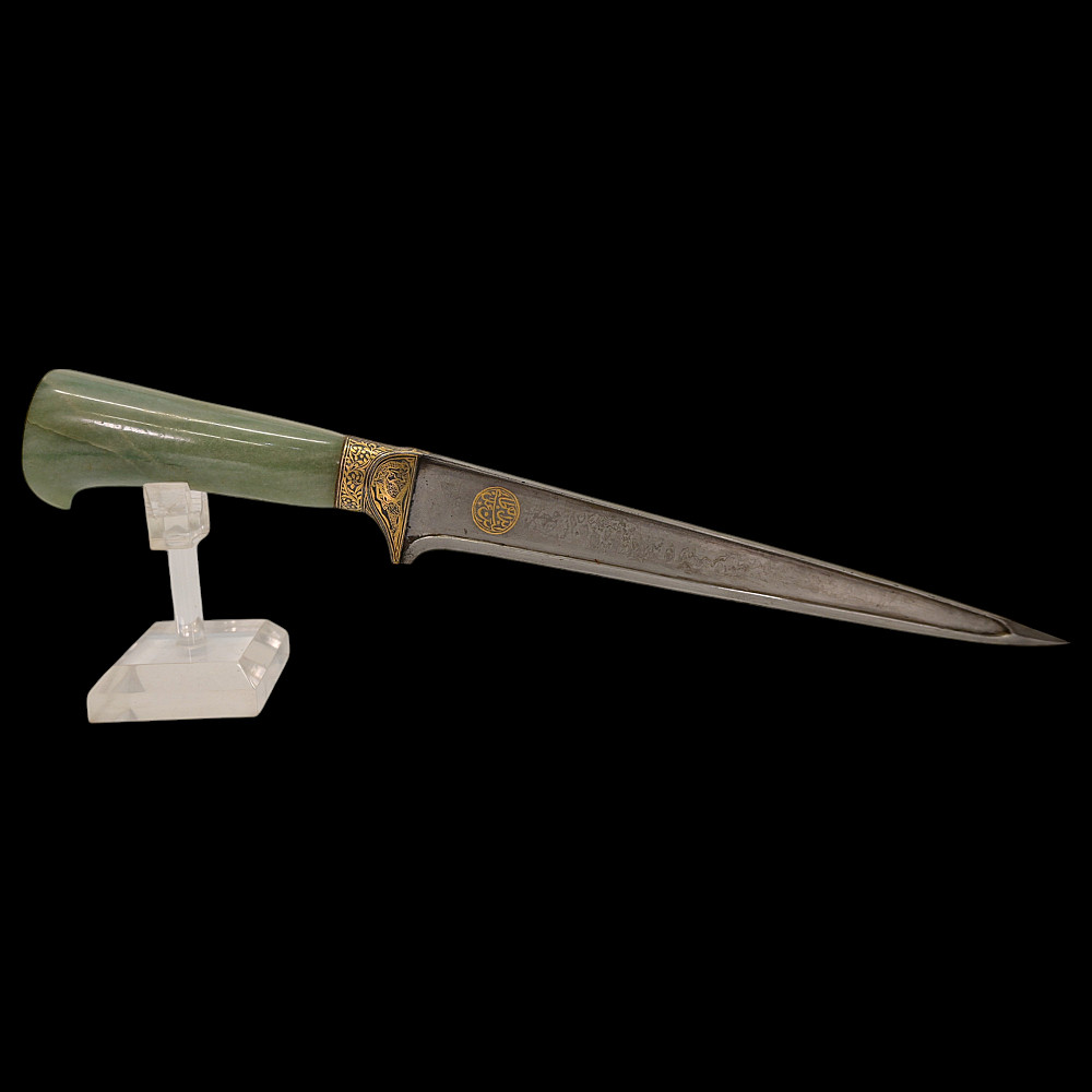 A fine Persian or Indian karud, jade handle, gold koftgari, late 19th century. A fine example of a classic type, with jade grips and a well-wrought blade with a T-back and armor-piercing tip, a round medallion with Arabic inscriptions made of gold using the koftgari technique. Ferrule between the handle and blade with gold koftgari. In its velvet-covered wooden scabbard. Late 19th century. A fine collector's dagger from the Indo-Iranian region. 46 cm.