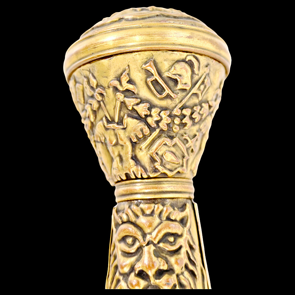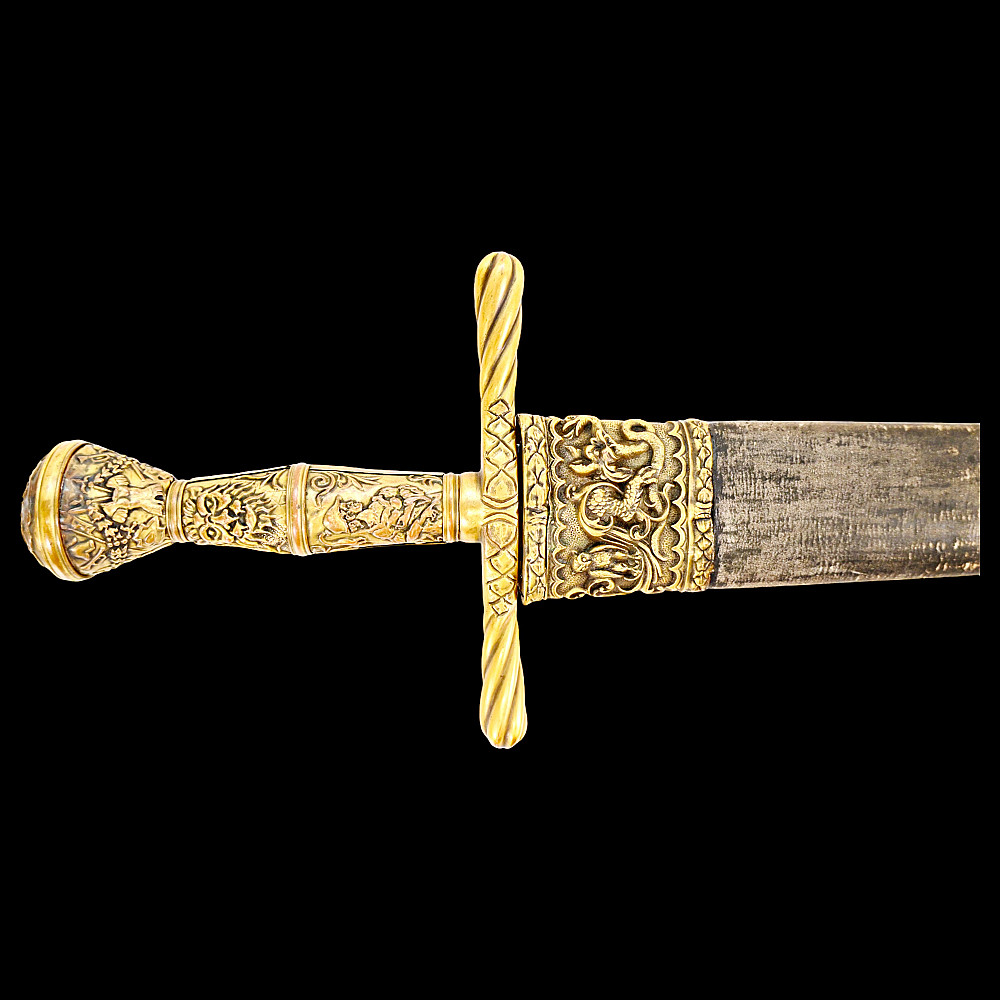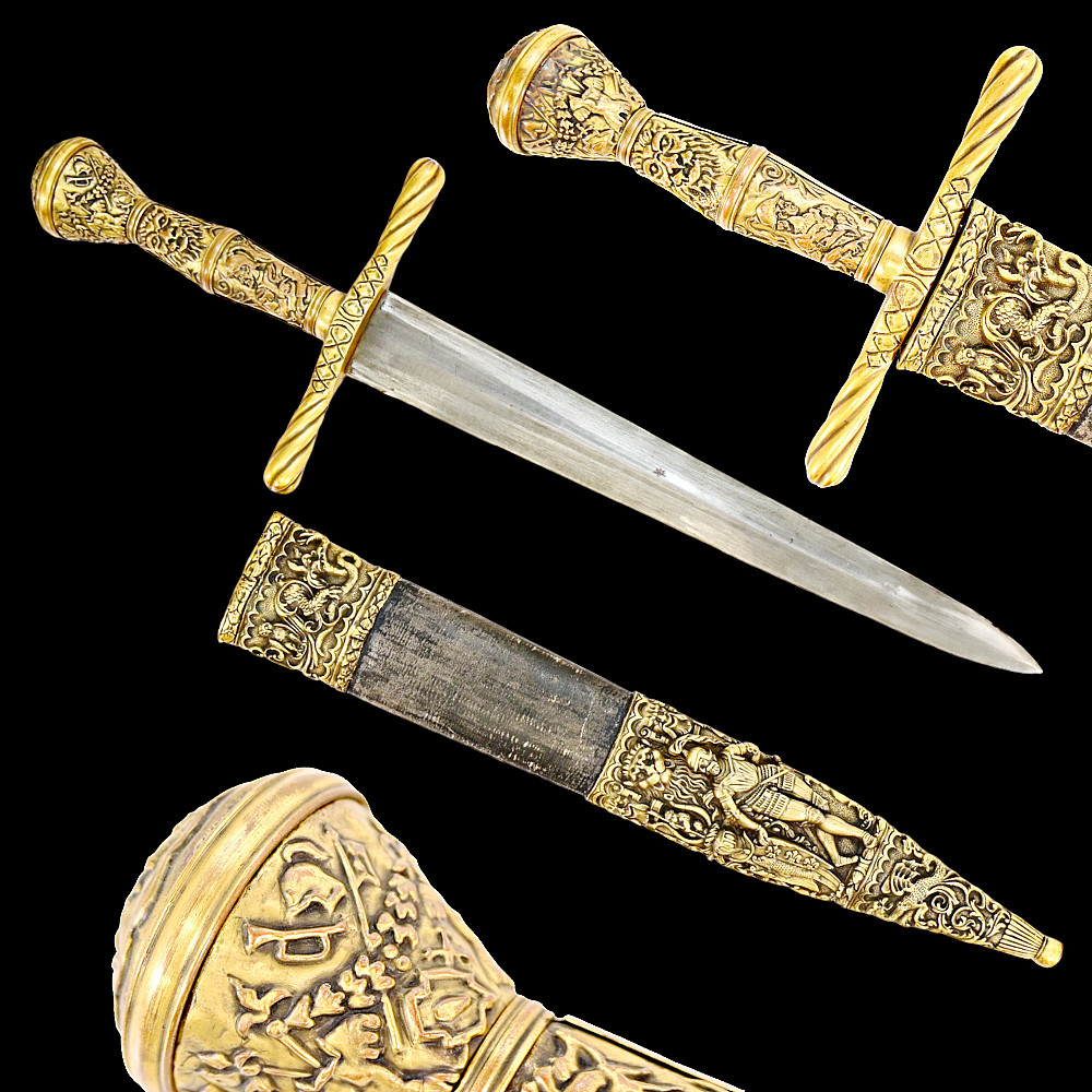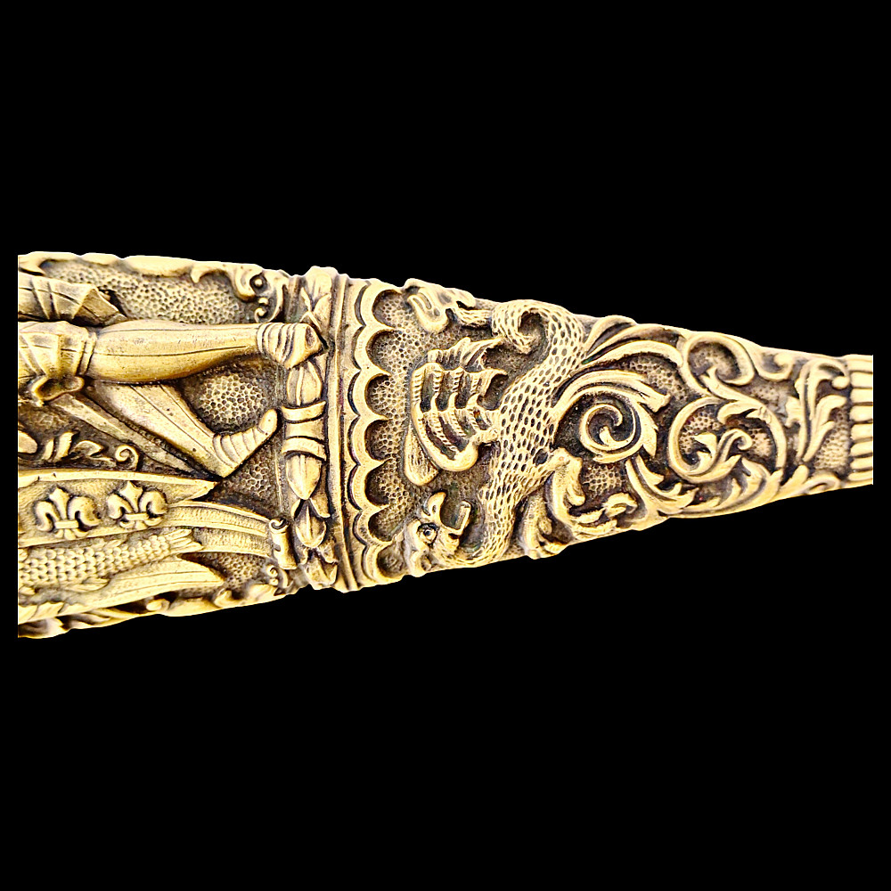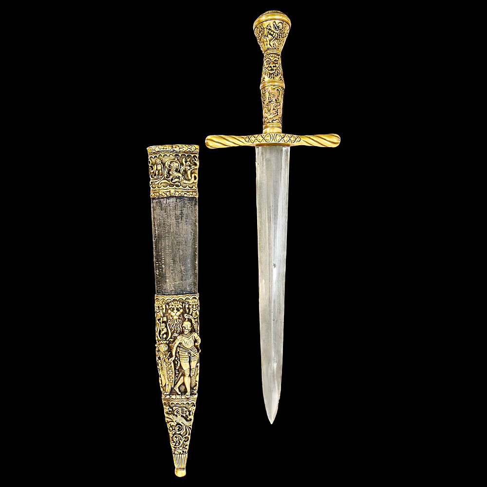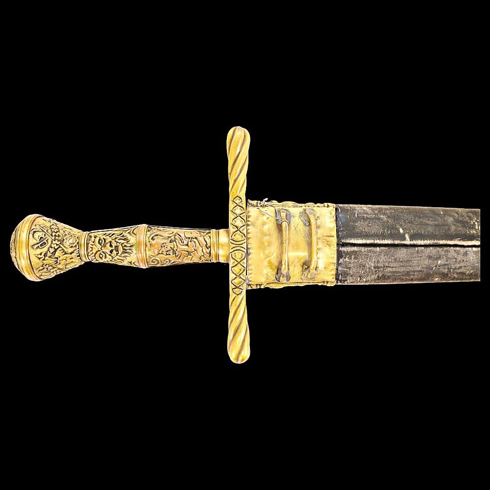 A magnificent 19th century French hunting dagger in the Renaissance style. The massive double-edged steel blade has a facet in the middle. The metal parts of the handle and scabbard are made of gilded copper alloy and decorated with magnificent decoration in the style of the 16th century, made using embossing and engraving. The sheath is made of wood and covered with leather. A wonderful, rare, collectible item.