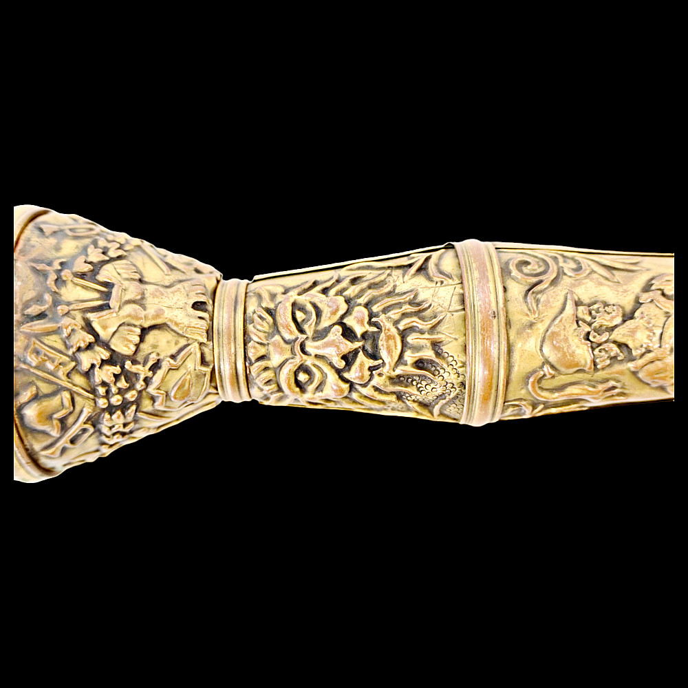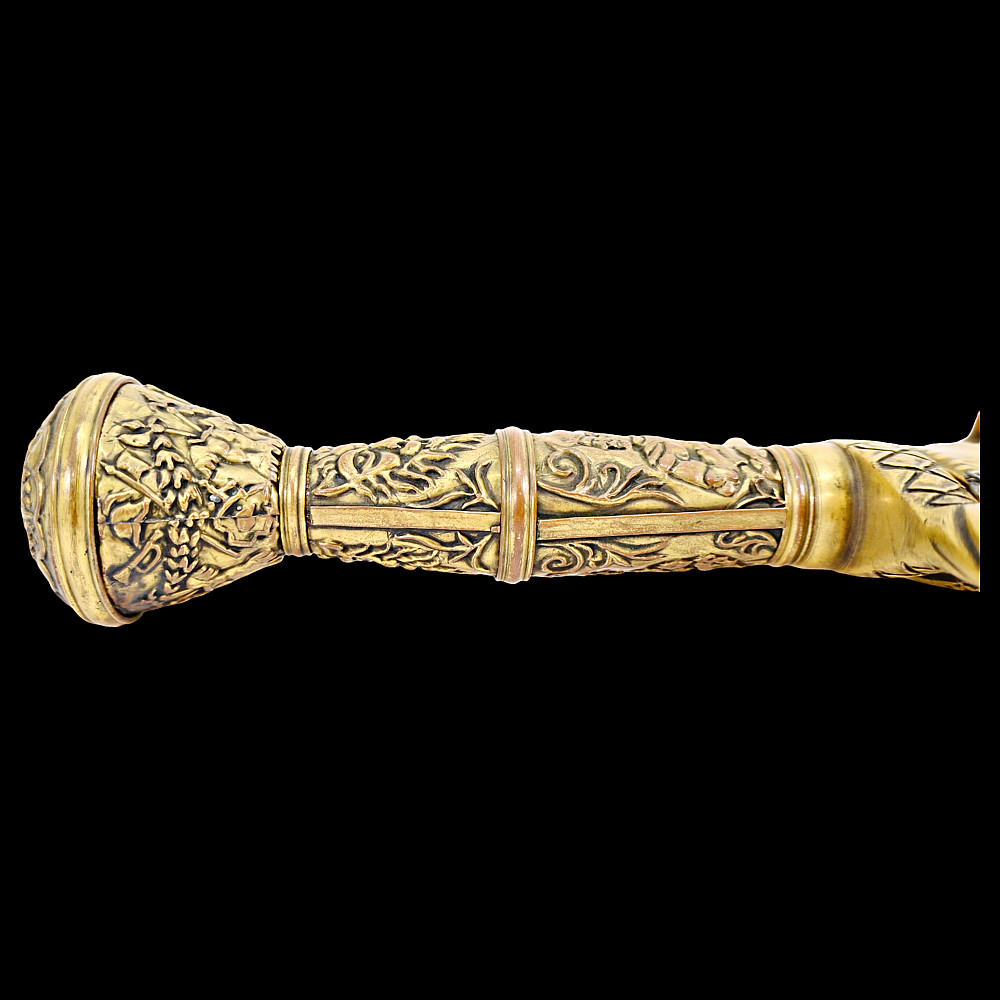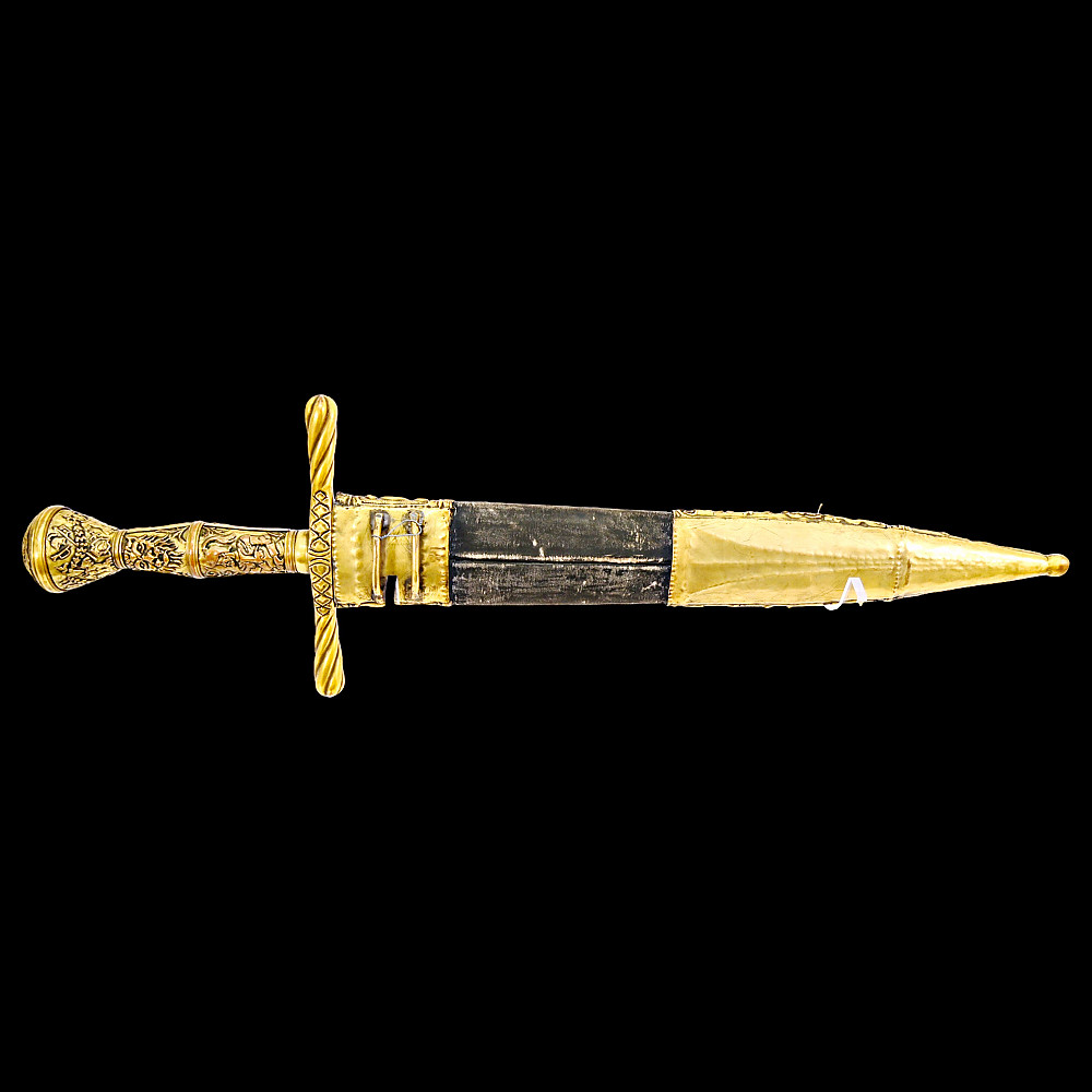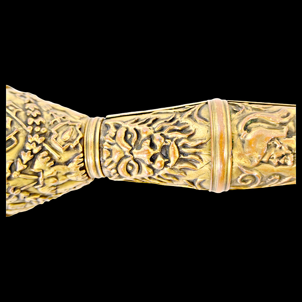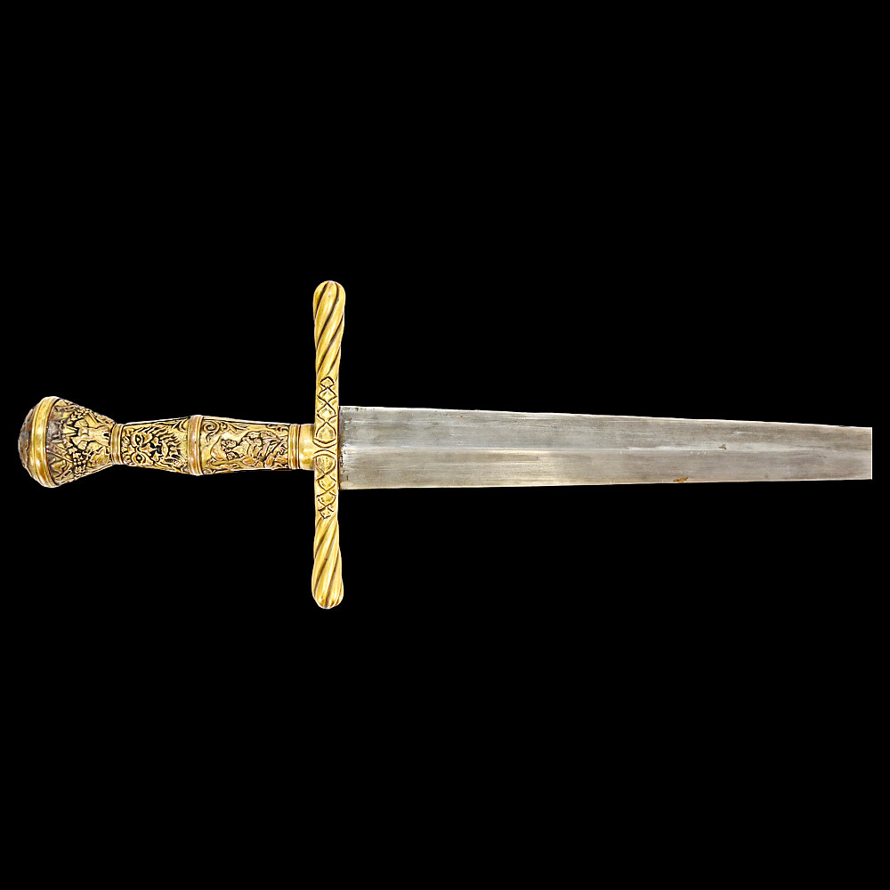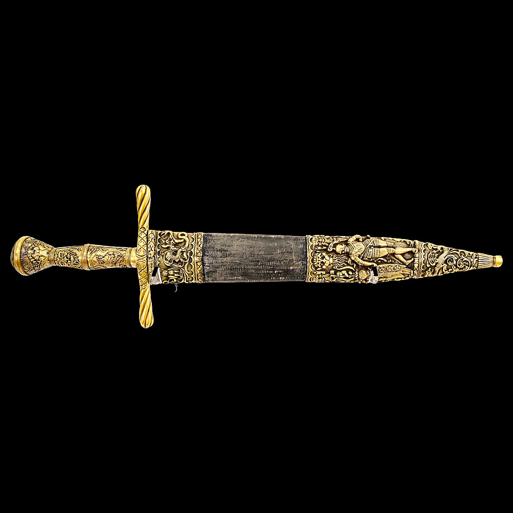 A magnificent 19th century French hunting dagger in the Renaissance style. The massive double-edged steel blade has a facet in the middle. The metal parts of the handle and scabbard are made of gilded copper alloy and decorated with magnificent decoration in the style of the 16th century, made using embossing and engraving. The sheath is made of wood and covered with leather. A wonderful, rare, collectible item.