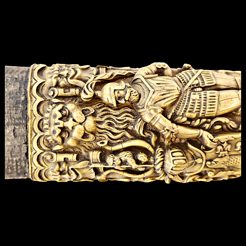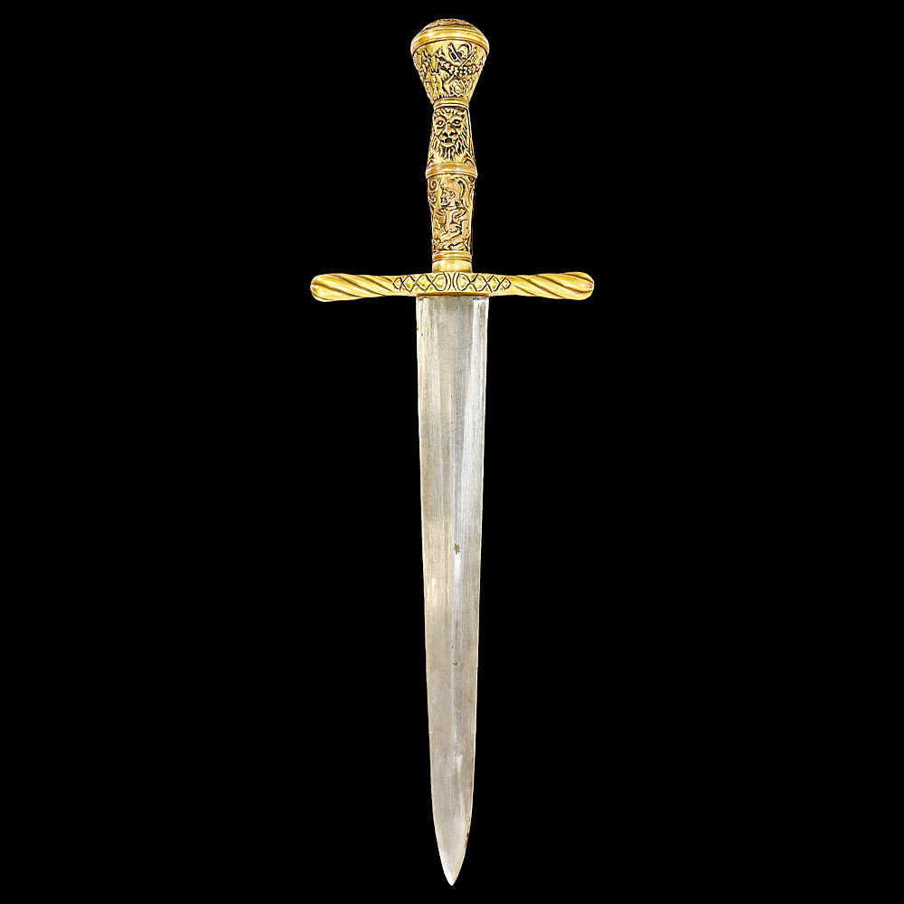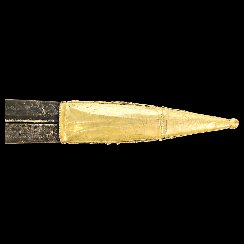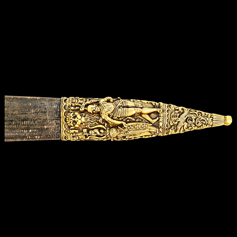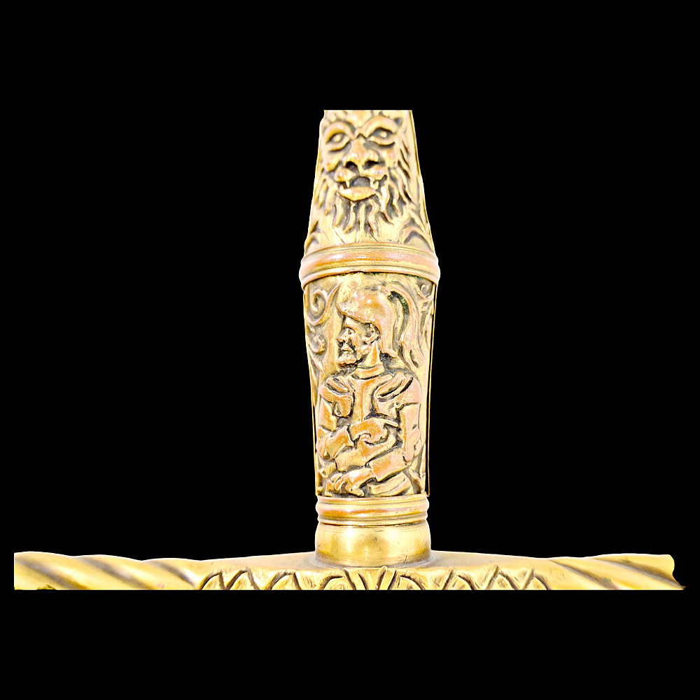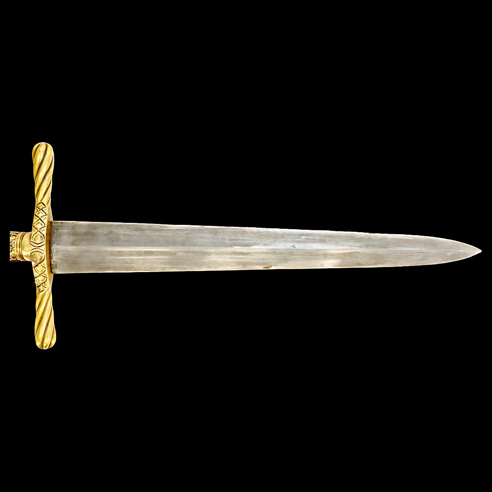 A magnificent 19th century French hunting dagger in the Renaissance style. The massive double-edged steel blade has a facet in the middle. The metal parts of the handle and scabbard are made of gilded copper alloy and decorated with magnificent decoration in the style of the 16th century, made using embossing and engraving. The sheath is made of wood and covered with leather. A wonderful, rare, collectible item.
