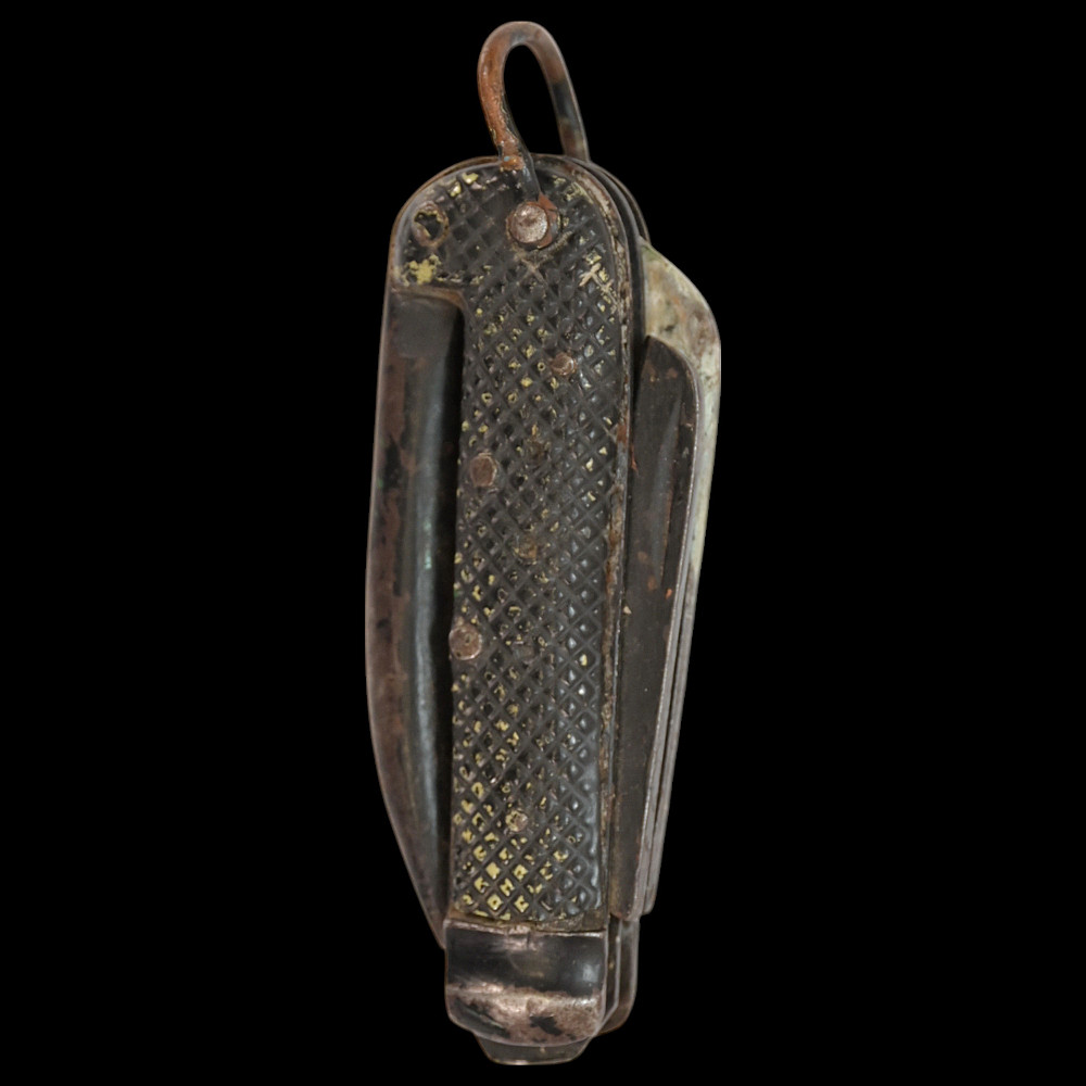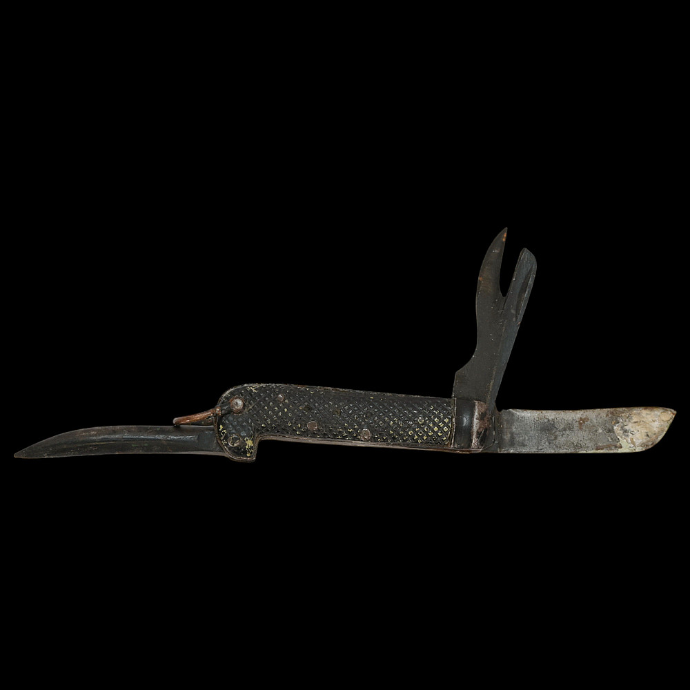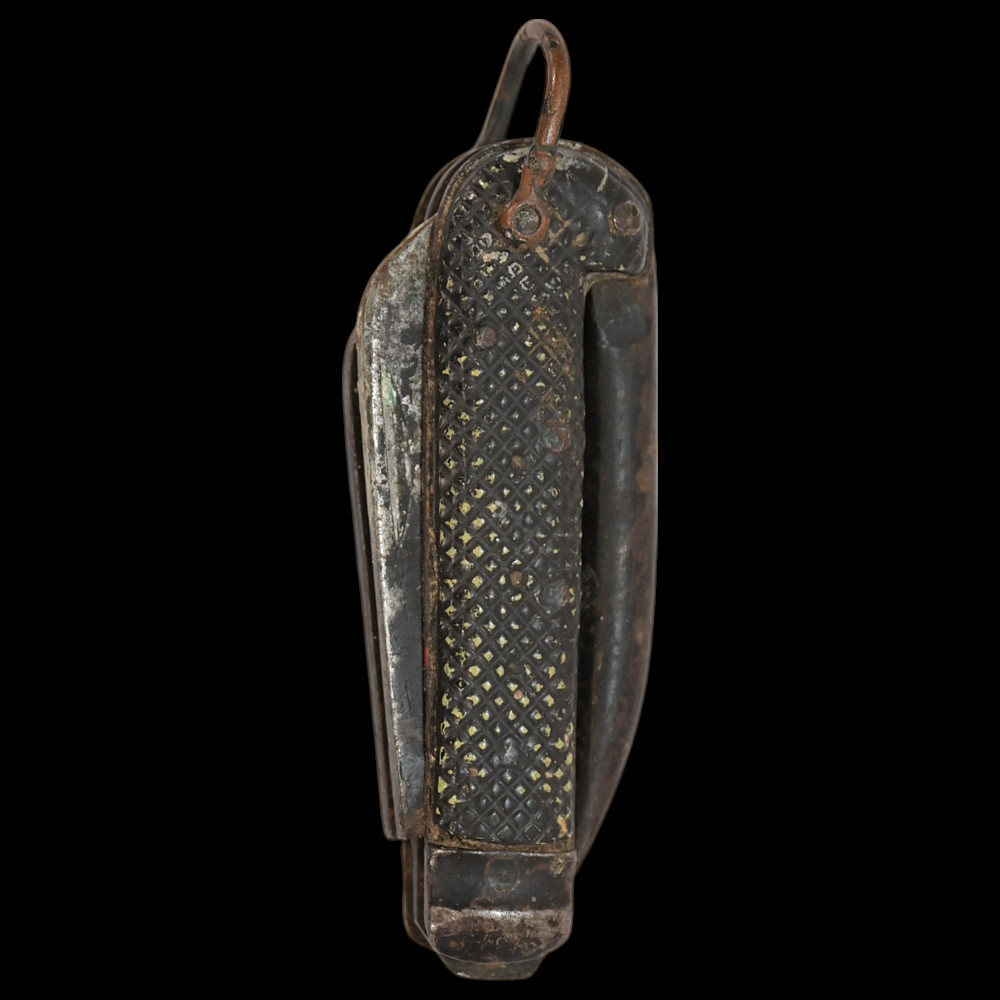 A nice example of a British WW2 Royal Navy, Pocket Jack Knife. The checkered Bakelite grip is intact and all the blades lock and close as they should. The steel can opener is in good condition. A wonderful collectible WWII artifact. Length 22 cm. Traces of use.