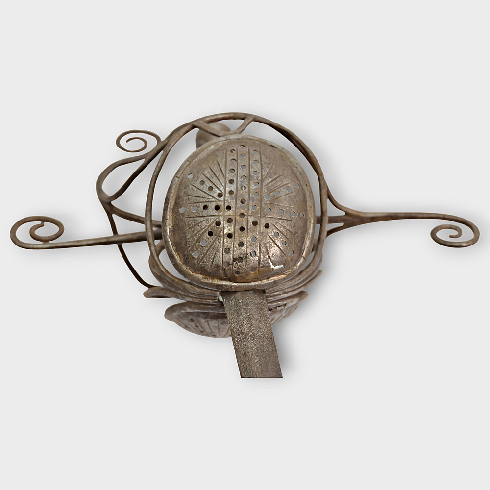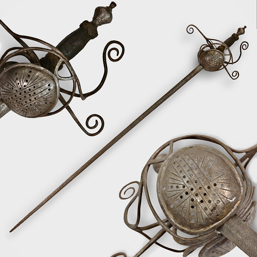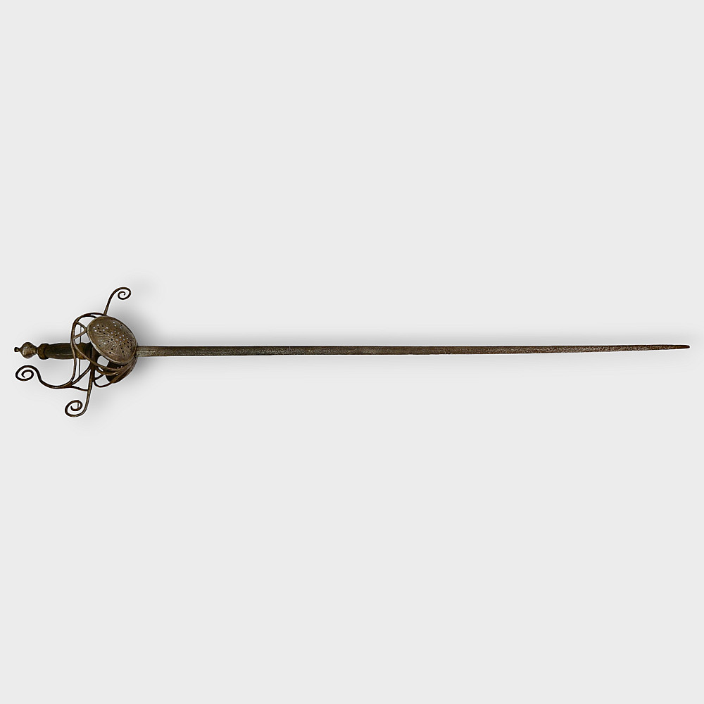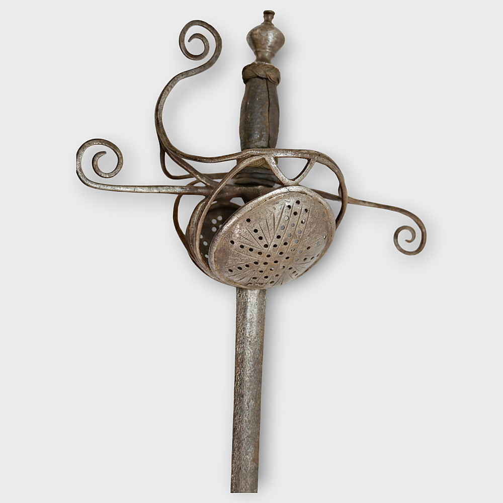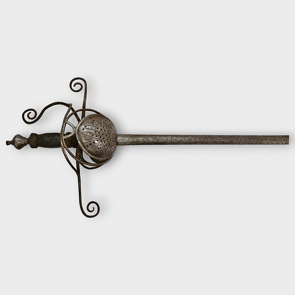 A original sword, Pappenheimer Style Rapier, North European, 1620 - 1640s. Steel straight, tapering blade, decorated with engraved decor in the form of a wave on each side. Characteristic hilt with iron looping bars and a iron pommel. Two convex plates that protect the hand are decorated with geometric patterns and holes. Wooden handle with remains of leather. A good collector's item with signs of time. The Pappenheimer-type rapier received its name in honor of the German Count Gottfried Heinrich von Pappenheim, commander-in-chief of the Catholic League troops in the Thirty Years' War. Possibly the Reitar regiments under his command were armed with weapons with this form of hilt. length 117 cm.