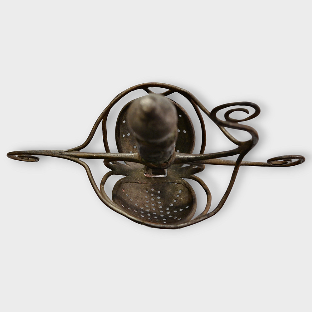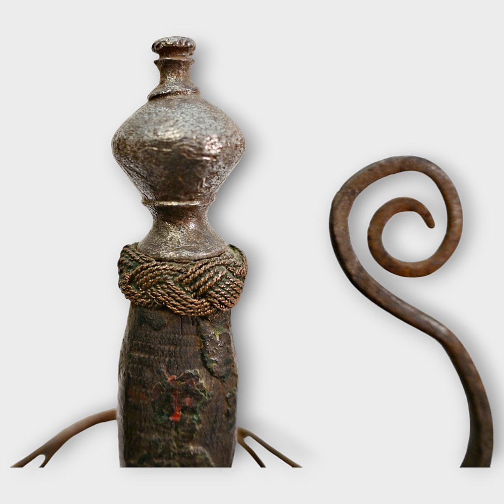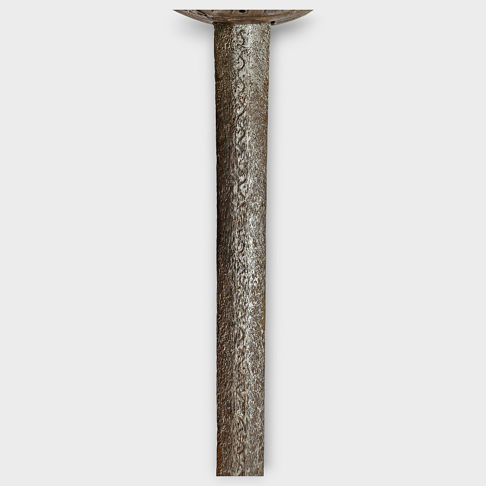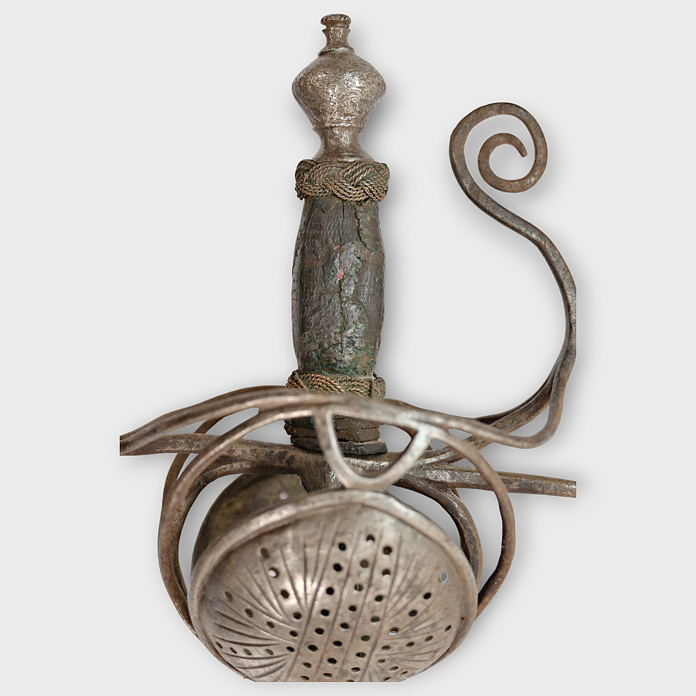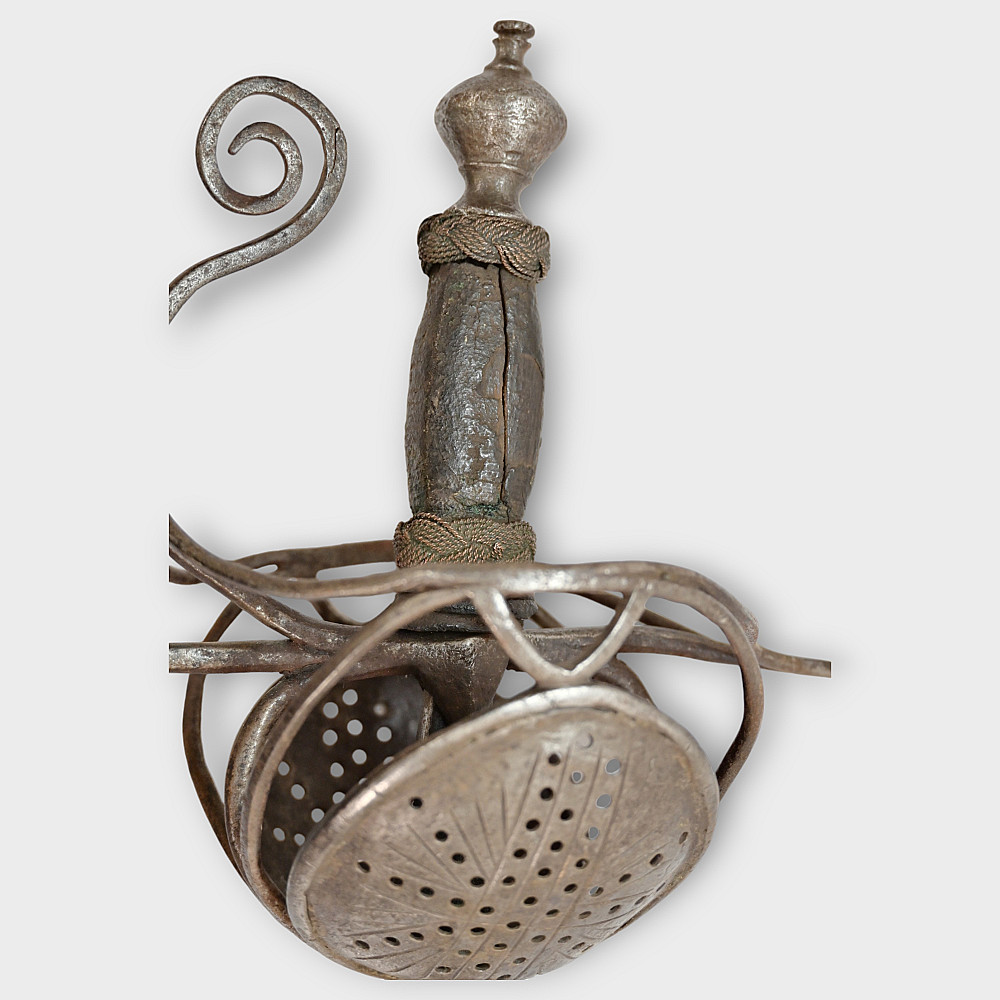 A original sword, Pappenheimer Style Rapier, North European, 1620 - 1640s. Steel straight, tapering blade, decorated with engraved decor in the form of a wave on each side. Characteristic hilt with iron looping bars and a iron pommel. Two convex plates that protect the hand are decorated with geometric patterns and holes. Wooden handle with remains of leather. A good collector's item with signs of time. The Pappenheimer-type rapier received its name in honor of the German Count Gottfried Heinrich von Pappenheim, commander-in-chief of the Catholic League troops in the Thirty Years' War. Possibly the Reitar regiments under his command were armed with weapons with this form of hilt. length 117 cm.