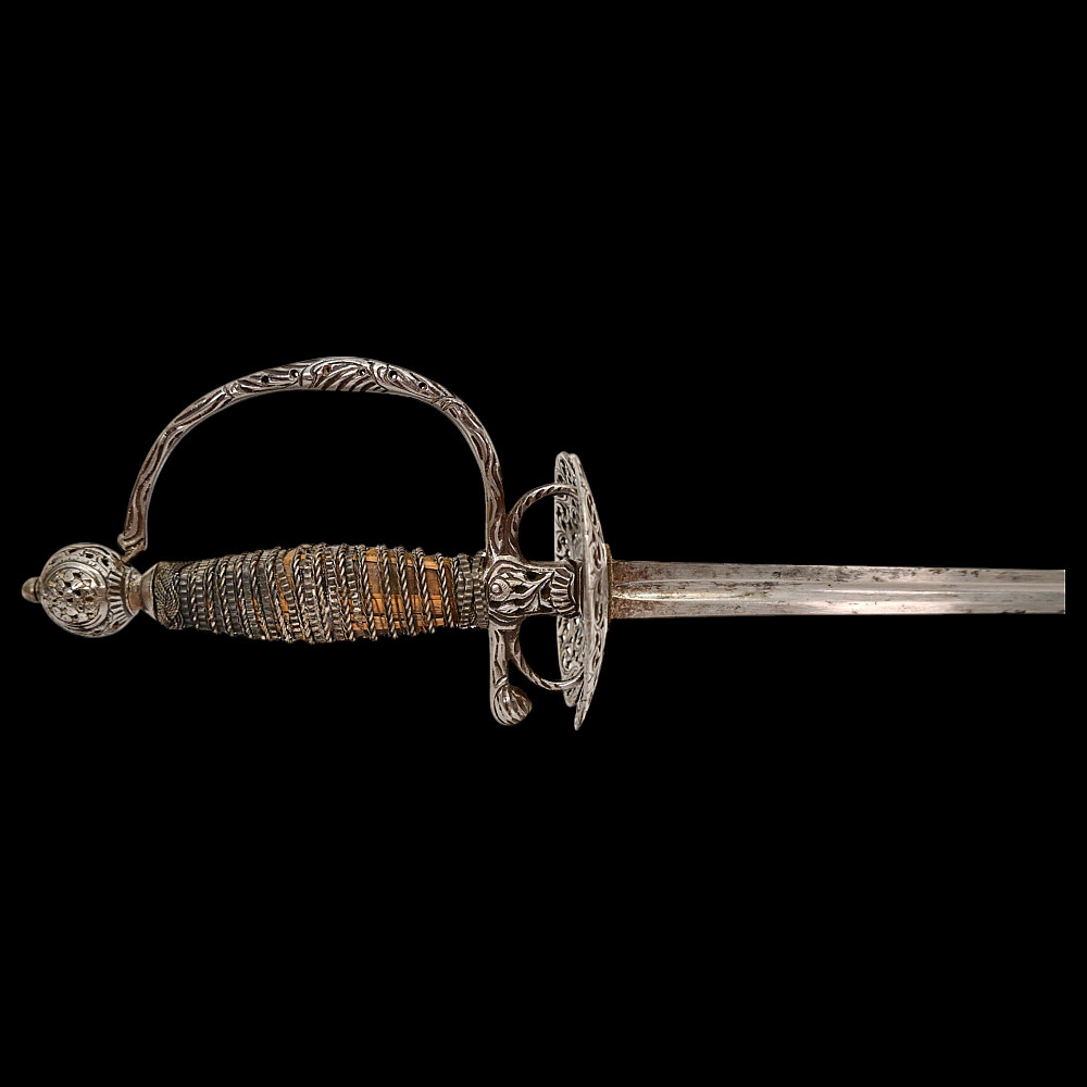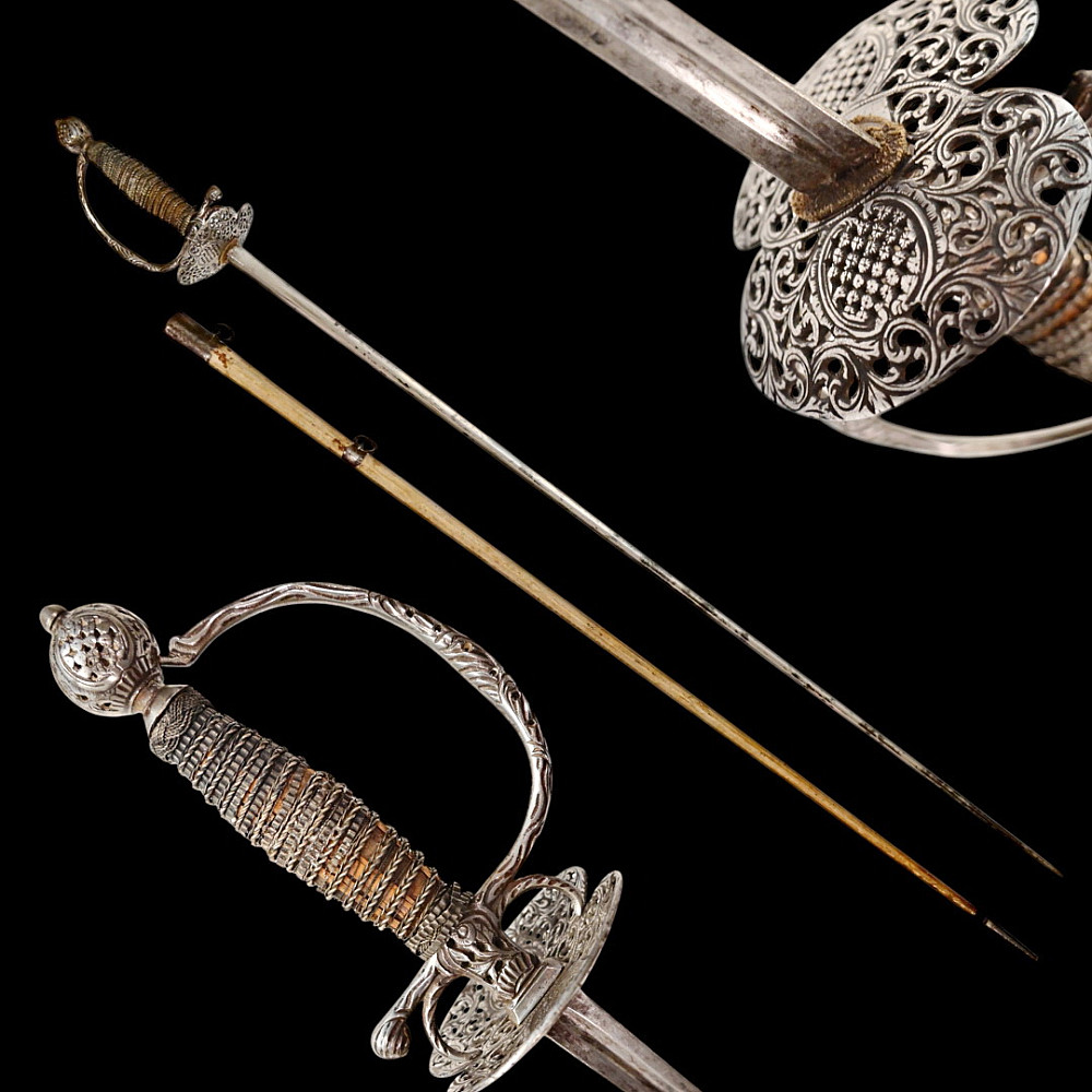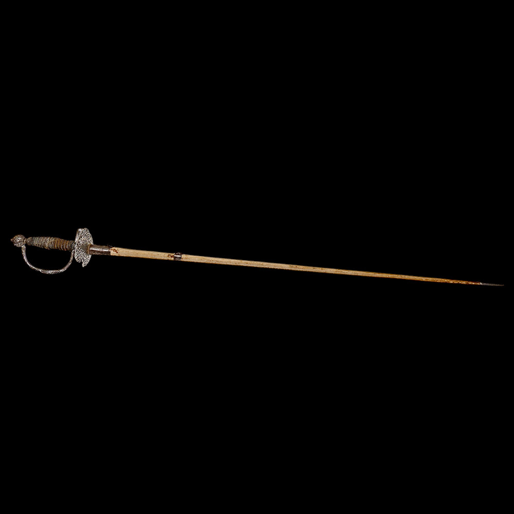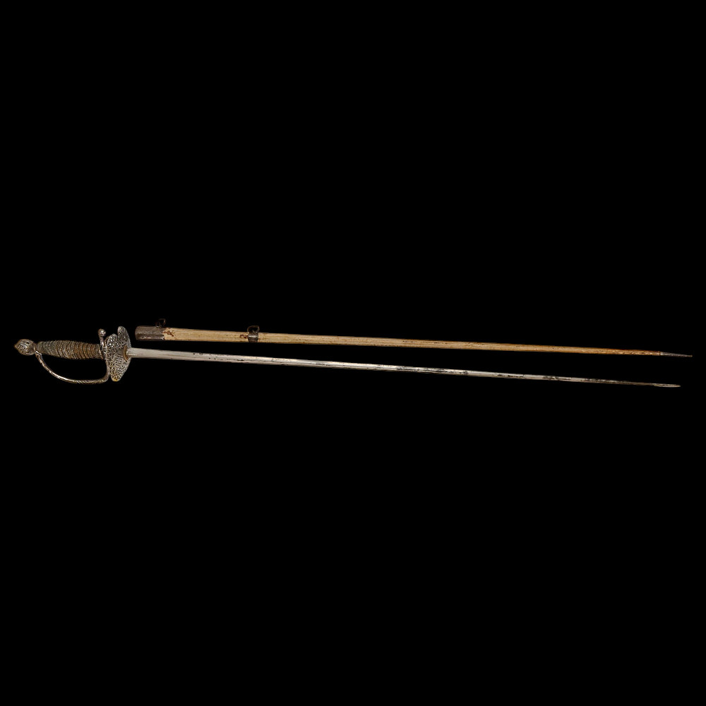 A Perfectly preserved Sword, Openwork steel, France, 18th century. The blade of the sword is steel, triangular with fullers on each side, tapering towards the end. The pommel is hollow with perforated ornament. The cup is also perforated with a plant ornament. Between the crosspiece and the cup there are two ring-shaped closed bows. Wooden handle, wrapped with wire and tape, upper and lower ring made of braided wire. The white scabbard with metal fittings is well preserved. A beautiful, high-quality sword for collecting in good condition. Length 106 cm.