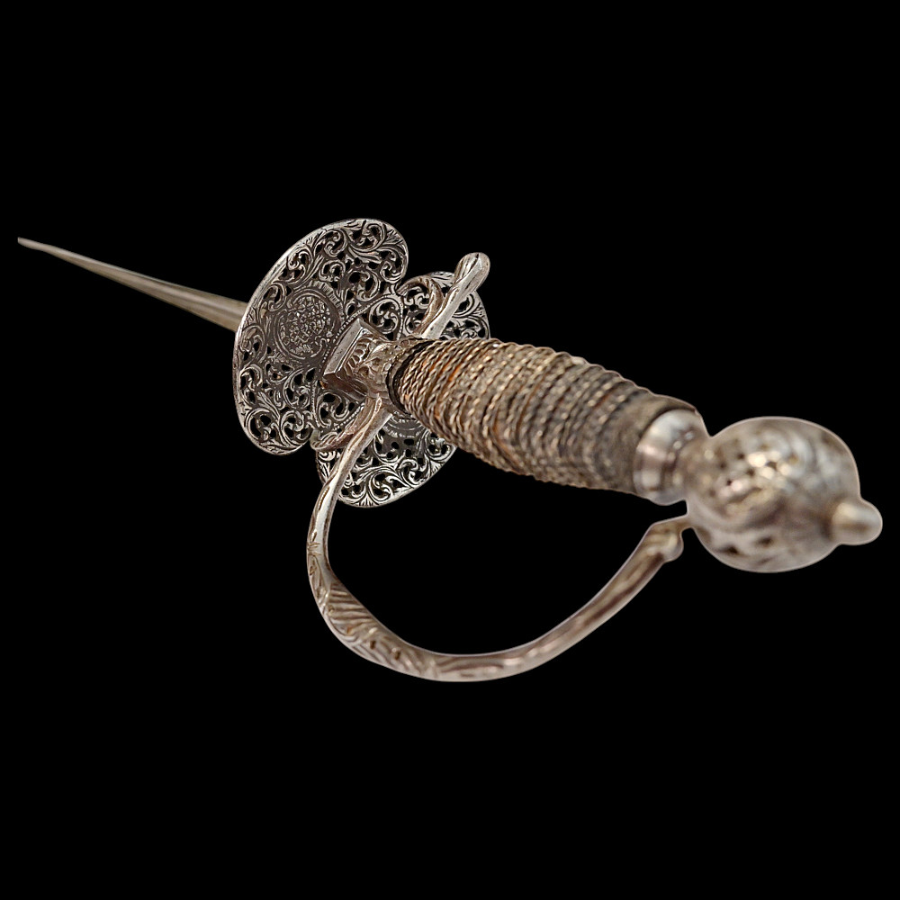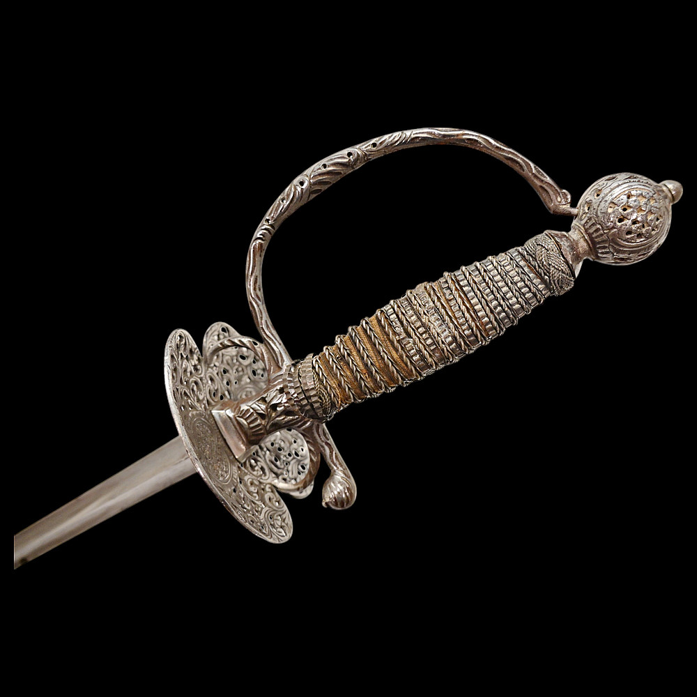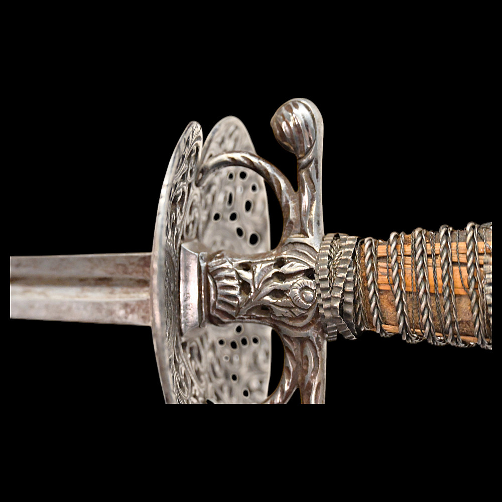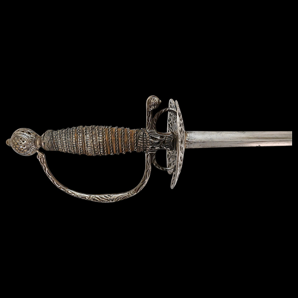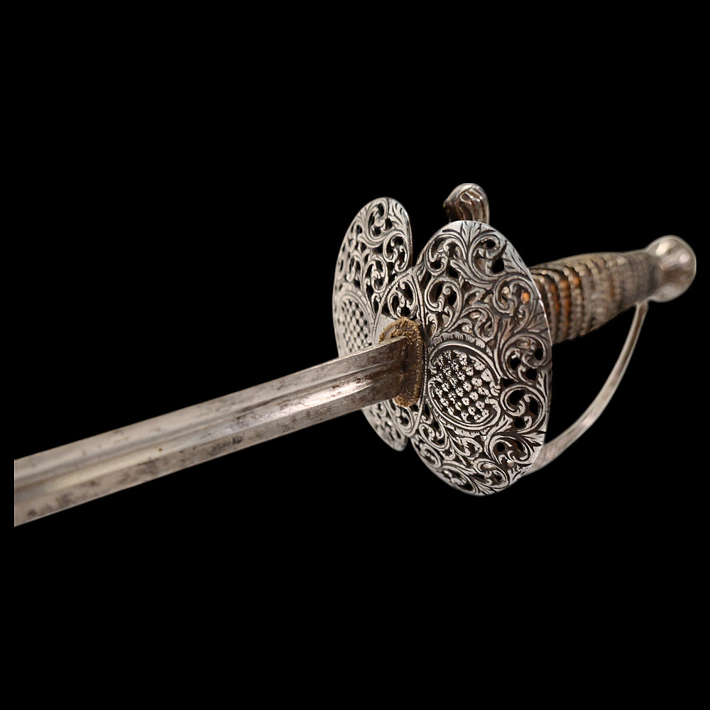 A Perfectly preserved Sword, Openwork steel, France, 18th century. The blade of the sword is steel, triangular with fullers on each side, tapering towards the end. The pommel is hollow with perforated ornament. The cup is also perforated with a plant ornament. Between the crosspiece and the cup there are two ring-shaped closed bows. Wooden handle, wrapped with wire and tape, upper and lower ring made of braided wire. The white scabbard with metal fittings is well preserved. A beautiful, high-quality sword for collecting in good condition. Length 106 cm.