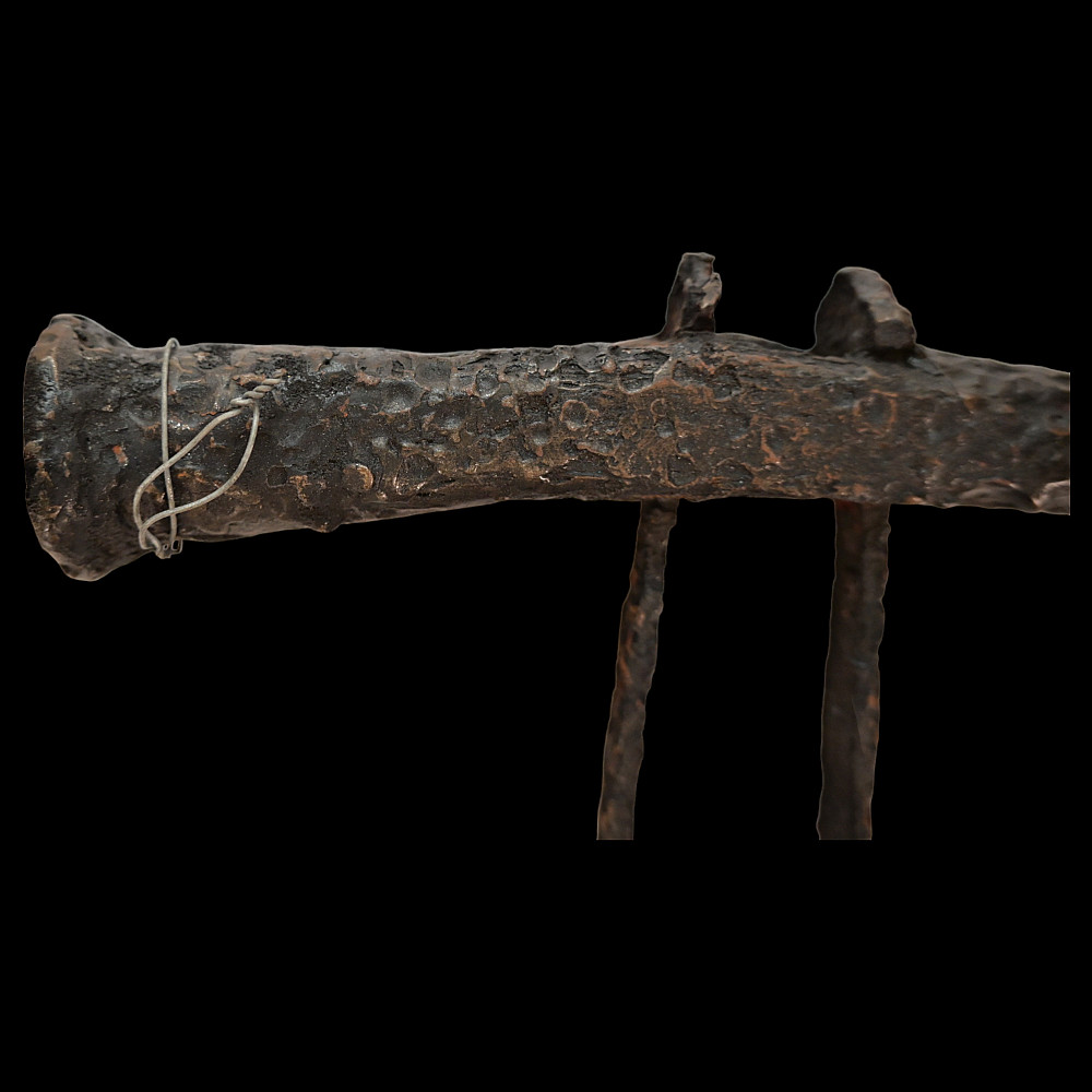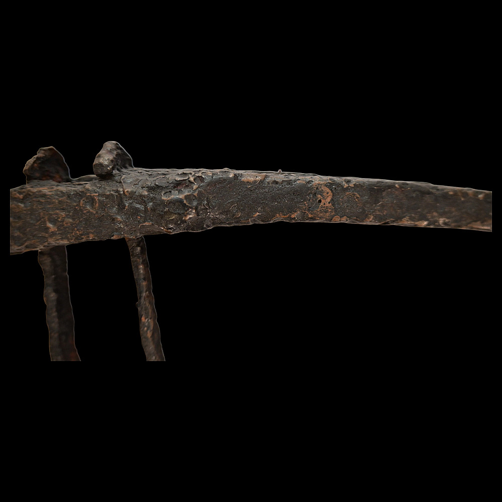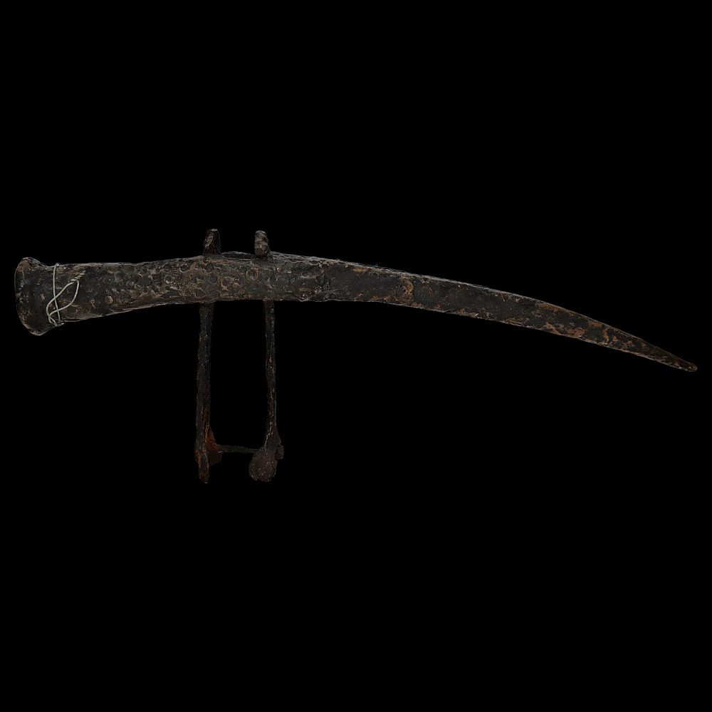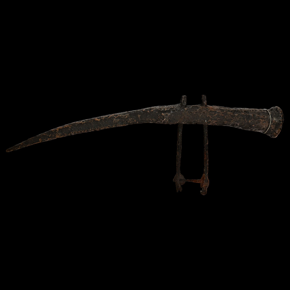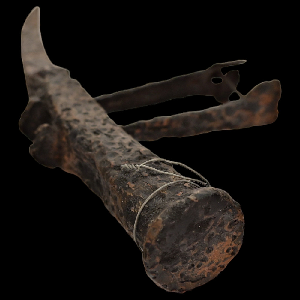 A Polish or Hungarian big war hammer, 16th century. A four-sided steel beak on one side and a round hammer on the other. In the middle part of the hammer there is a hole and two plates for attaching to the shaft. Length 29 cm.