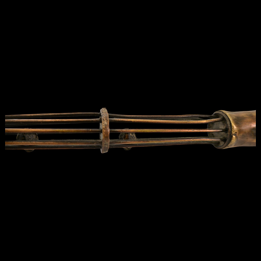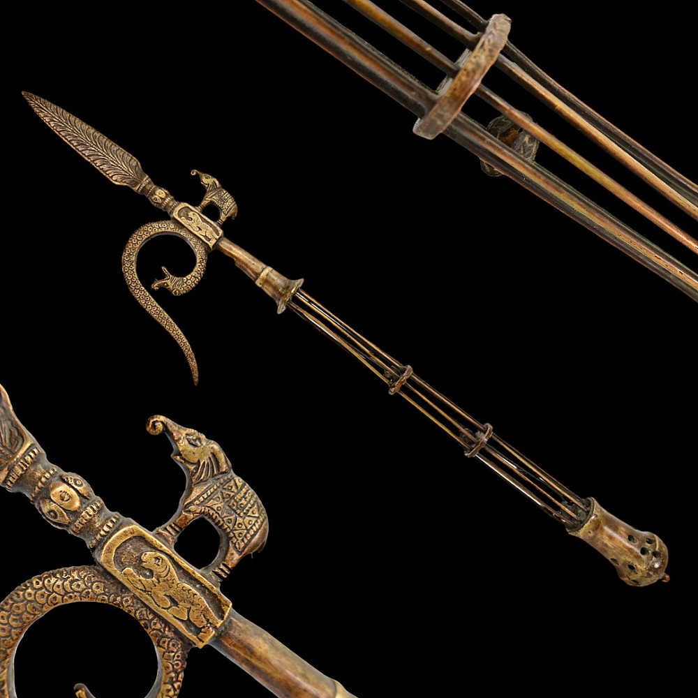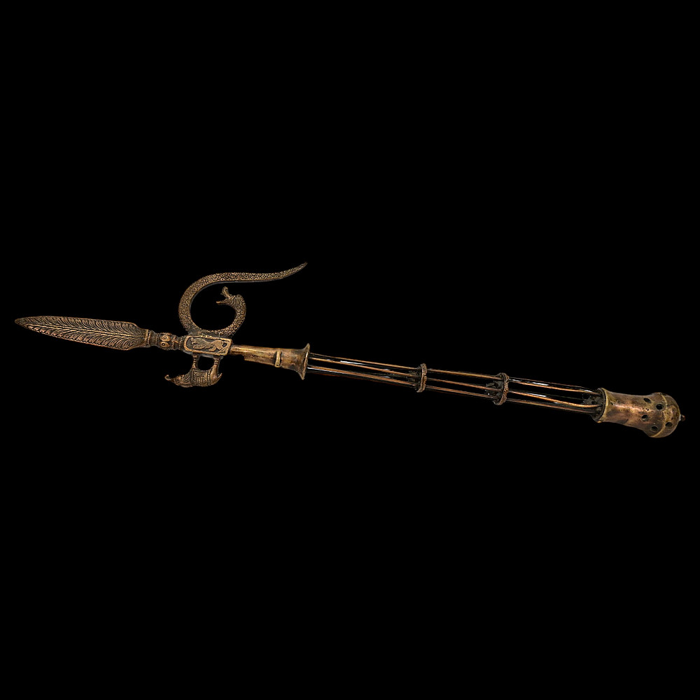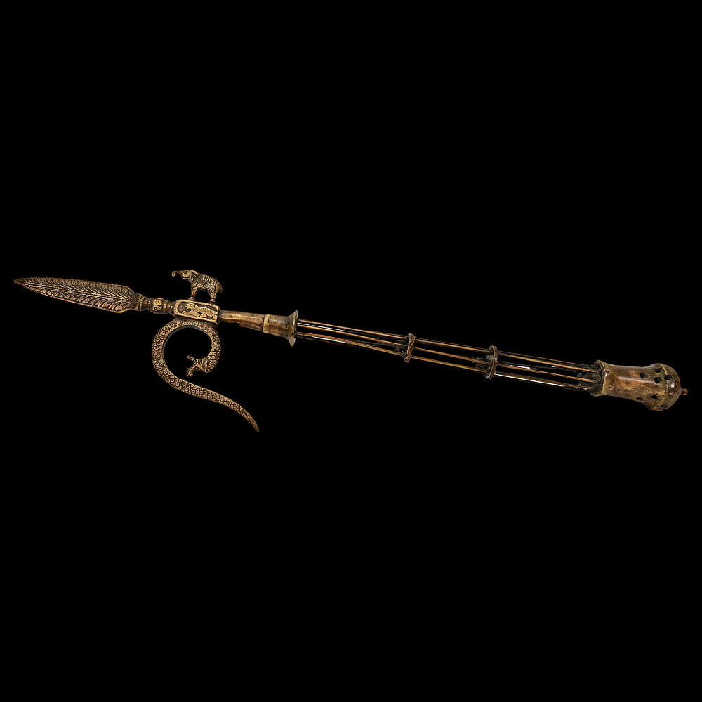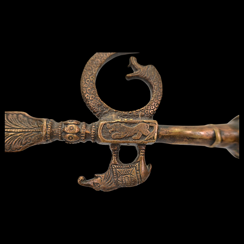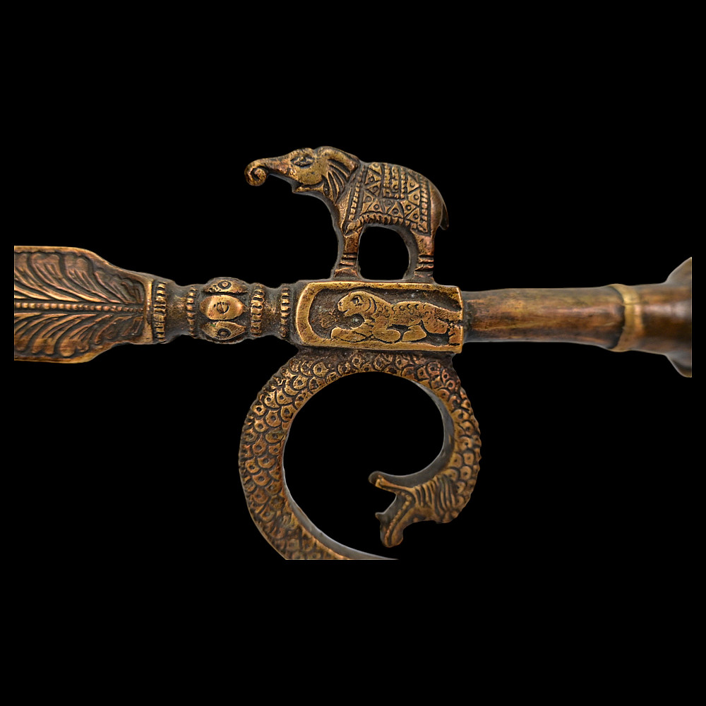 A rare Indian bronze open work elephant goad or ankus, 19th century. The openwork bronze shaft of rare shape with small bells inside. In the upper part, there is a thorn in the shape of a leaf. The hook is made in the shape of a snake, opposite is a figurine of an elephant. A rare form of Ankus in collectible condition. Good condition. Length 56 cm.