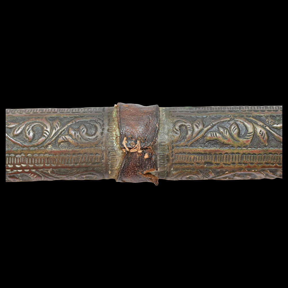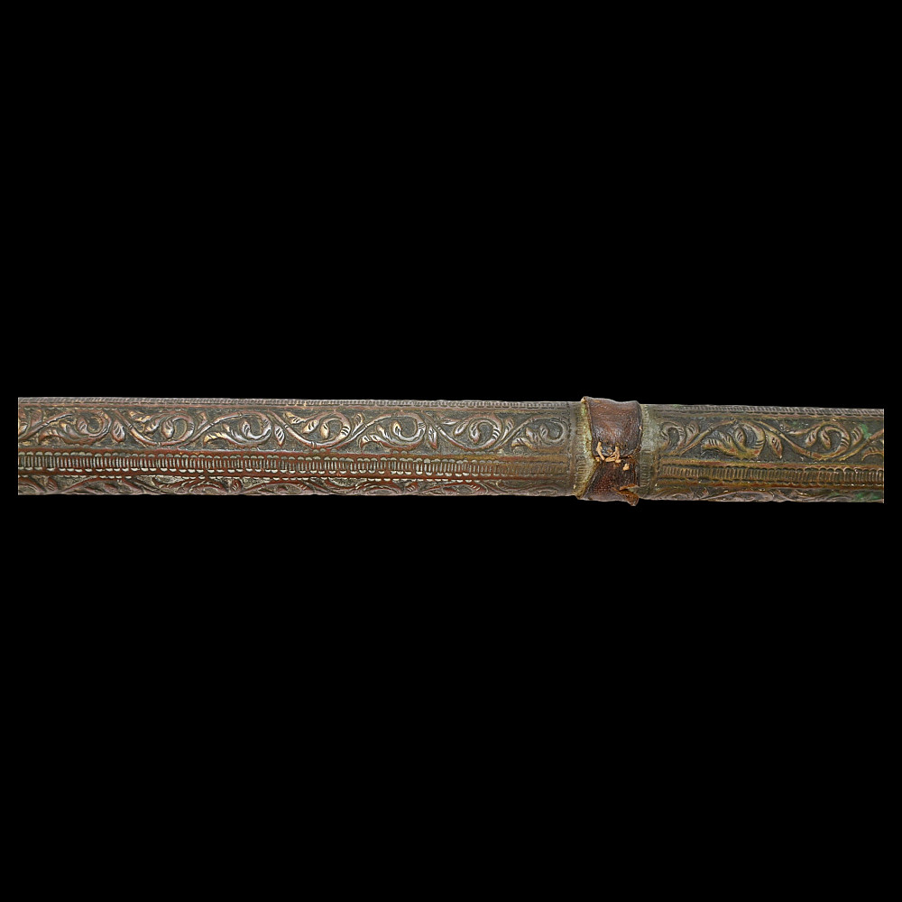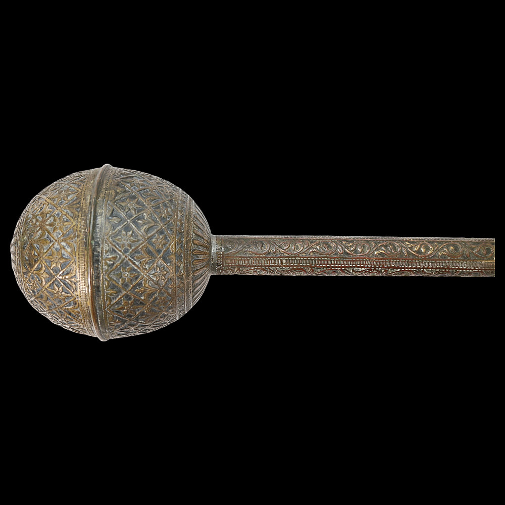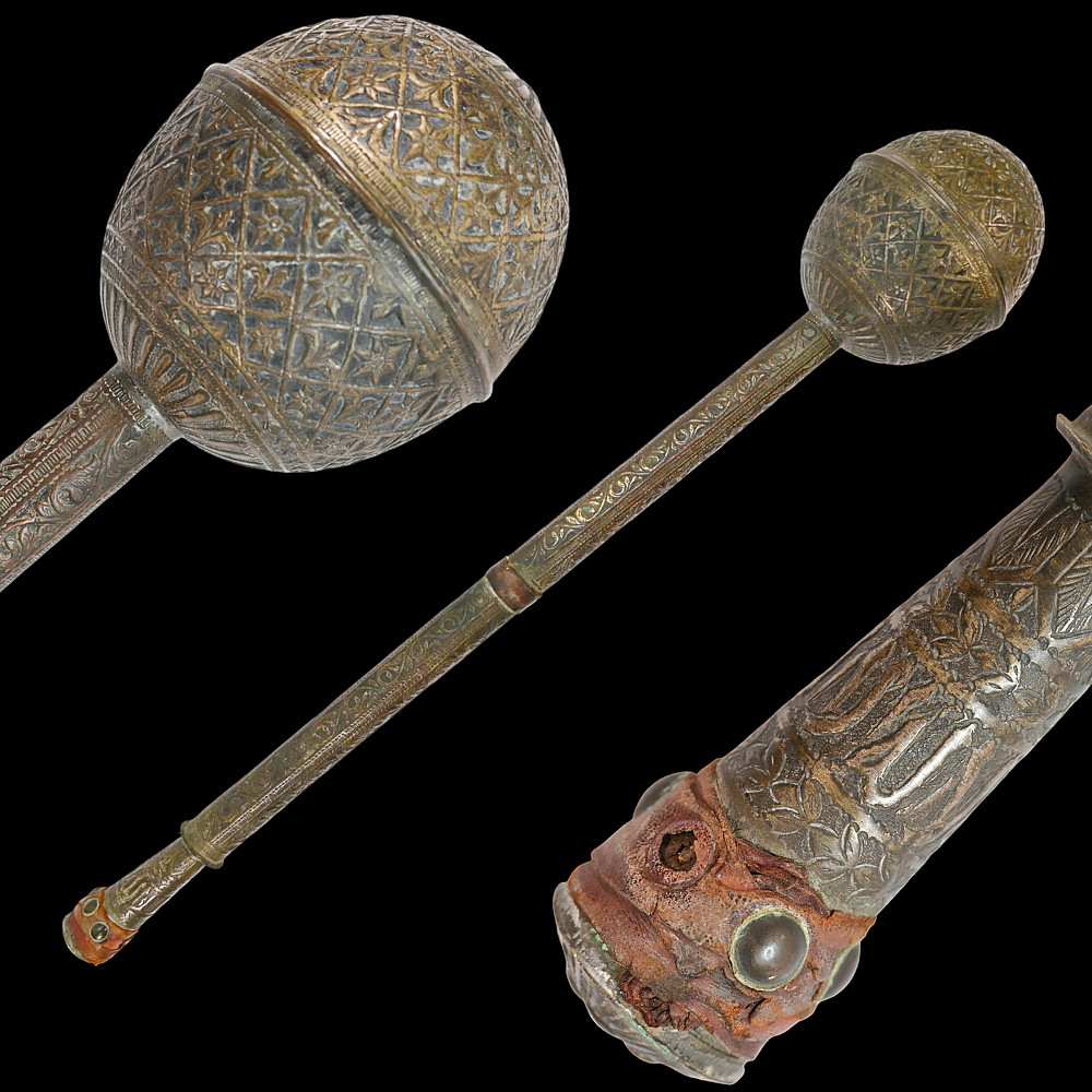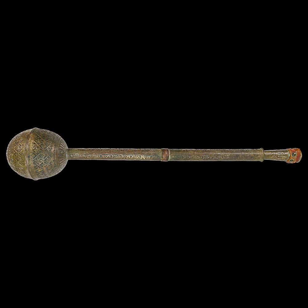 A Rare, Islam, decorated mace, large size, Indo-Persian region, 18th century. The entire surface is richly decorated with floral and geometric designs, made with high-quality embossing. There are descriptions in Arabic on the handle. There is a leather wrap at the end of the handle. Rare collector's item in good condition. Length 74 cm.