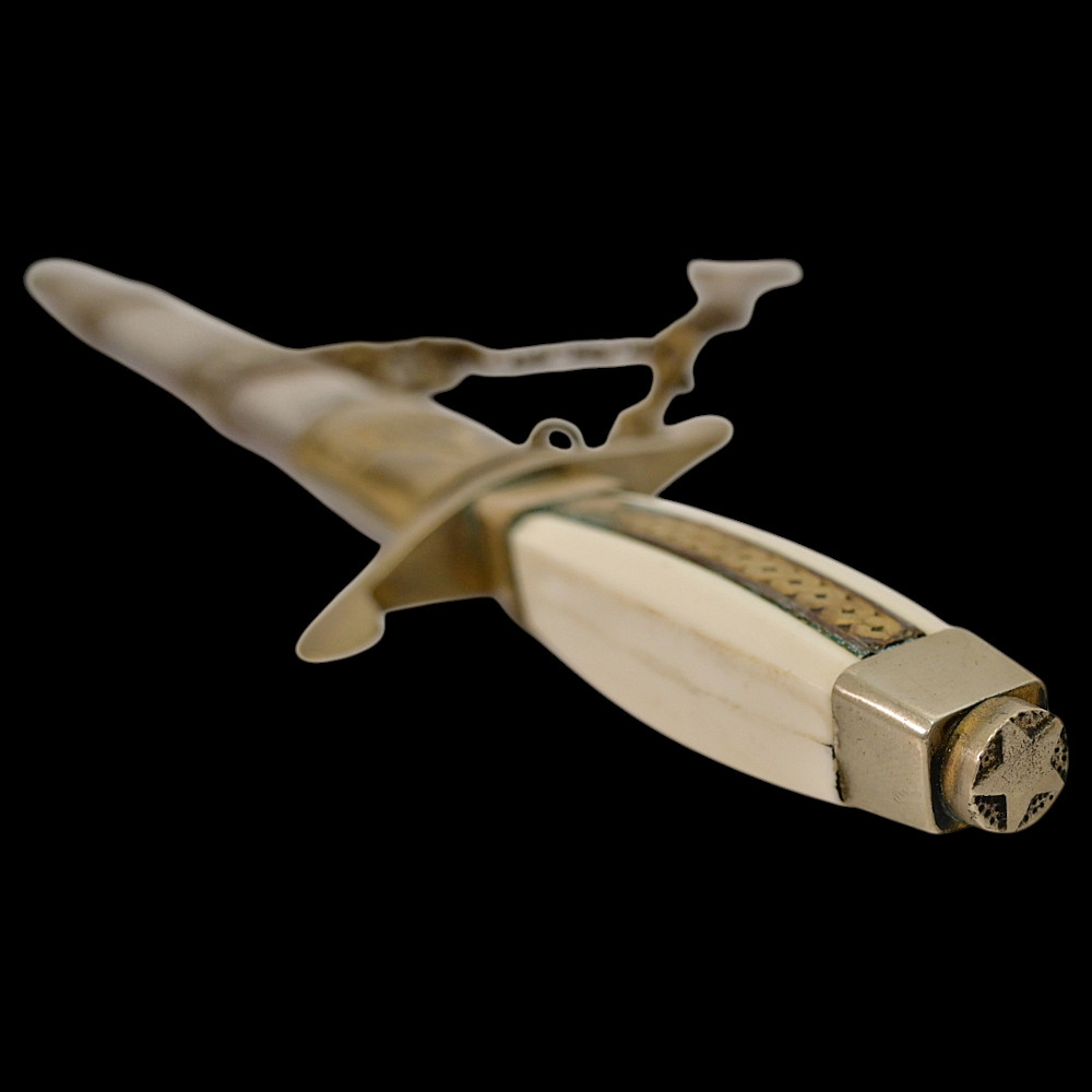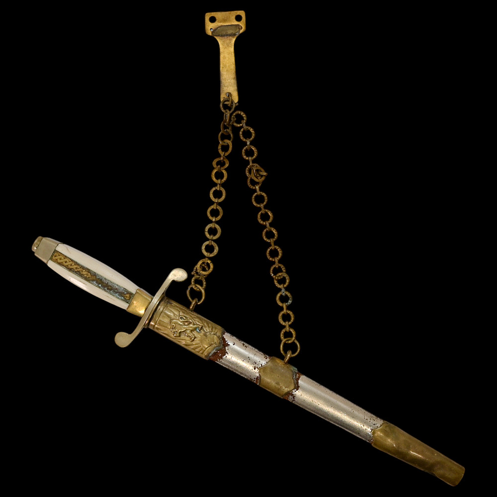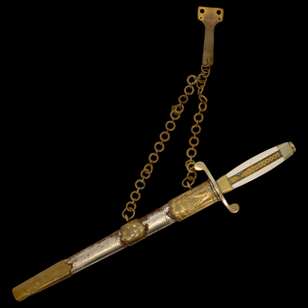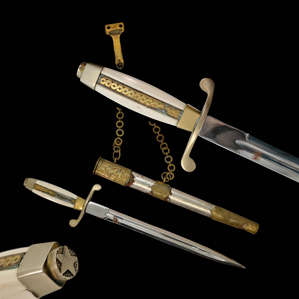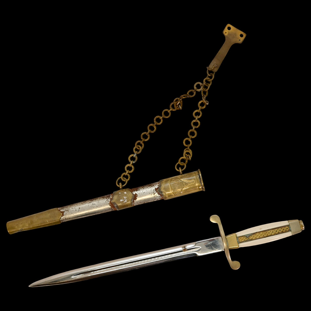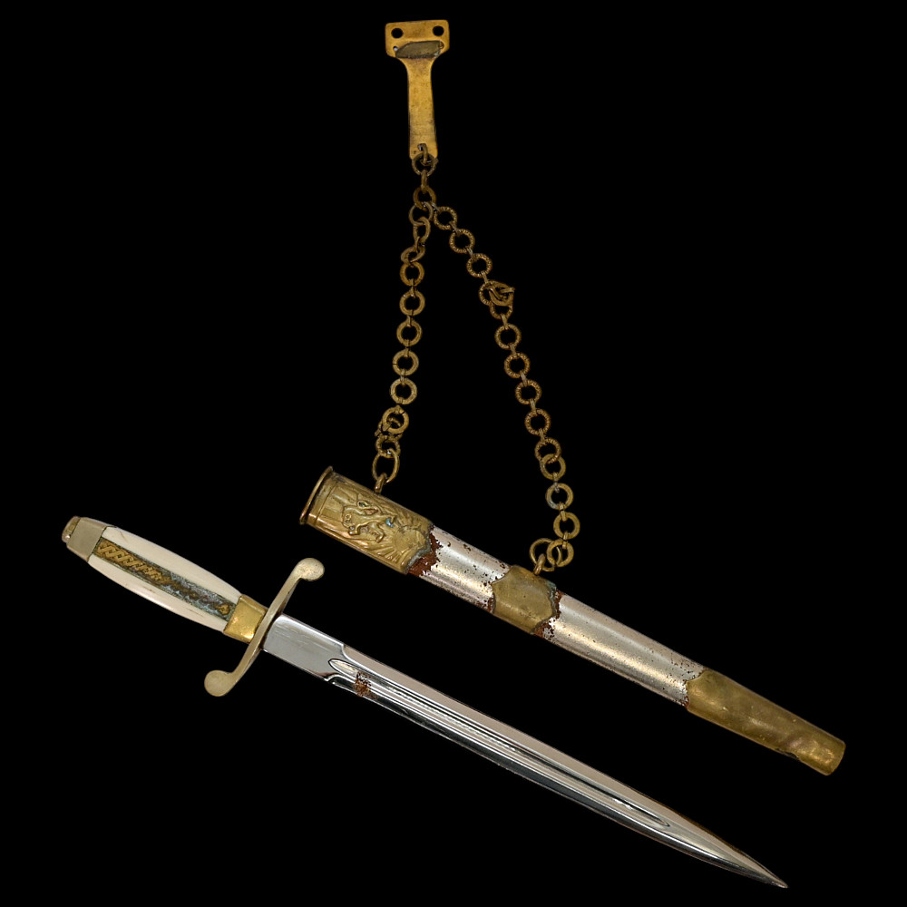 A Rare Military Dagger, Model 1951 — People’s Republic of Bulgaria. A rare Bulgarian Military Dagger, Model 1951, complete with its original scabbard and suspension chain. This dagger was the official ceremonial sidearm of officers of the Bulgarian People’s Army during the early Cold War period. The dagger features a straight, double-edged, polished steel blade. The crossguard and pommel are brass, the latter bearing a five-pointed star. The grip is composed of ivory-colored plastic panels inlaid with a decorative braid running along the centerline, typical of the 1951 pattern. The scabbard is metal, decorated with relief motifs including the Bulgarian lion on the upper fitting, and retains the original chain hanger with brass links and belt clip. This model was introduced in 1951 and remained in ceremonial use throughout the 1950s–1980s by officers of all service branches (Army, Navy, and Air Force) of the People’s Republic of Bulgaria. Today, these daggers are sought-after examples of early Eastern Bloc military design, combining Soviet stylistic influence with distinctive national elements. Хорошее состояние. Length: approx. 35 cm.