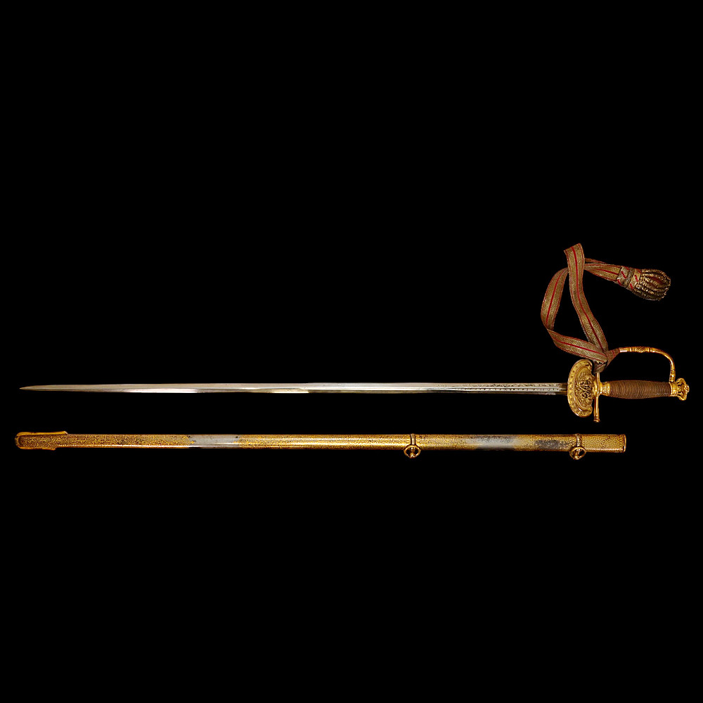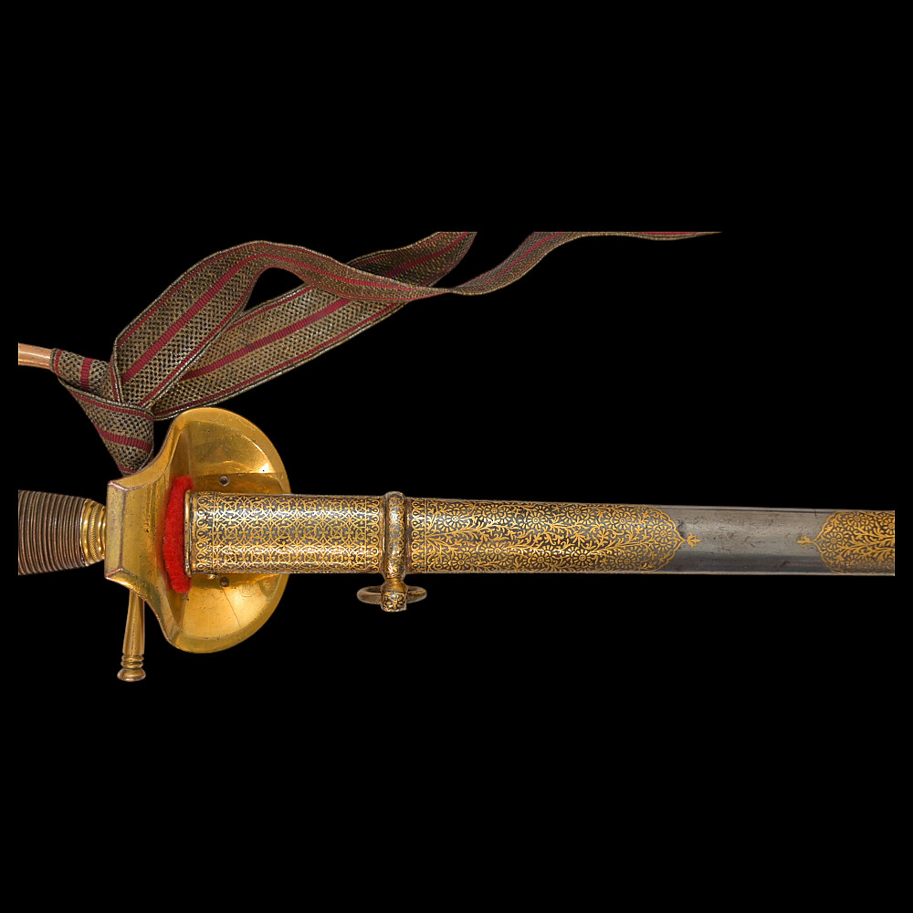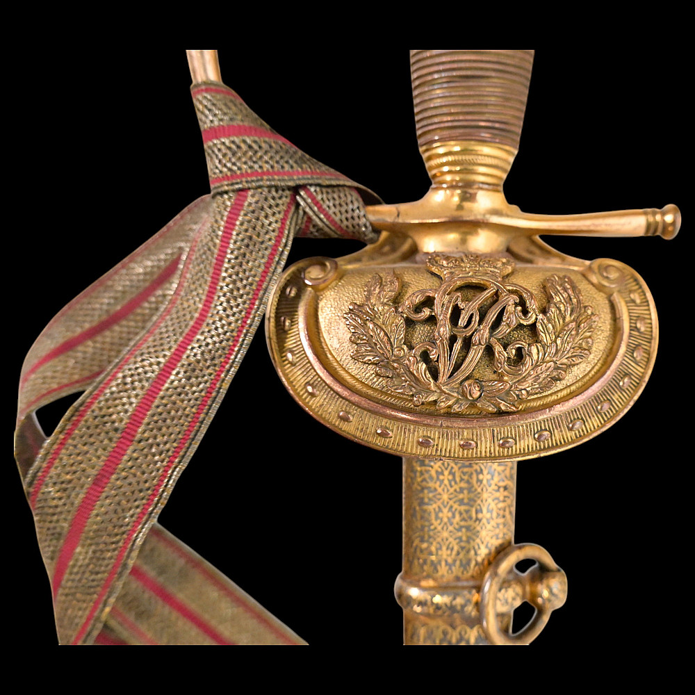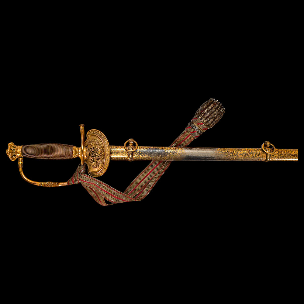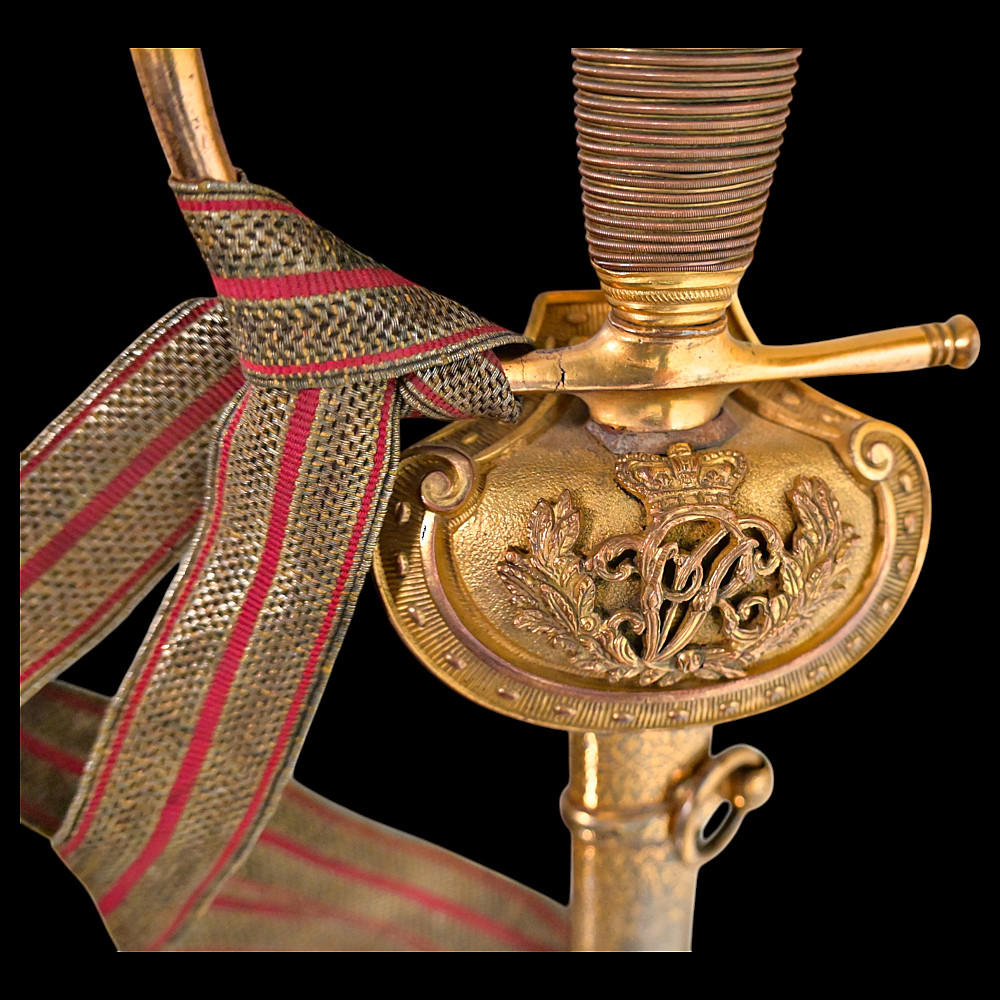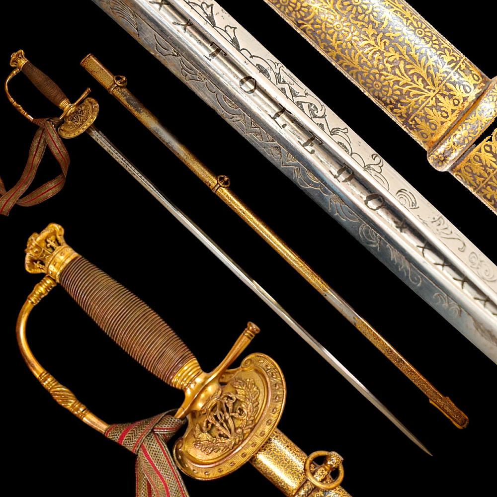 A rare officer's sword with a Spanish blade and gold scabbard decoration, sword knot, Britain 19th С. Officers sword, hilt with gilt crown finial, shell form quillon with Queen Victoria monogram and laurel leaves. Straight, double-edged blade of hexagonal section, a fuller at the forte, marked "TOMAS AVALUA" probably an imitation of the famous 17th century Spanish bladesmith TOMAS AIALA. On the other side of the blade is the inscription TOLEDO. The blade was probably made in the 18th century. Steel scabbard with unique decor made to order. The surface of the scabbard is covered with an elegant gold inlay in the form of an exquisite plant ornament. Sword knot included. A very rare item for collectors of weapons in excellent condition. Length 97 cm.