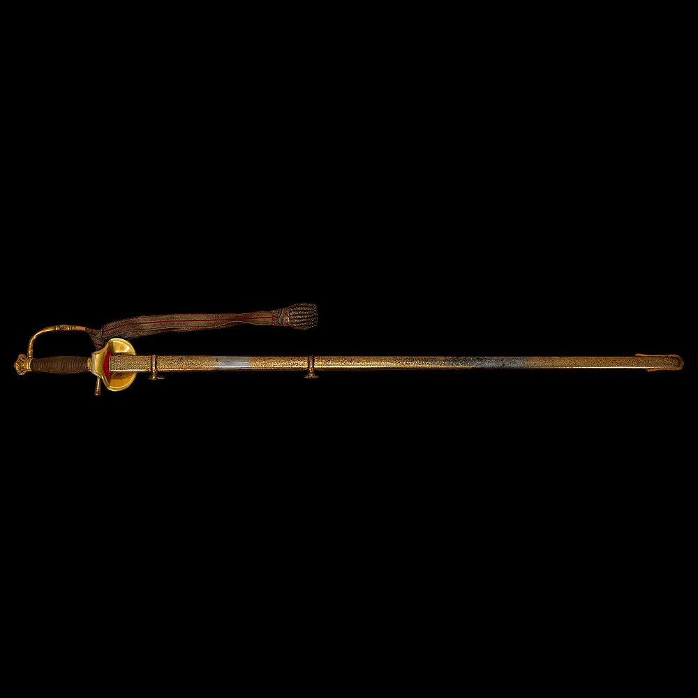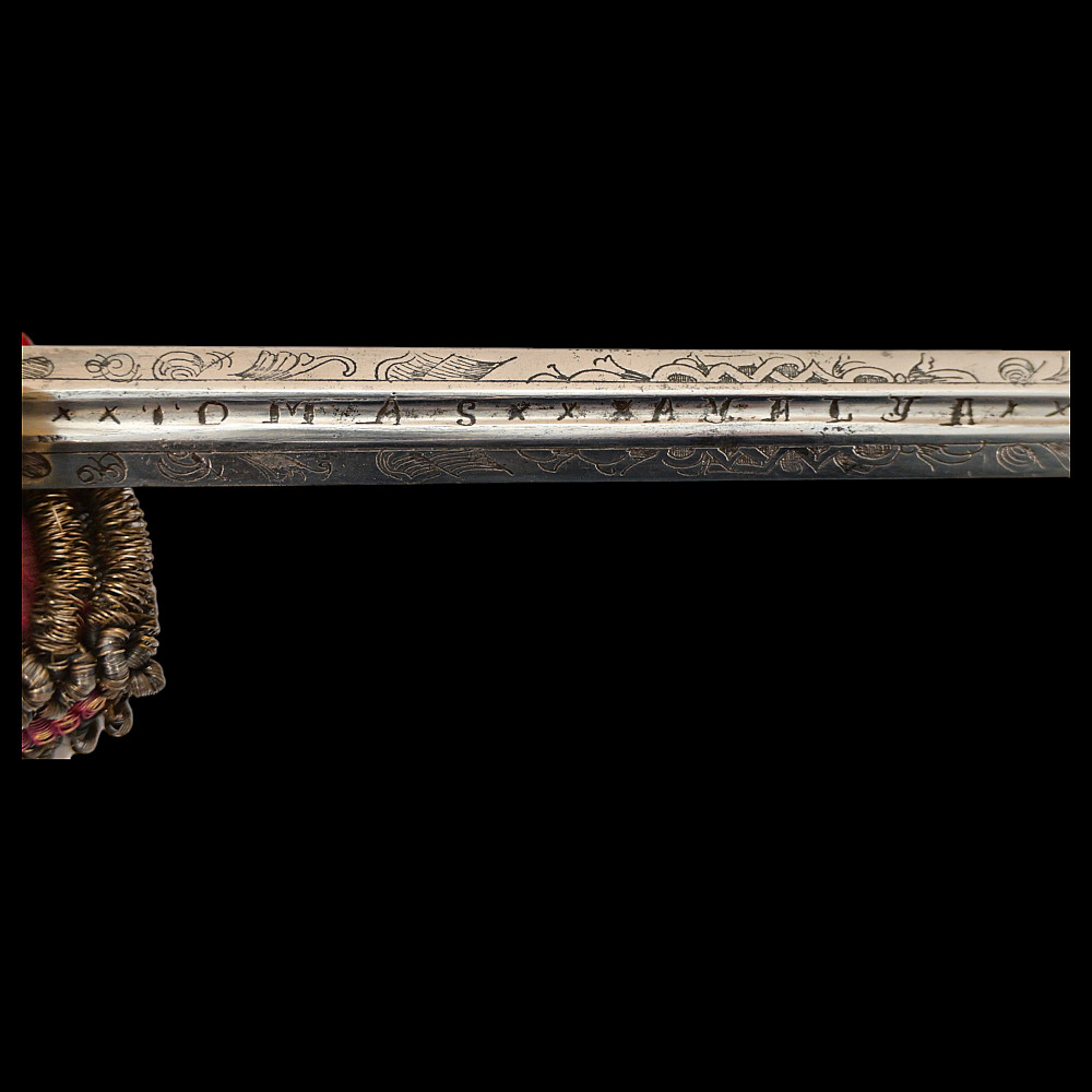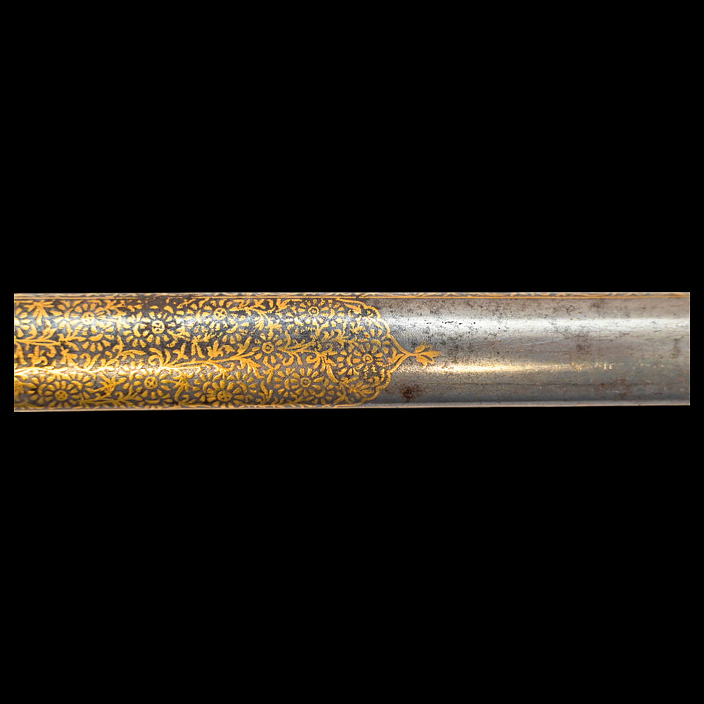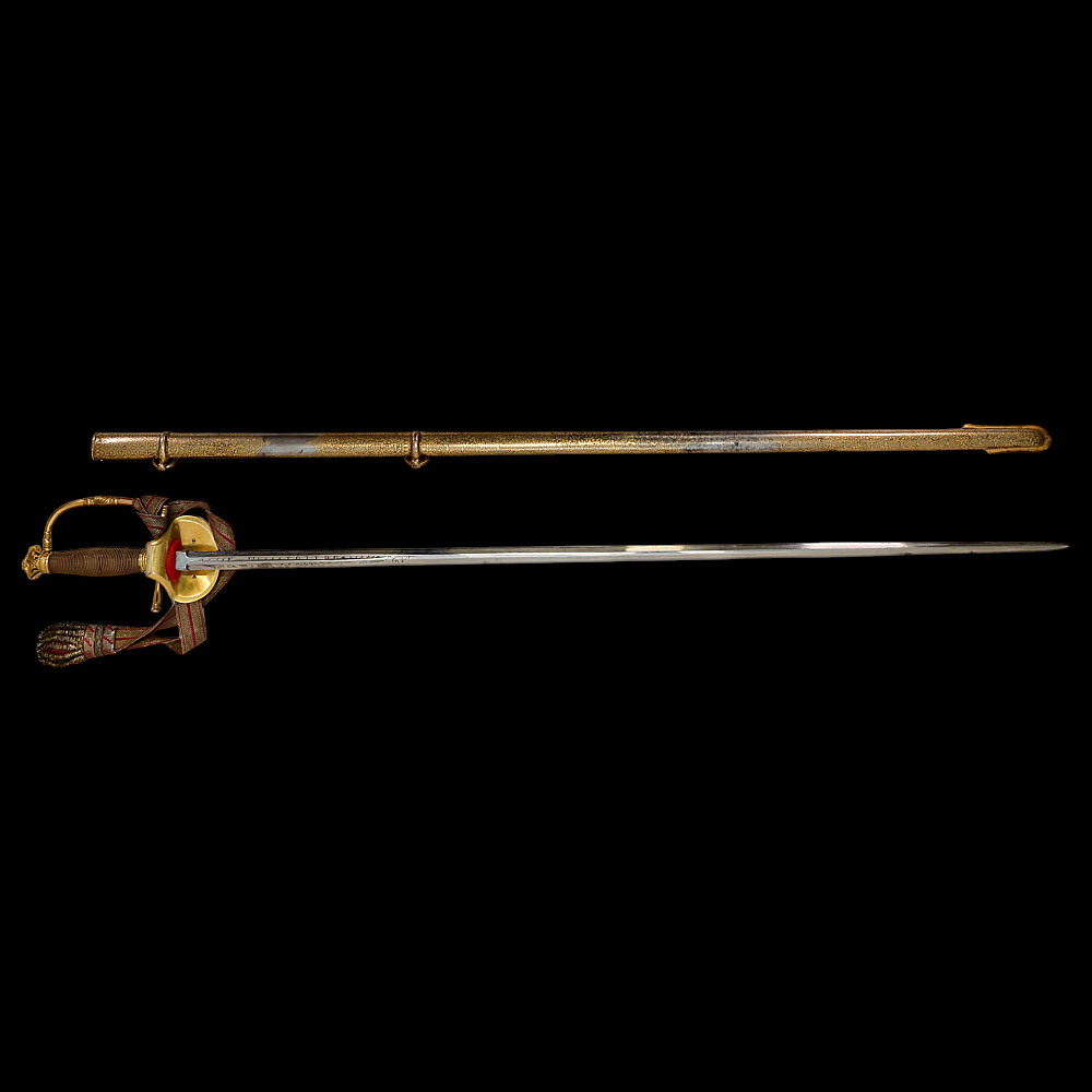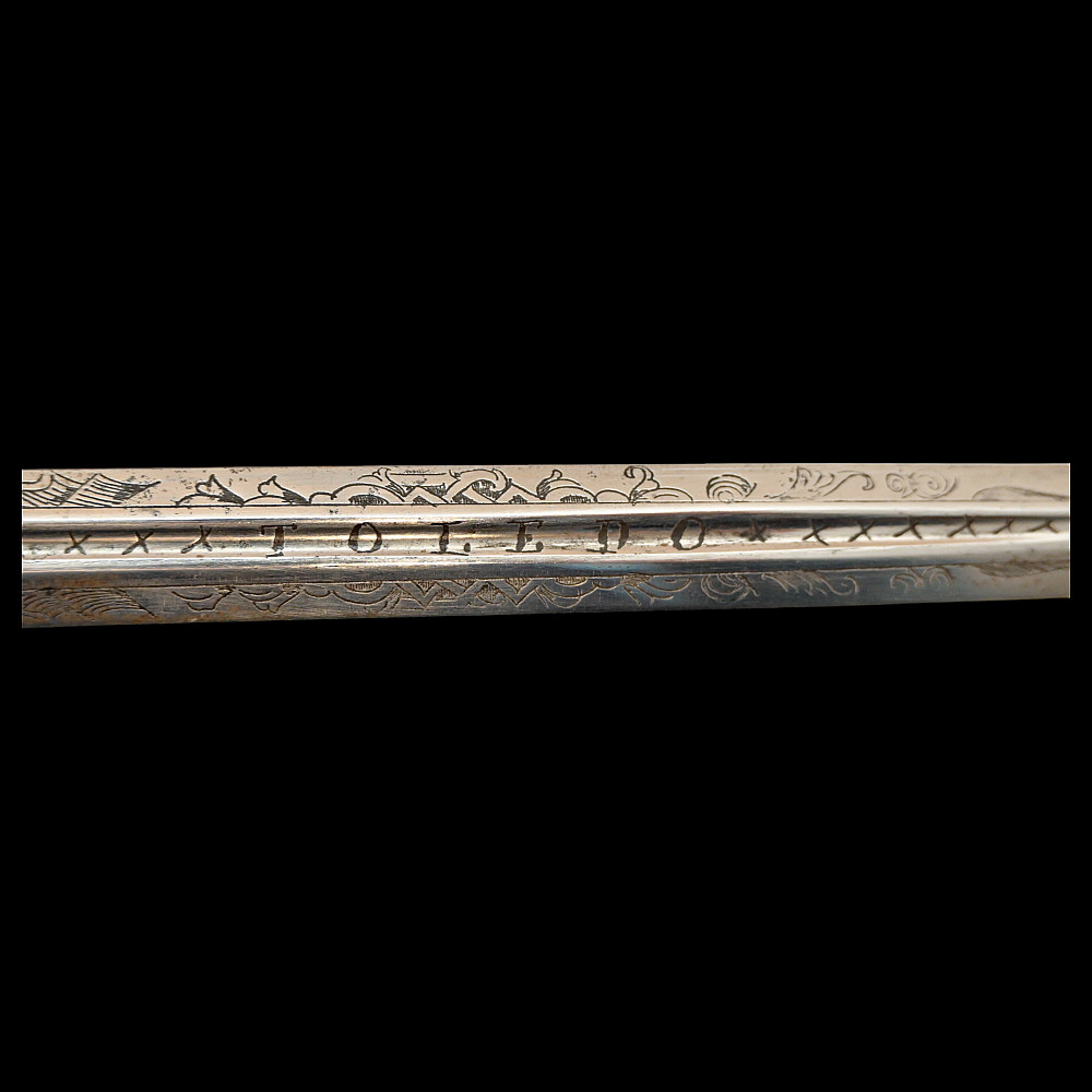 A rare officer's sword with a Spanish blade and gold scabbard decoration, sword knot, Britain 19th С. Officers sword, hilt with gilt crown finial, shell form quillon with Queen Victoria monogram and laurel leaves. Straight, double-edged blade of hexagonal section, a fuller at the forte, marked "TOMAS AVALUA" probably an imitation of the famous 17th century Spanish bladesmith TOMAS AIALA. On the other side of the blade is the inscription TOLEDO. The blade was probably made in the 18th century. Steel scabbard with unique decor made to order. The surface of the scabbard is covered with an elegant gold inlay in the form of an exquisite plant ornament. Sword knot included. A very rare item for collectors of weapons in excellent condition. Length 97 cm.
