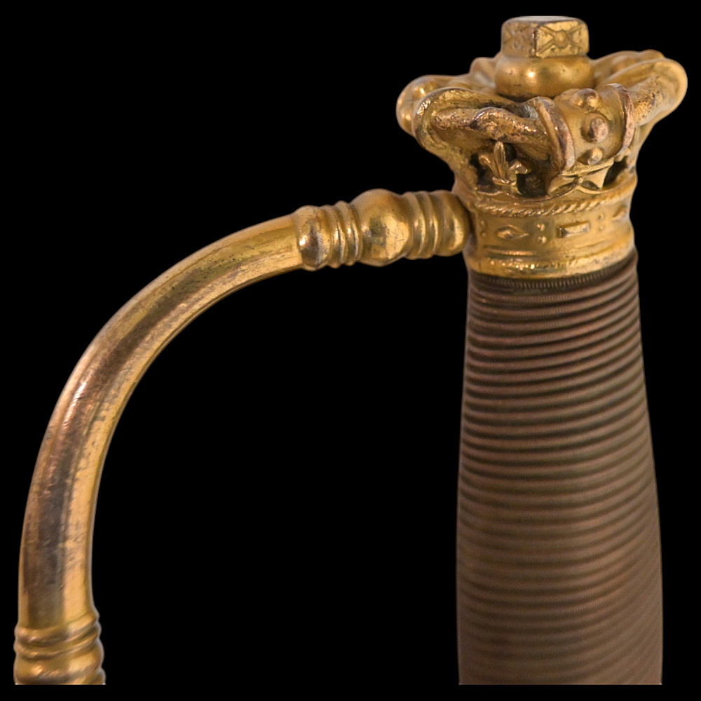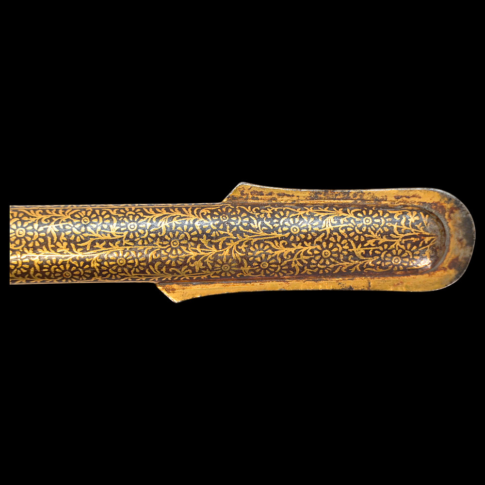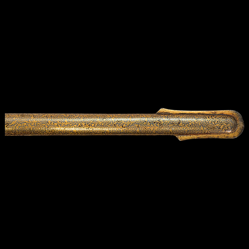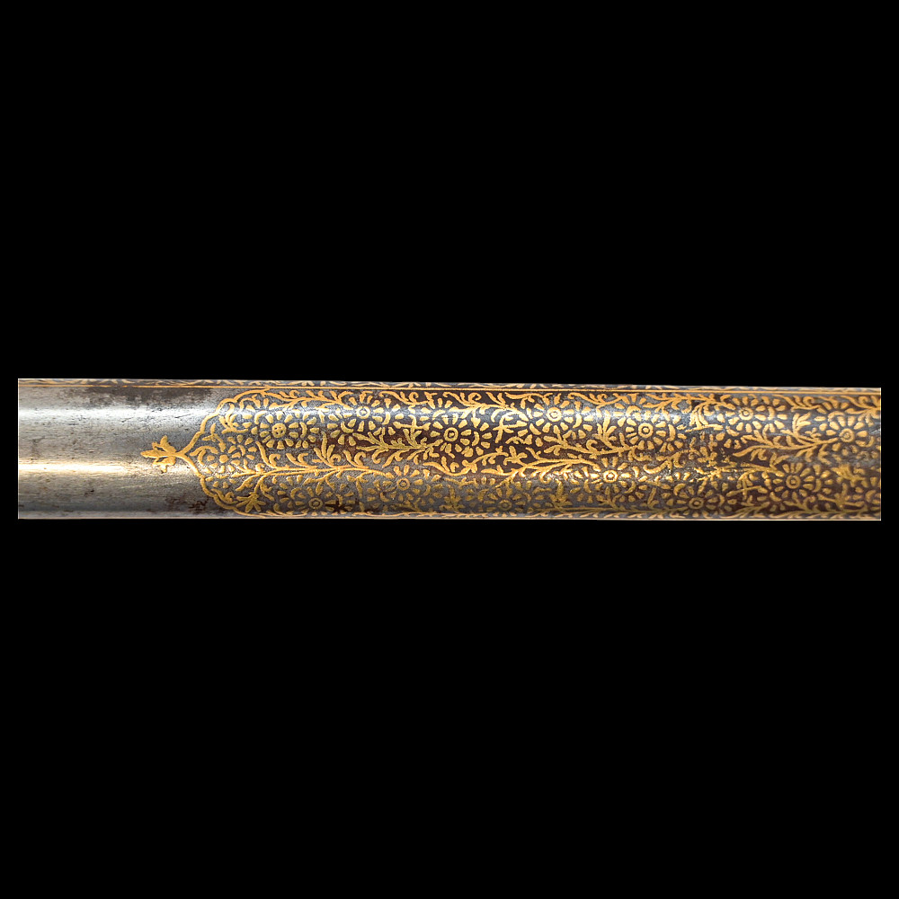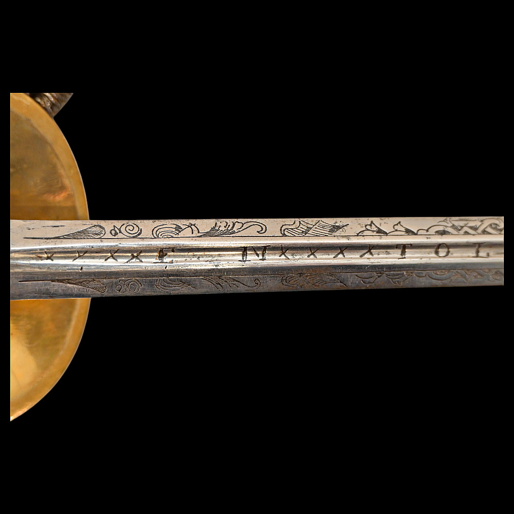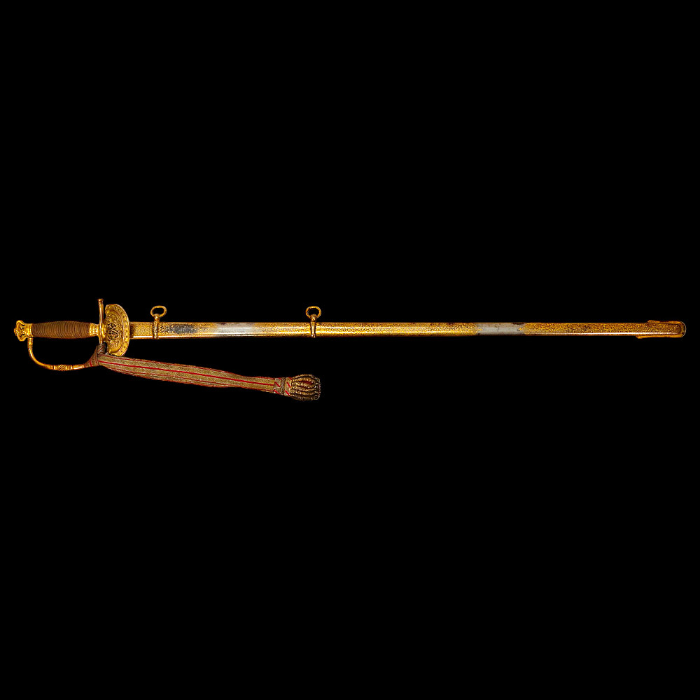 A rare officer's sword with a Spanish blade and gold scabbard decoration, sword knot, Britain 19th С. Officers sword, hilt with gilt crown finial, shell form quillon with Queen Victoria monogram and laurel leaves. Straight, double-edged blade of hexagonal section, a fuller at the forte, marked "TOMAS AVALUA" probably an imitation of the famous 17th century Spanish bladesmith TOMAS AIALA. On the other side of the blade is the inscription TOLEDO. The blade was probably made in the 18th century. Steel scabbard with unique decor made to order. The surface of the scabbard is covered with an elegant gold inlay in the form of an exquisite plant ornament. Sword knot included. A very rare item for collectors of weapons in excellent condition. Length 97 cm.