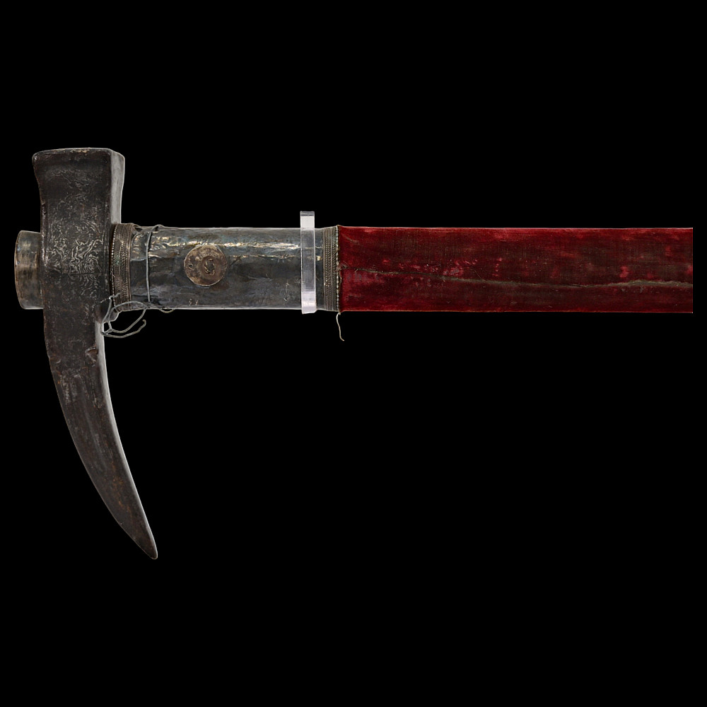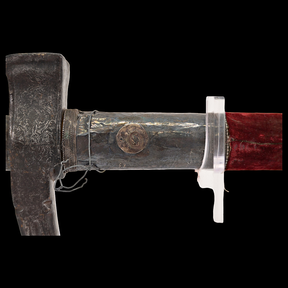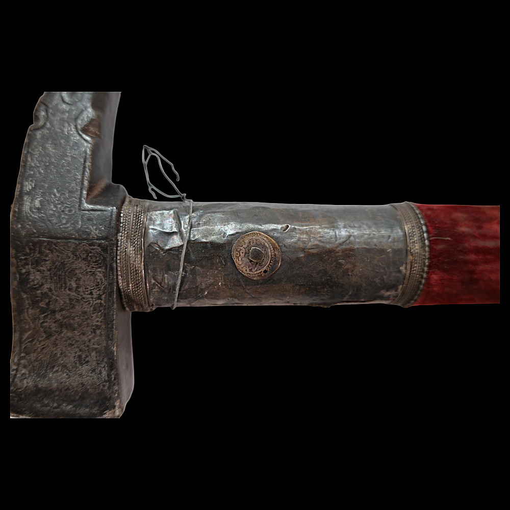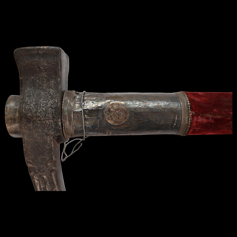 Ottoman war hammer (kulunk), 17th century, Damascus steel, silver. The head finely-wrought of actively-grained pattern-welded damascus steel of characteristic form with flaring hammer and curved, profiled spike with central fuller. The wooden haft covered in worn velvet, the mounts of silver with beaded borders. Provenance Auctions Imperial Inc, March 15, 2014, lot 550.