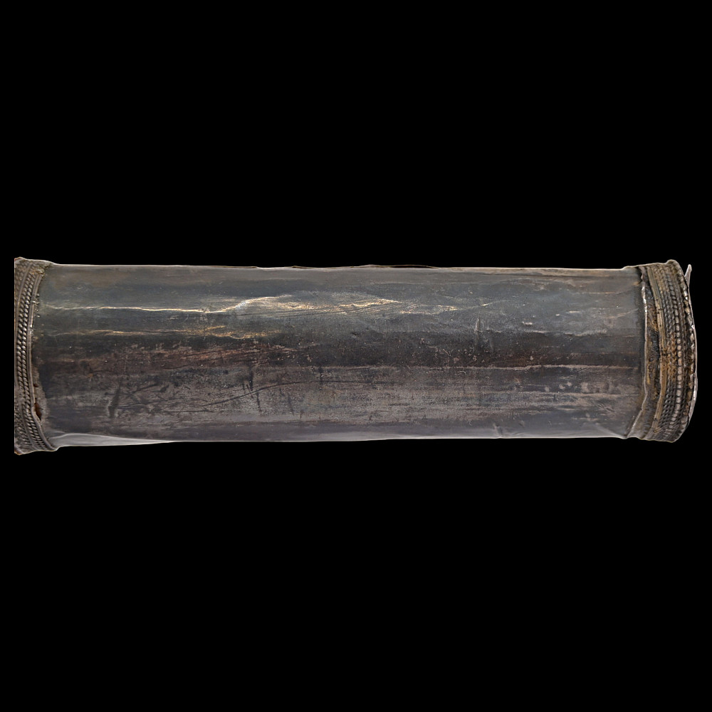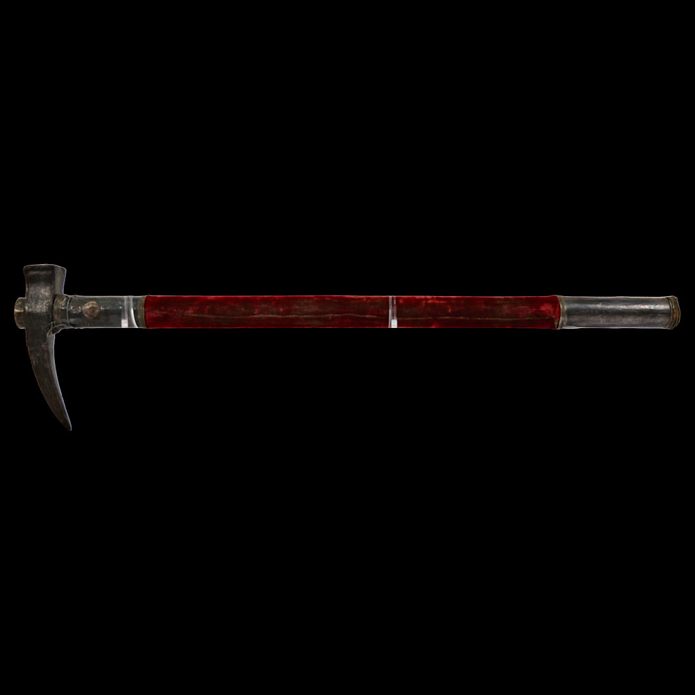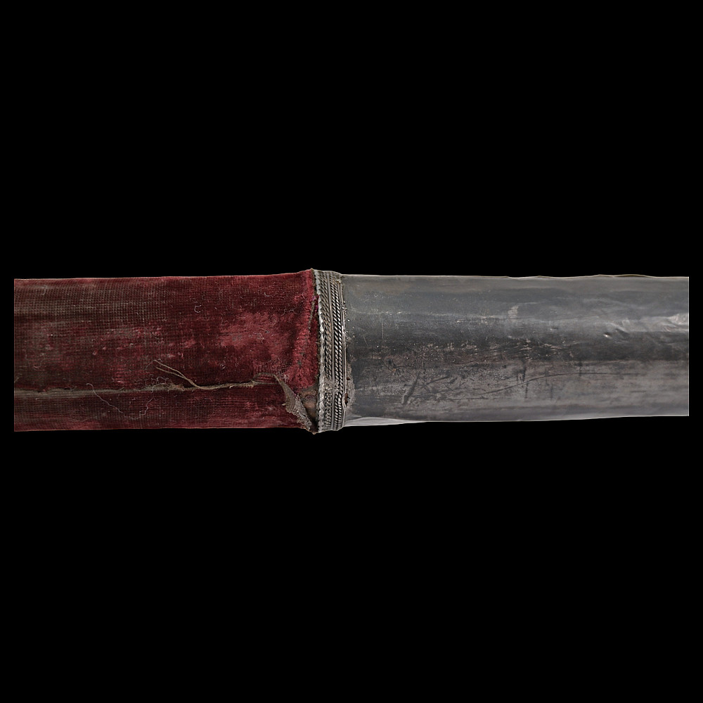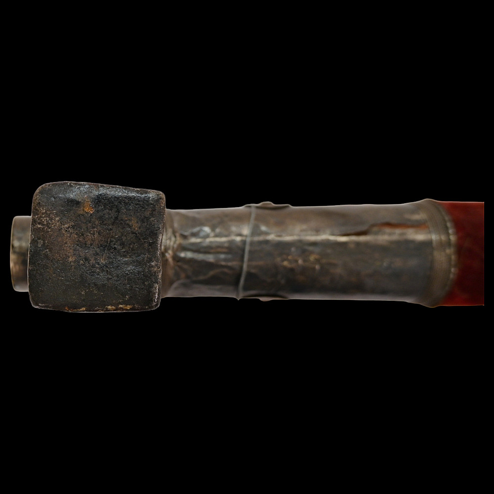 Ottoman war hammer (kulunk), 17th century, Damascus steel, silver. The head finely-wrought of actively-grained pattern-welded damascus steel of characteristic form with flaring hammer and curved, profiled spike with central fuller. The wooden haft covered in worn velvet, the mounts of silver with beaded borders. Provenance Auctions Imperial Inc, March 15, 2014, lot 550.