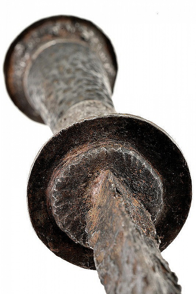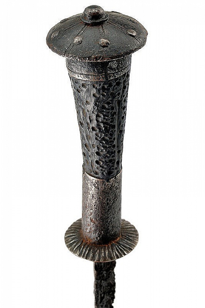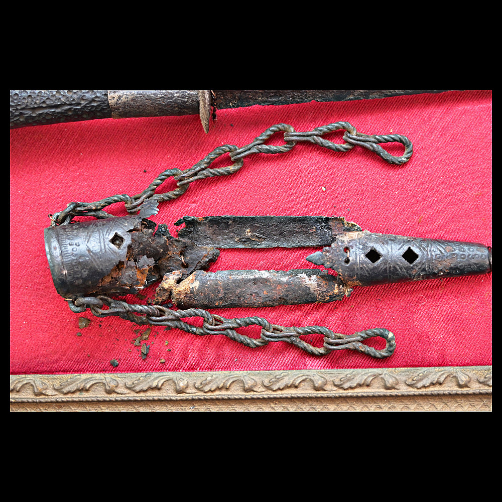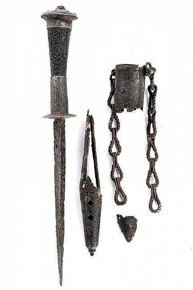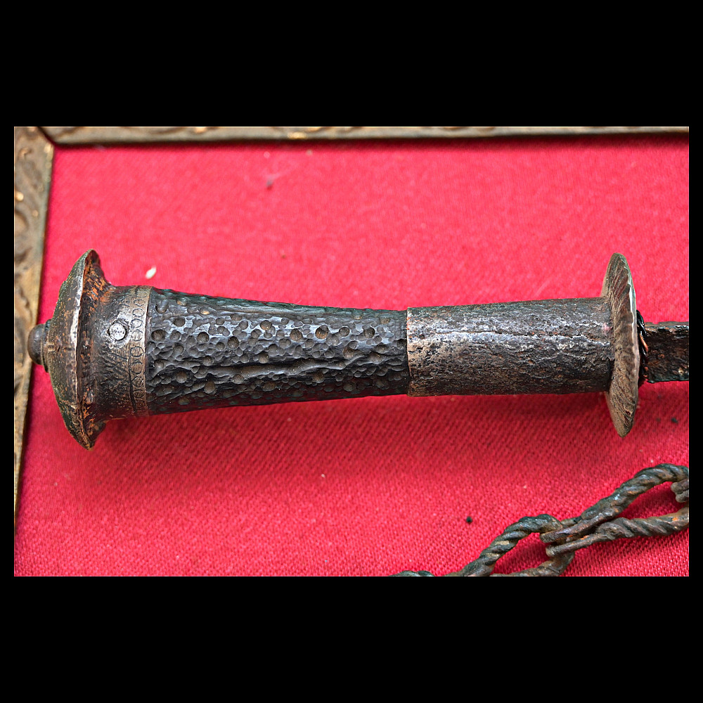 A very rare Medieval Western Europe rondel dagger with wooden grip and iron details scabbard, 14th-15th C.. Straight blade of triangular section, with hollow faces, at the base a iron disc with notched border, the quilon consists in a larger disc, made of iron, chiselled with rays and provided with a long ring-nut extending toward the grip slightly convex cap with ring-nut, buttoned, decorated with nails. Complete with remains of the scarce scabbard: decorated, iron cap featuring remains of leather and chains; iron chape with two metallic cross-bars. dimensions: length 28,5 cm. The dagger is mounted on a tablet with red cloth in the frame. Rondel daggers take their name from the round disk (rondels) that form their guard. Long narrow daggers like this one are designed for thrusting, piercing and stabbing. The thin, sharp point can fit through gaps in armor, and penetrate leather or heavy fabric. Rondel daggers were worn suspended on the right side of the belt or slung from the front of it. There is some evidence to suggest that rondel daggers were popular with the emerging middle class in the mid-15th century. Merchants and tradesmen can be seen wearing them in a painting by Girat de Roussillon circa 1448. A fantastic opportunity to complete your collection with a very rare artifact from the Middle Ages. Provenance, private collection Belgium.