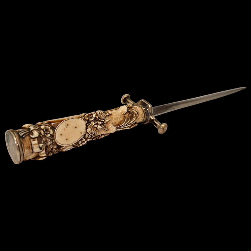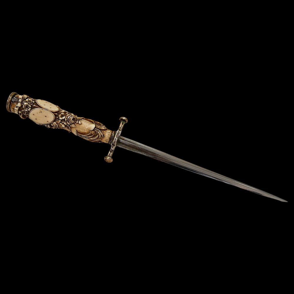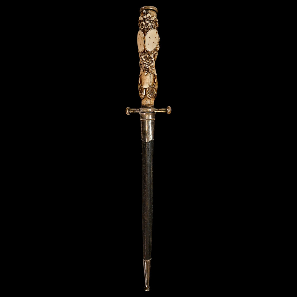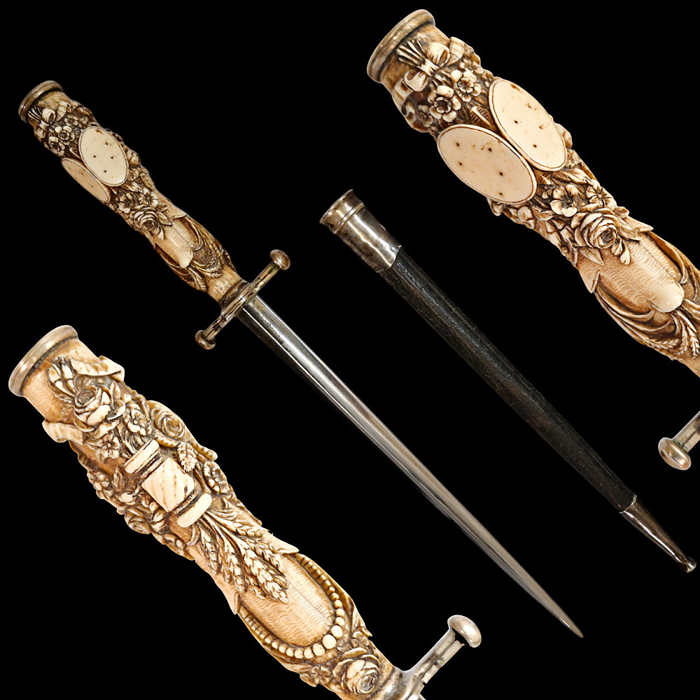An exquisite dagger with a carved handle and original scabbard, France, 18th century. Straight three-edge blade. The bone handle is decorated with exquisite carvings depicting flowers and ears of wheat. The dagger's fittings are silver or silver-plated. The original black leather sheath with silver or silver-plated fittings. A wonderful collectible dagger in excellent condition. Length 32 cm.