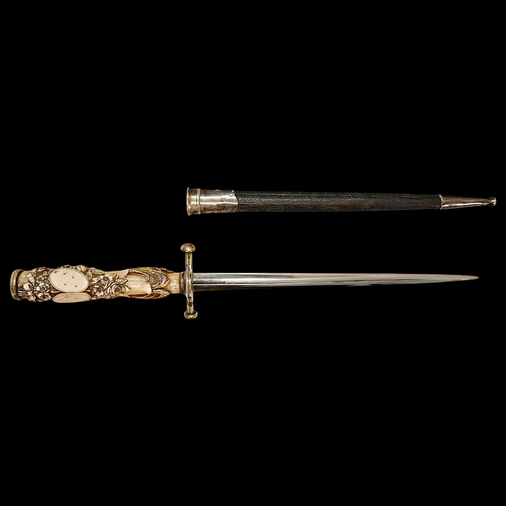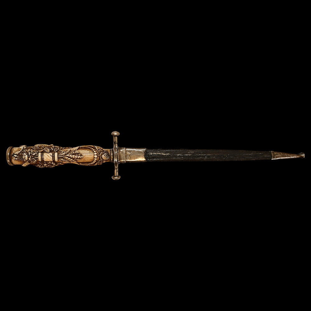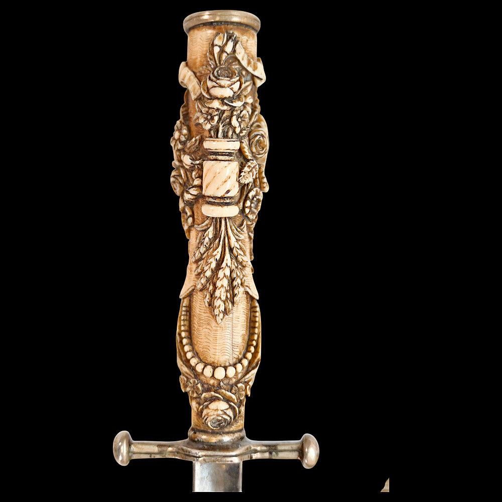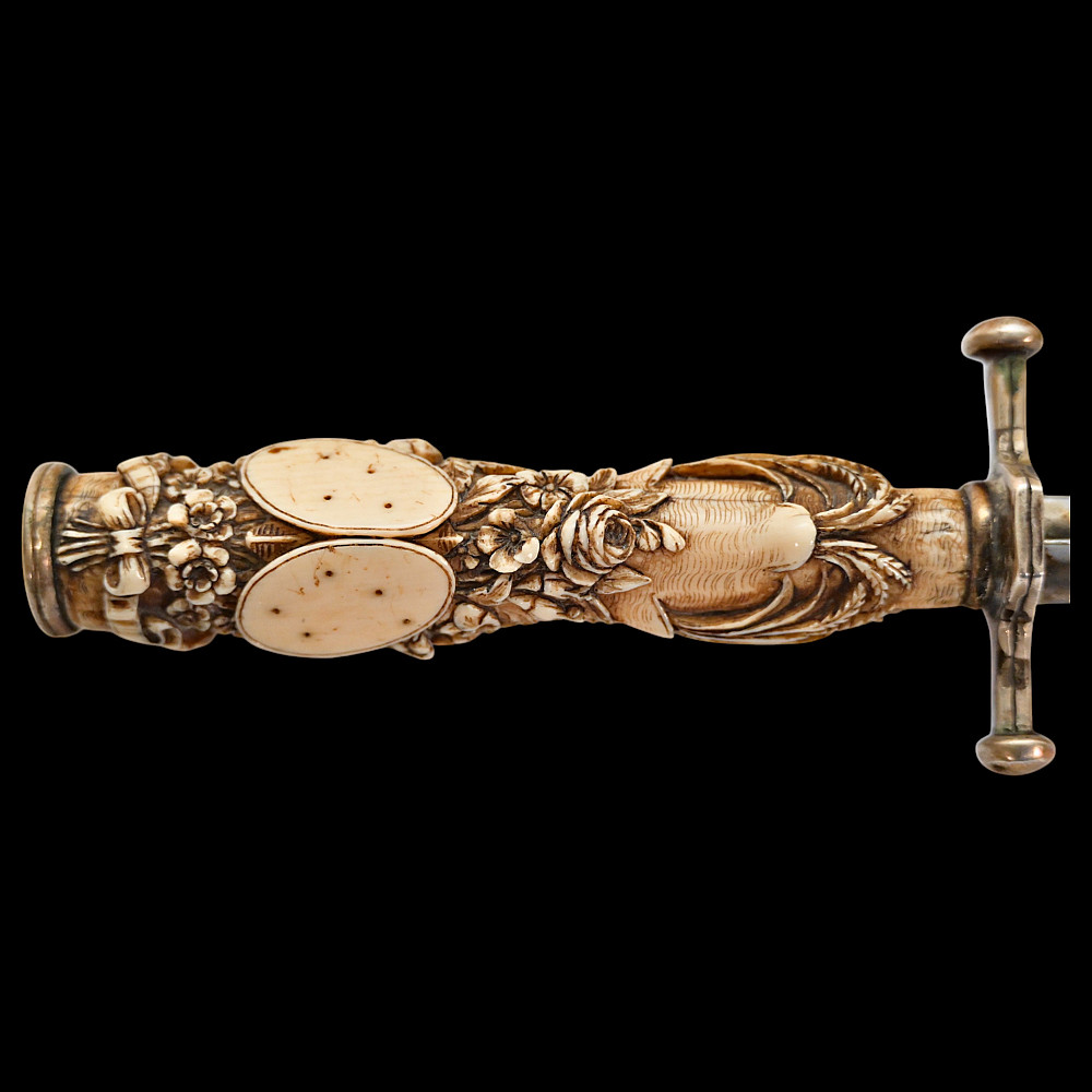An exquisite dagger with a carved handle and original scabbard, France, 18th century. Straight three-edge blade. The bone handle is decorated with exquisite carvings depicting flowers and ears of wheat. The dagger's fittings are silver or silver-plated. The original black leather sheath with silver or silver-plated fittings. A wonderful collectible dagger in excellent condition. Length 32 cm.