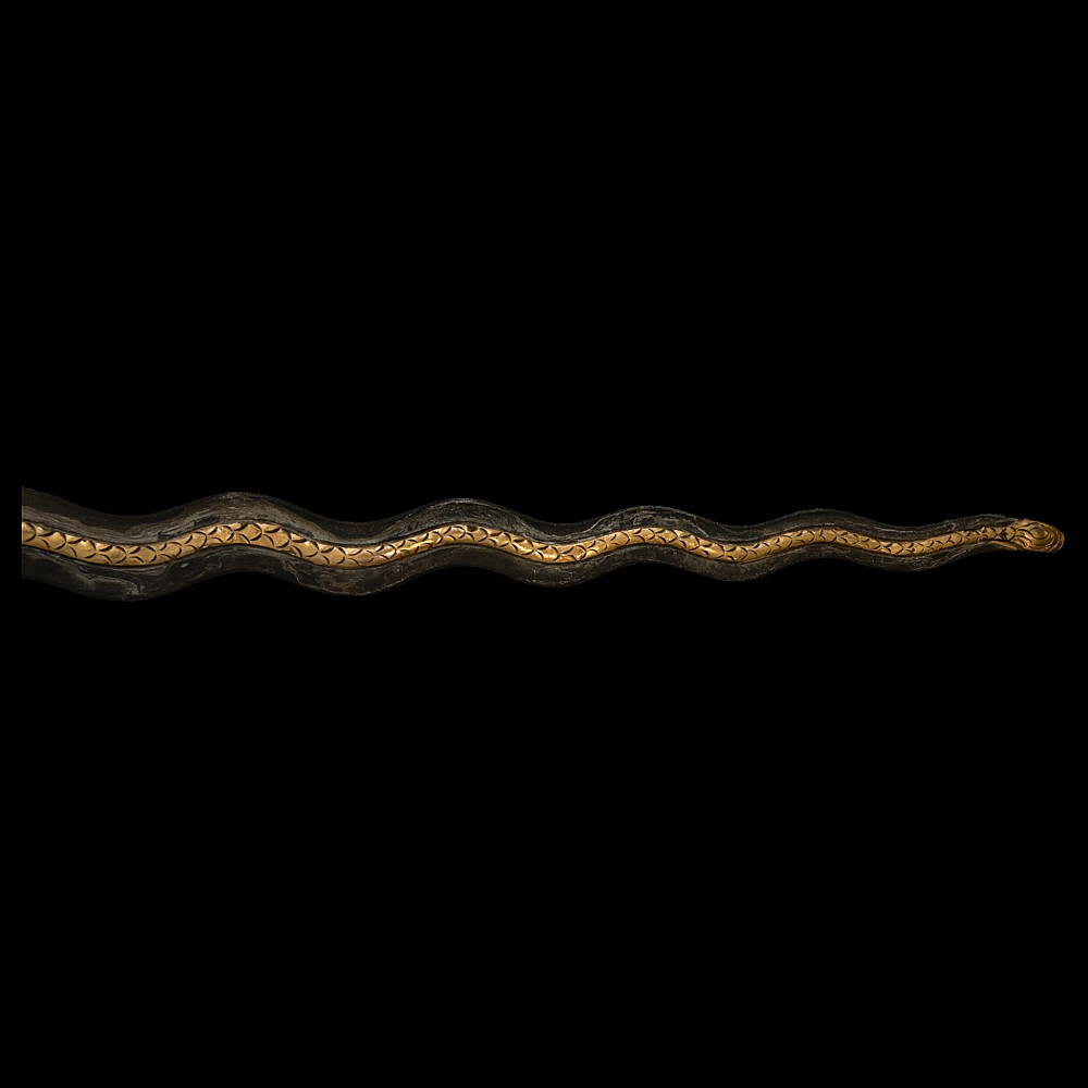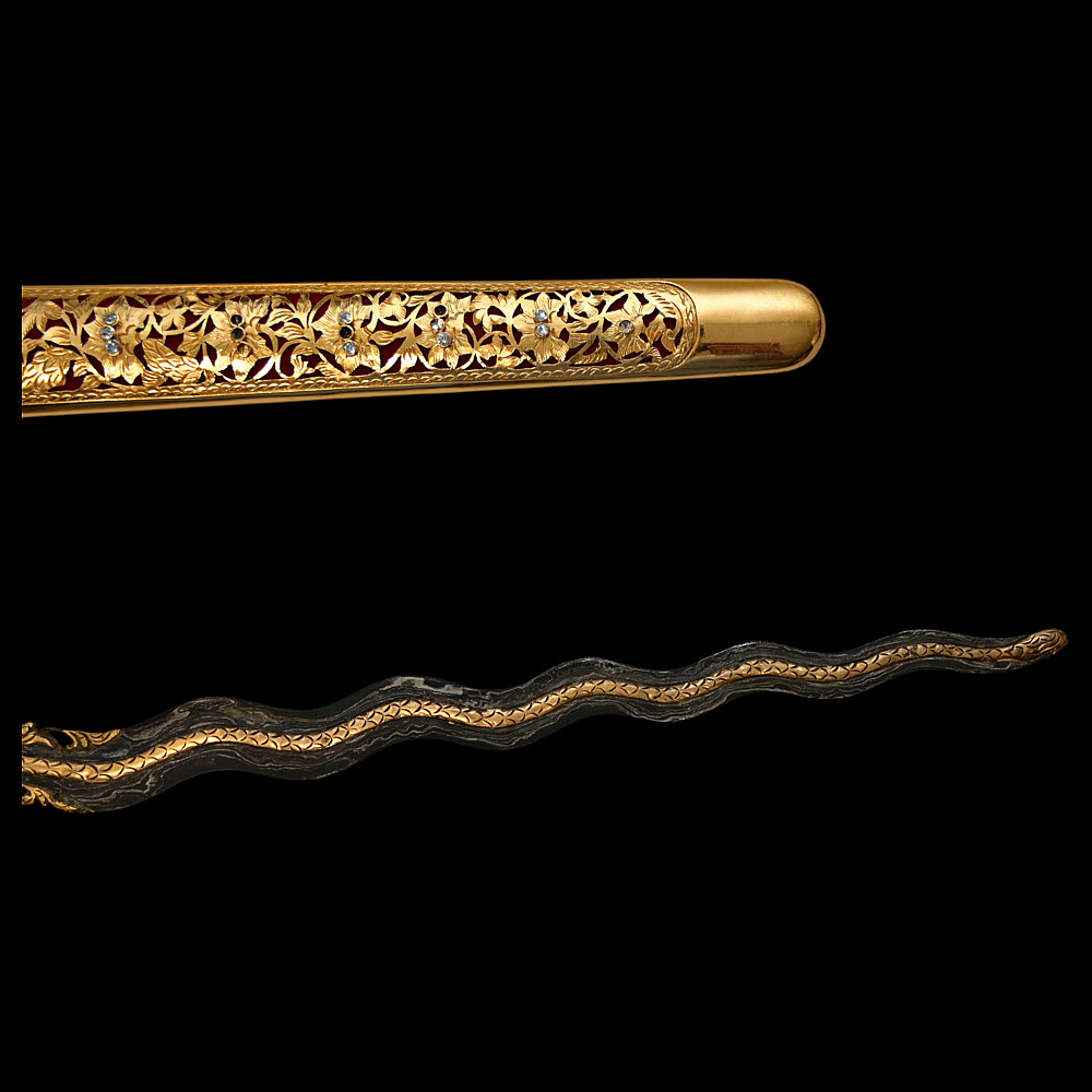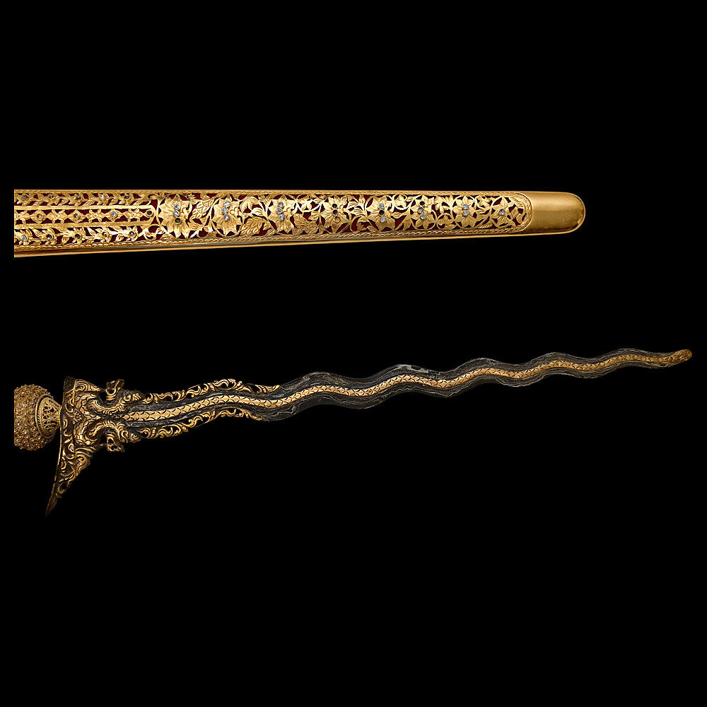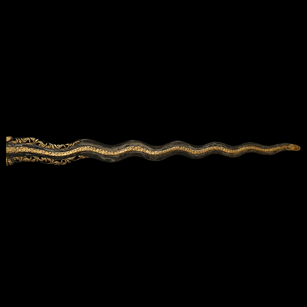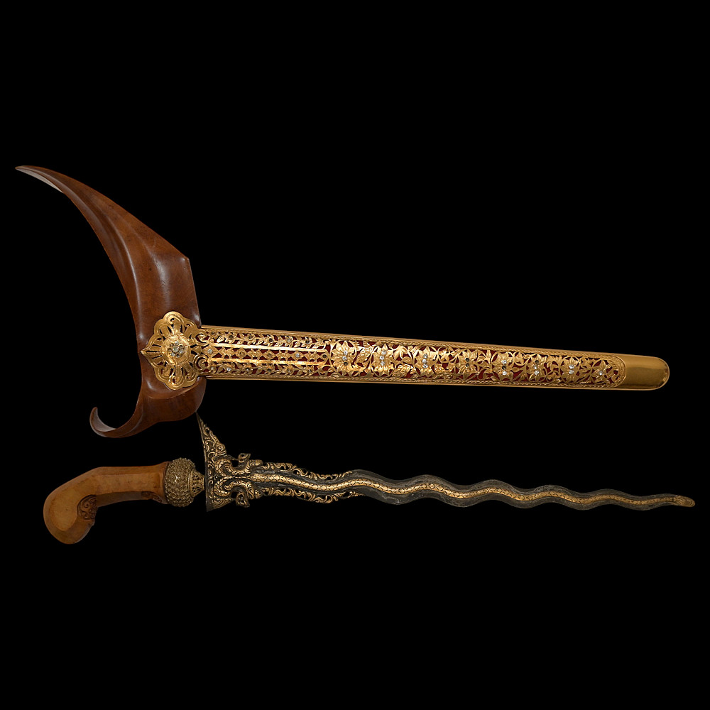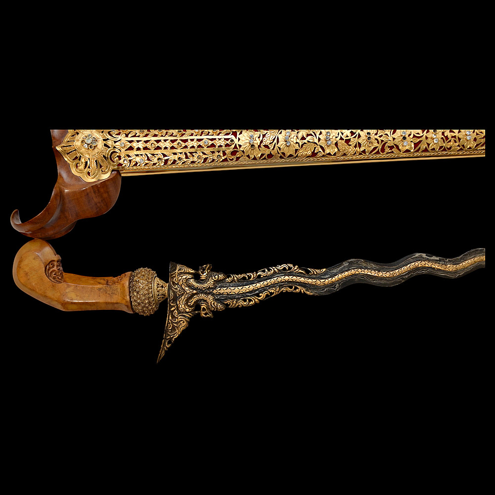 Antique Malay Kris = Keris sword - dagger, late 19th - early 20th century. A robust, extremely well-made serpentine-shaped wilah (blade) with 13 luk (waves). The blade is exquisitely crafted from hand-forged iron in various layers with a unusual pattern. It is also decorated on both sides with a finely hand-carved and inlaid yellow metal crowned Naga (mythological serpent). A handle, also called hulu or ukiran, is carved from honey-colored Timoho wood (Kleinhovia Hospital) and has naturally occurring contrasting grains. The metal coupling (Mendak) has a beautiful geometric relief pattern. The sarungan (scabbard) with wranka, beautifully shaped like a ship, is also carved from timaha wood, with naturally occurring contrasting grains. The exterior of the scabbard is decorated with a gilded metal sheath with perforated floral decoration and inlays of diamond-like stones. Beautiful collectible Chris - dagger in very good condition. Length: 51 cm.