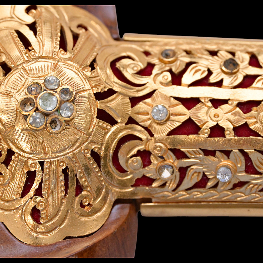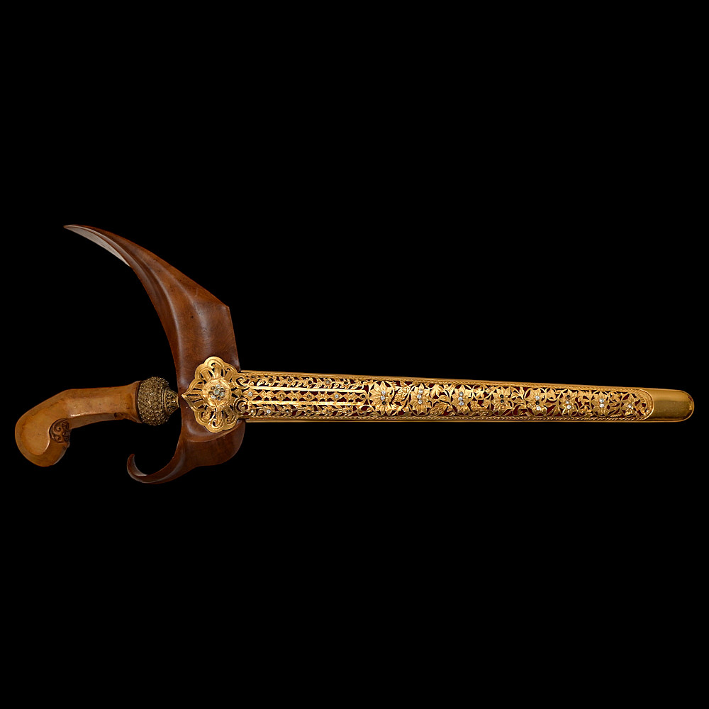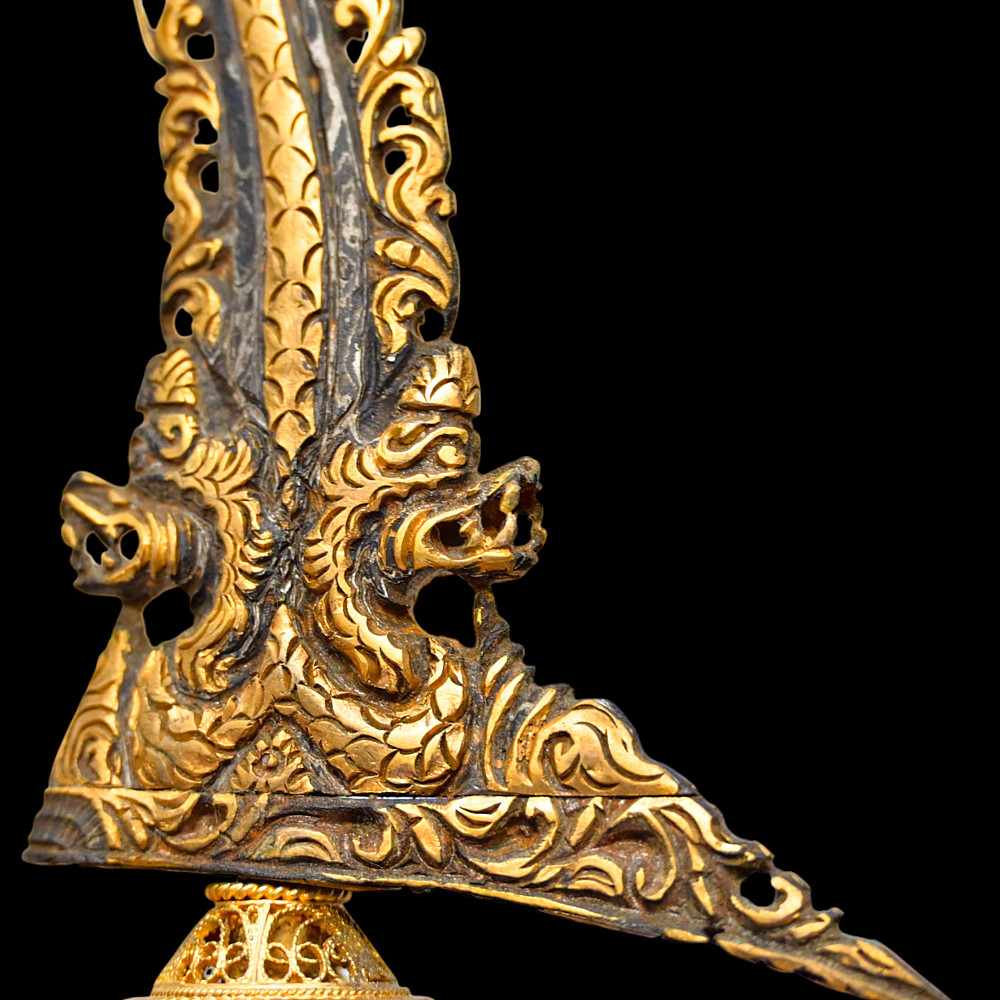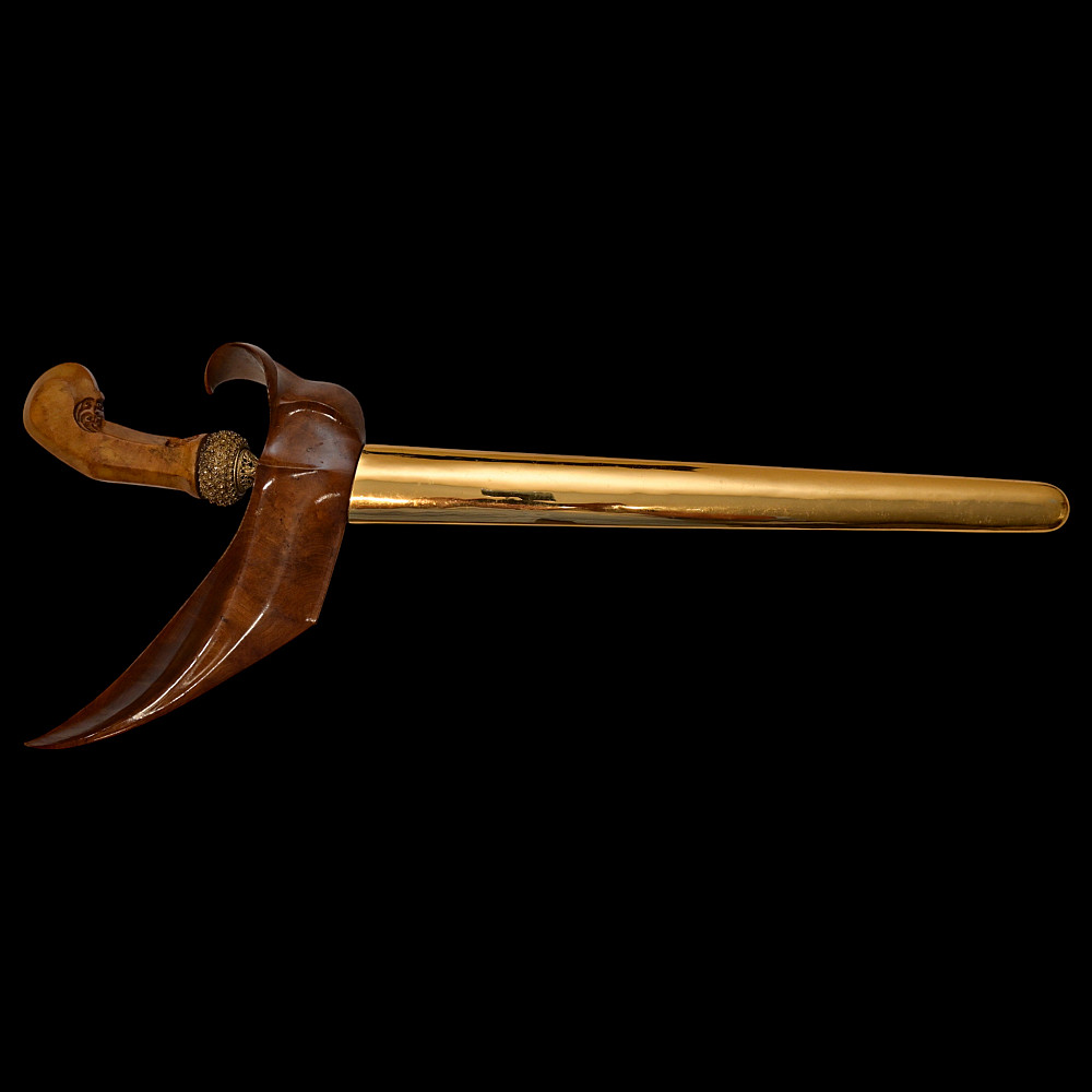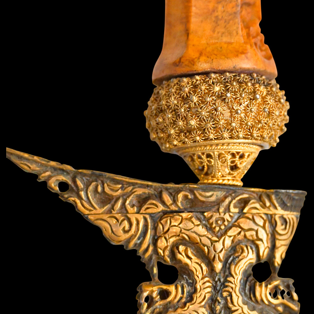 Antique Malay Kris = Keris sword - dagger, late 19th - early 20th century. A robust, extremely well-made serpentine-shaped wilah (blade) with 13 luk (waves). The blade is exquisitely crafted from hand-forged iron in various layers with a unusual pattern. It is also decorated on both sides with a finely hand-carved and inlaid yellow metal crowned Naga (mythological serpent). A handle, also called hulu or ukiran, is carved from honey-colored Timoho wood (Kleinhovia Hospital) and has naturally occurring contrasting grains. The metal coupling (Mendak) has a beautiful geometric relief pattern. The sarungan (scabbard) with wranka, beautifully shaped like a ship, is also carved from timaha wood, with naturally occurring contrasting grains. The exterior of the scabbard is decorated with a gilded metal sheath with perforated floral decoration and inlays of diamond-like stones. Beautiful collectible Chris - dagger in very good condition. Length: 51 cm.