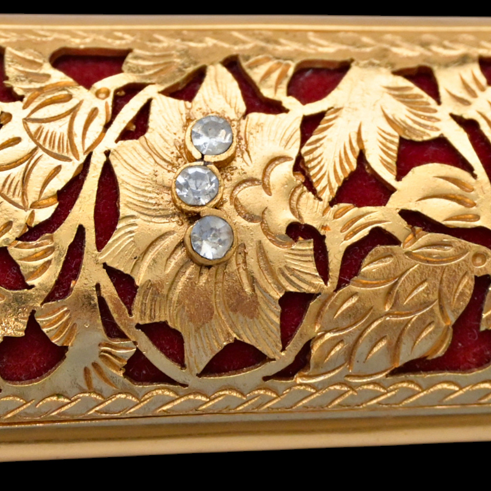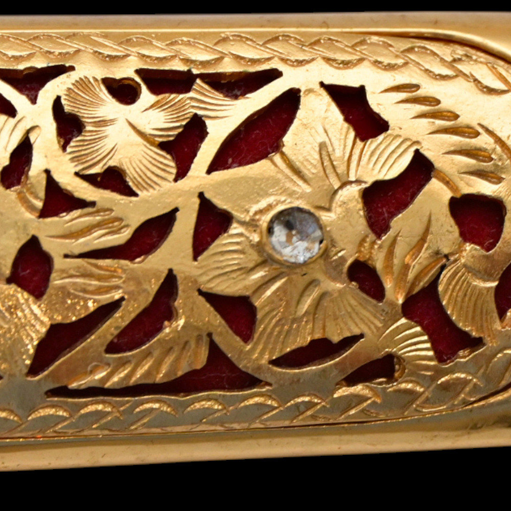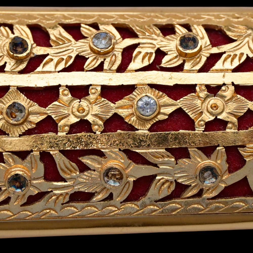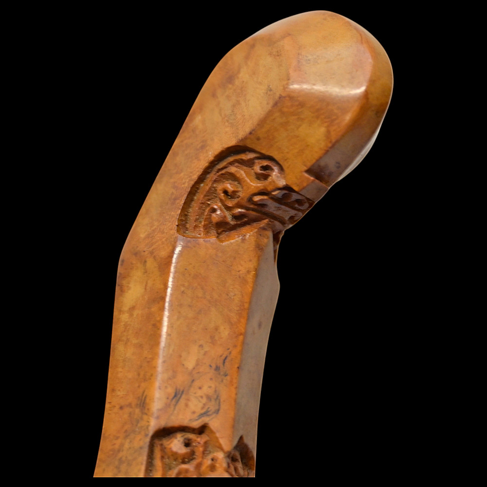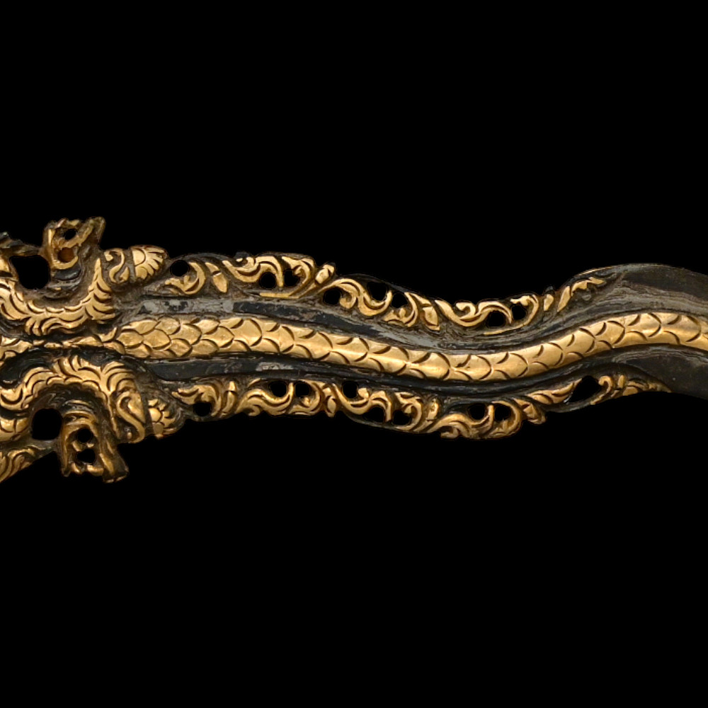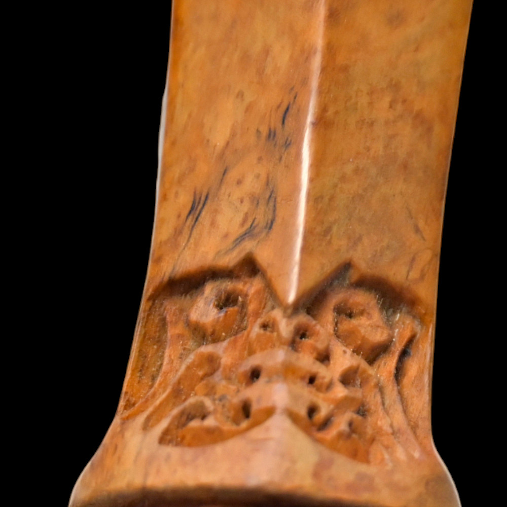 Antique Malay Kris = Keris sword - dagger, late 19th - early 20th century. A robust, extremely well-made serpentine-shaped wilah (blade) with 13 luk (waves). The blade is exquisitely crafted from hand-forged iron in various layers with a unusual pattern. It is also decorated on both sides with a finely hand-carved and inlaid yellow metal crowned Naga (mythological serpent). A handle, also called hulu or ukiran, is carved from honey-colored Timoho wood (Kleinhovia Hospital) and has naturally occurring contrasting grains. The metal coupling (Mendak) has a beautiful geometric relief pattern. The sarungan (scabbard) with wranka, beautifully shaped like a ship, is also carved from timaha wood, with naturally occurring contrasting grains. The exterior of the scabbard is decorated with a gilded metal sheath with perforated floral decoration and inlays of diamond-like stones. Beautiful collectible Chris - dagger in very good condition. Length: 51 cm.