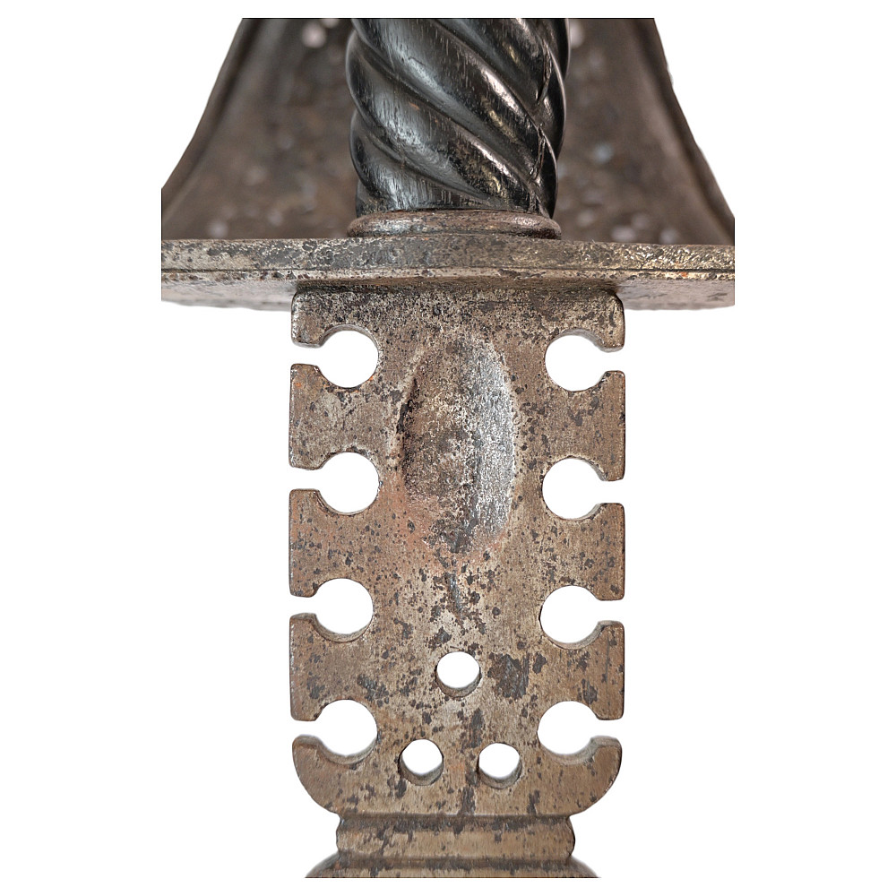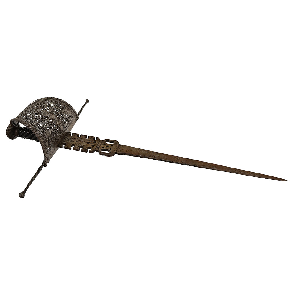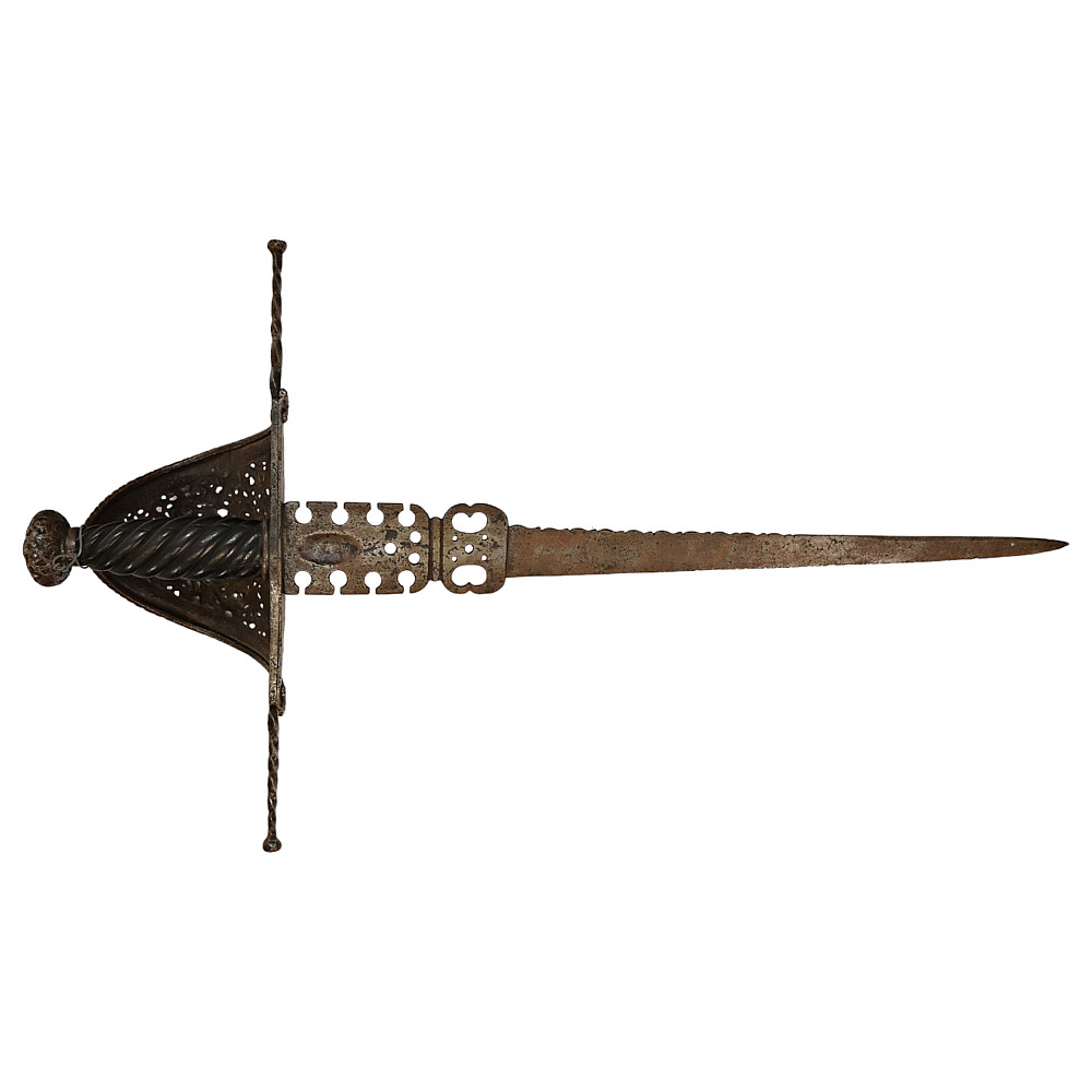 Antique Spanish Left Hand Dagger, 17th century. Strong, straight blade of triangular section. Blade base with a series of decorative perforations. Iron hilt with large knuckle chiselled and pierced with the shield and armor, birds and floral motifs, disc-shaped pommel chiselled with floral motifs. Twisted, wooden grip. A wonderful collectible.