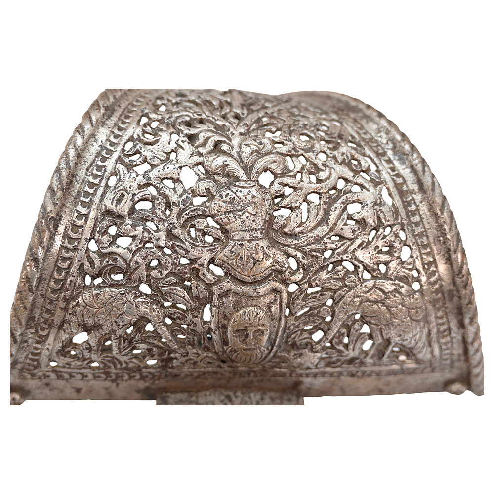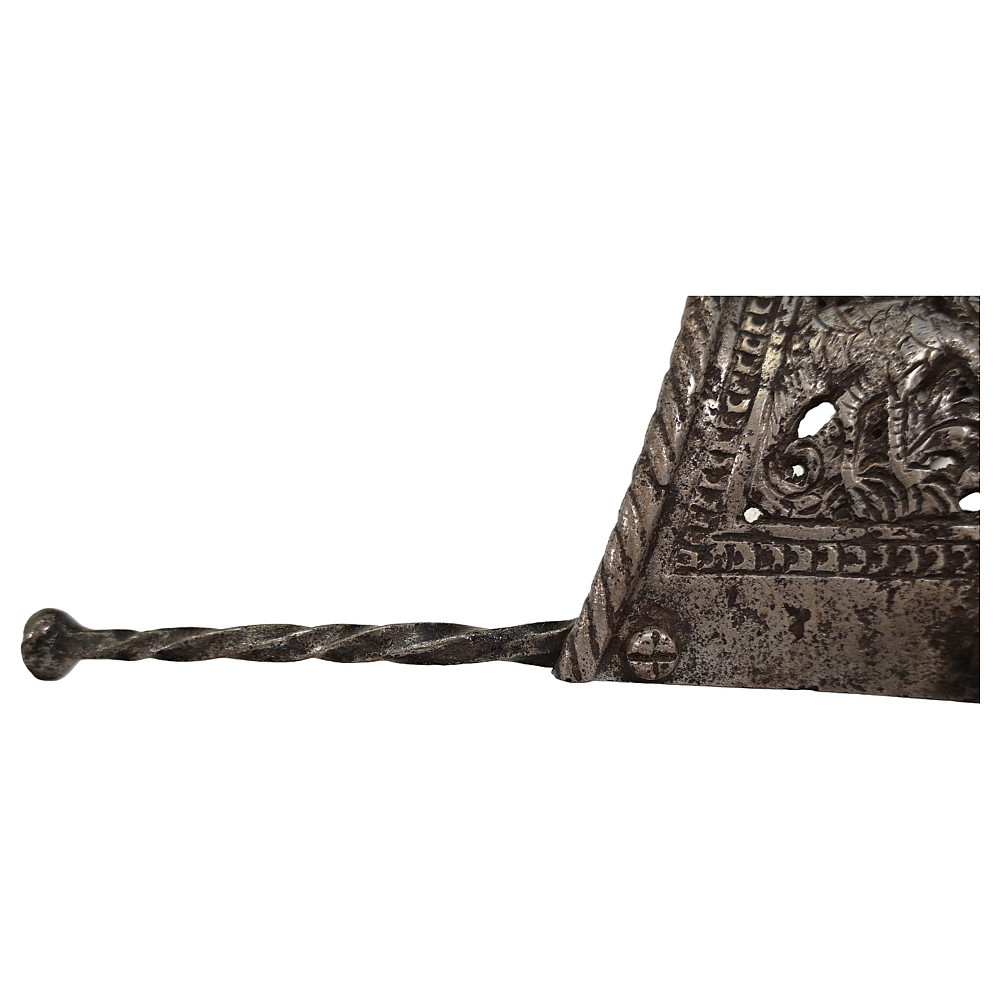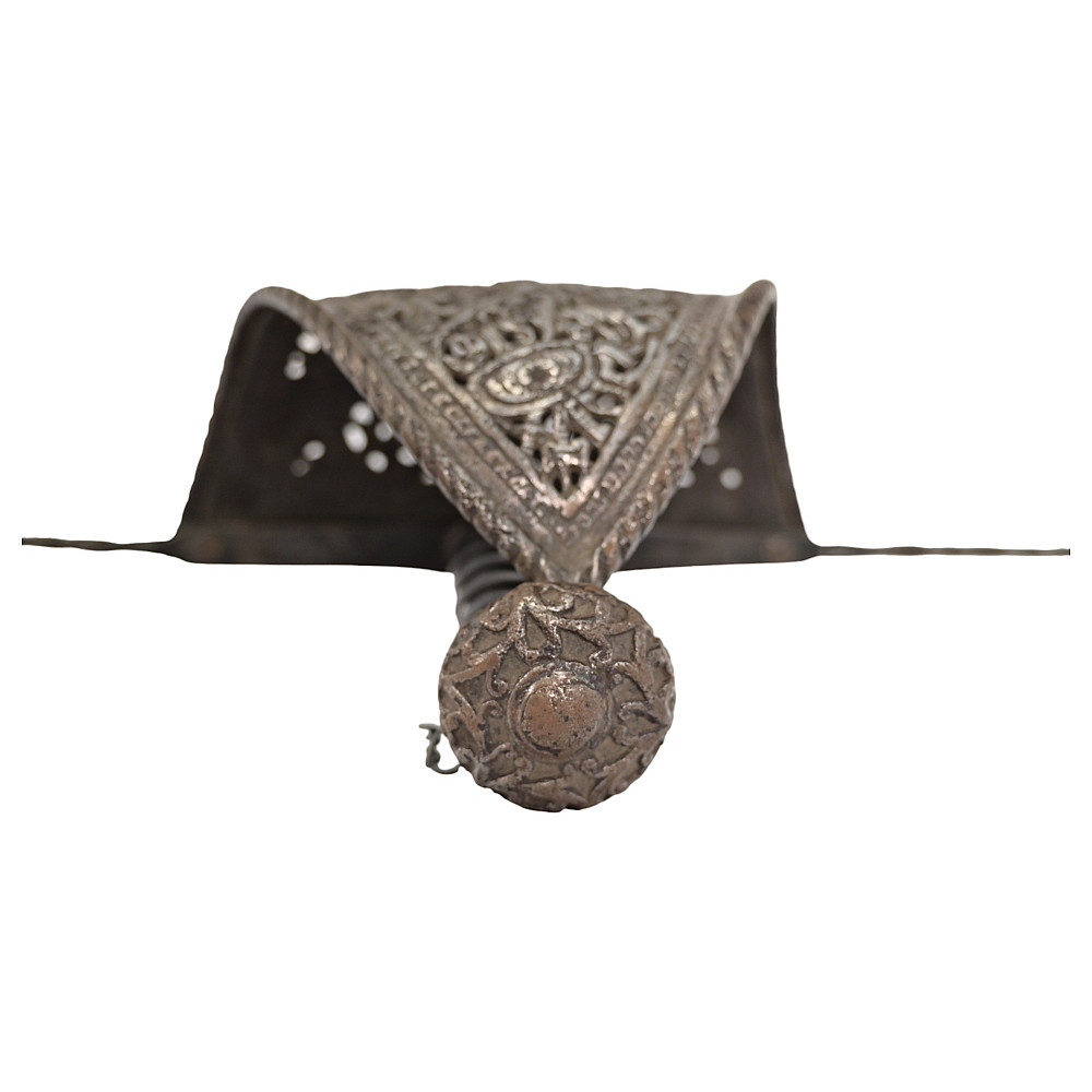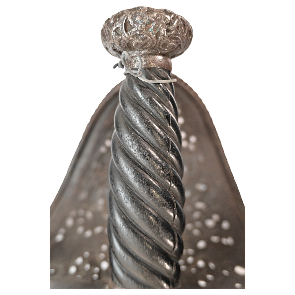 Antique Spanish Left Hand Dagger, 17th century. Strong, straight blade of triangular section. Blade base with a series of decorative perforations. Iron hilt with large knuckle chiselled and pierced with the shield and armor, birds and floral motifs, disc-shaped pommel chiselled with floral motifs. Twisted, wooden grip. A wonderful collectible.