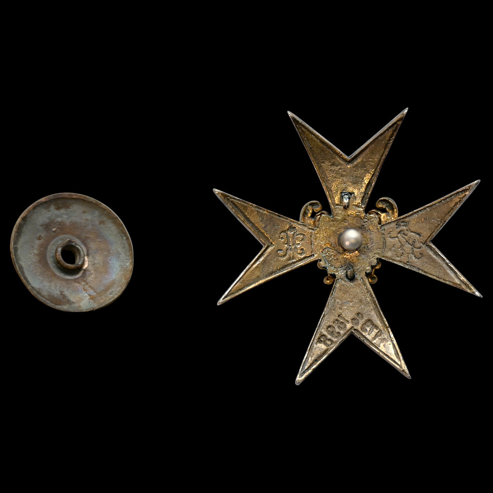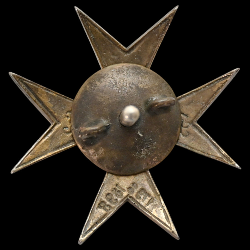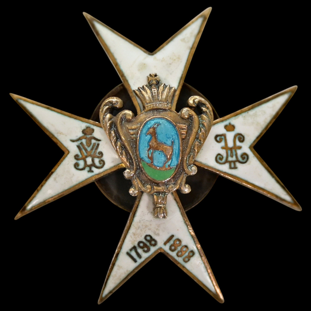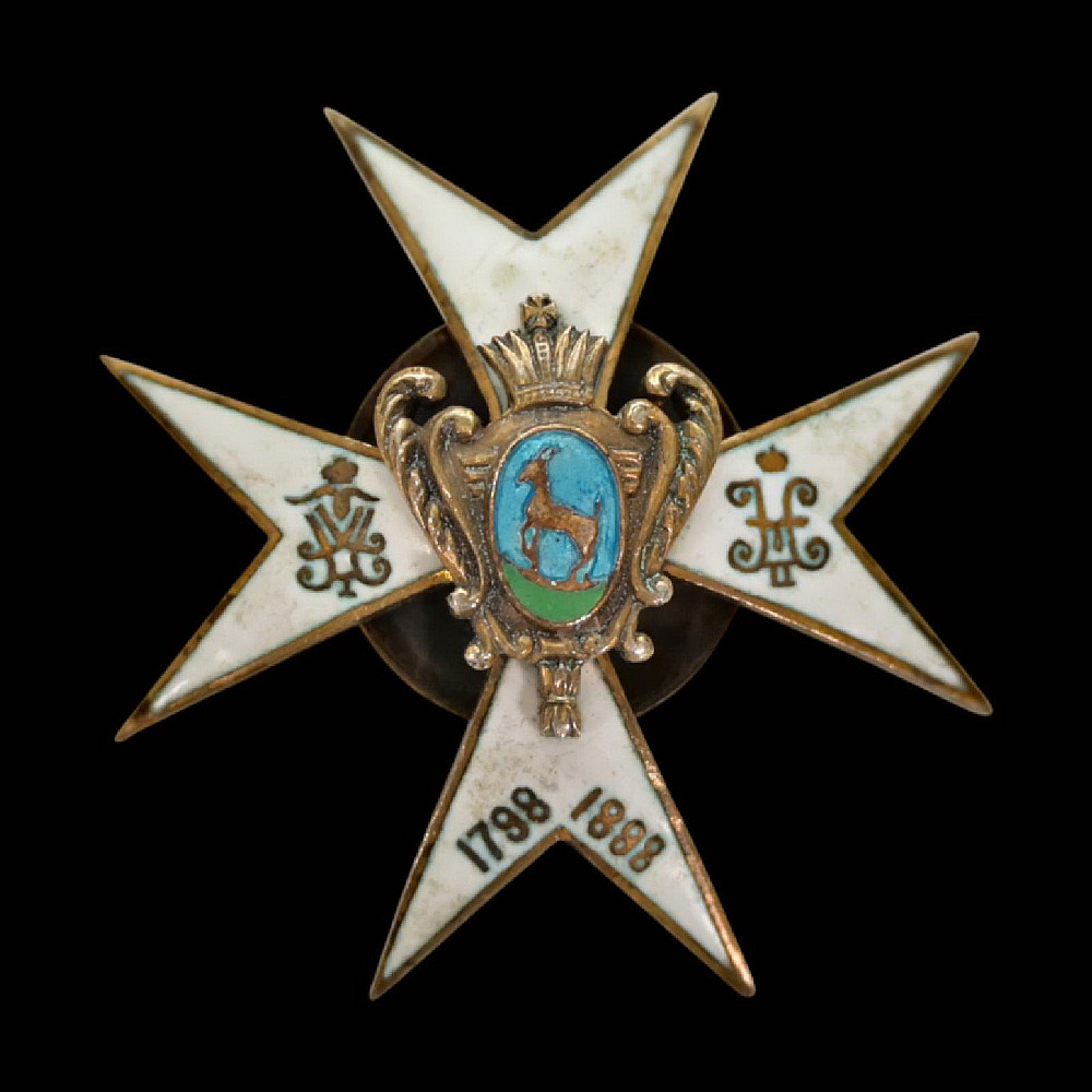 Badge of the 147th Samara Infantry Regiment, Russia. An impressive and finely crafted centennial badge of the 147th Samara Infantry Regiment, established in 1798 and commemorated in 1898 during the reign of Emperor Nicholas II. The badge is made as a white-enamel Maltese cross, bearing the crowned cyphers of Emperors Paul I and Nicholas II on the side arms. The center features the coat of arms of Samara - a golden goat on a blue field within a gilt rococo shield topped with a crown. A beautiful and historically important Imperial Russian regimental badge, representing the long service and traditions of the 147th Samara Infantry Regiment. Хорошее состояние. Dimensions: approx. 4 × 4 cm.
