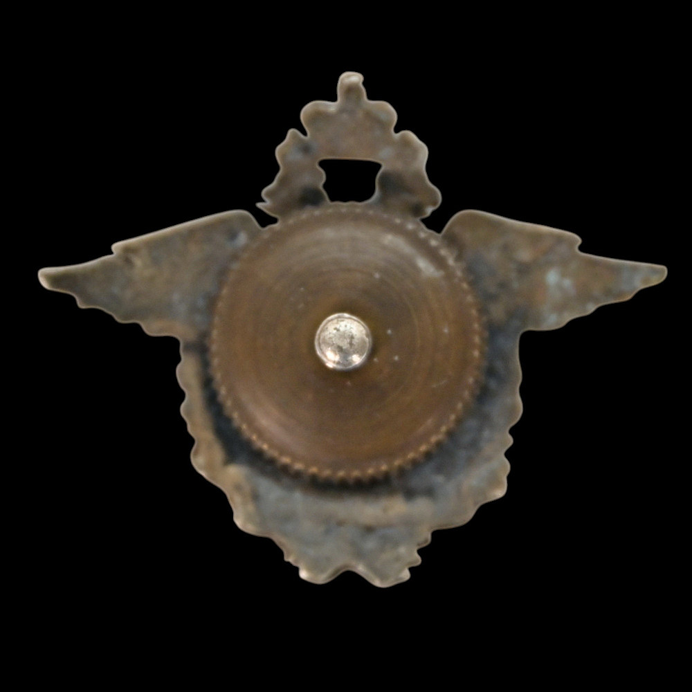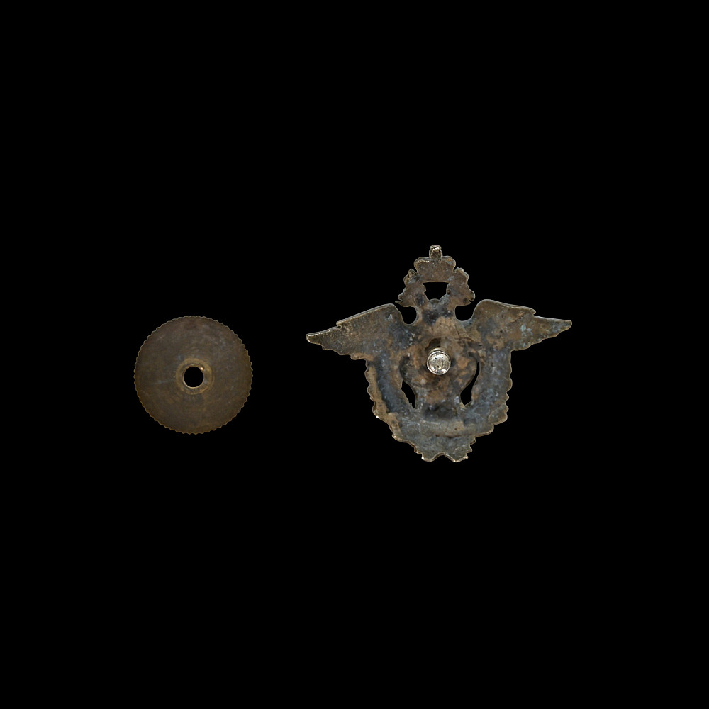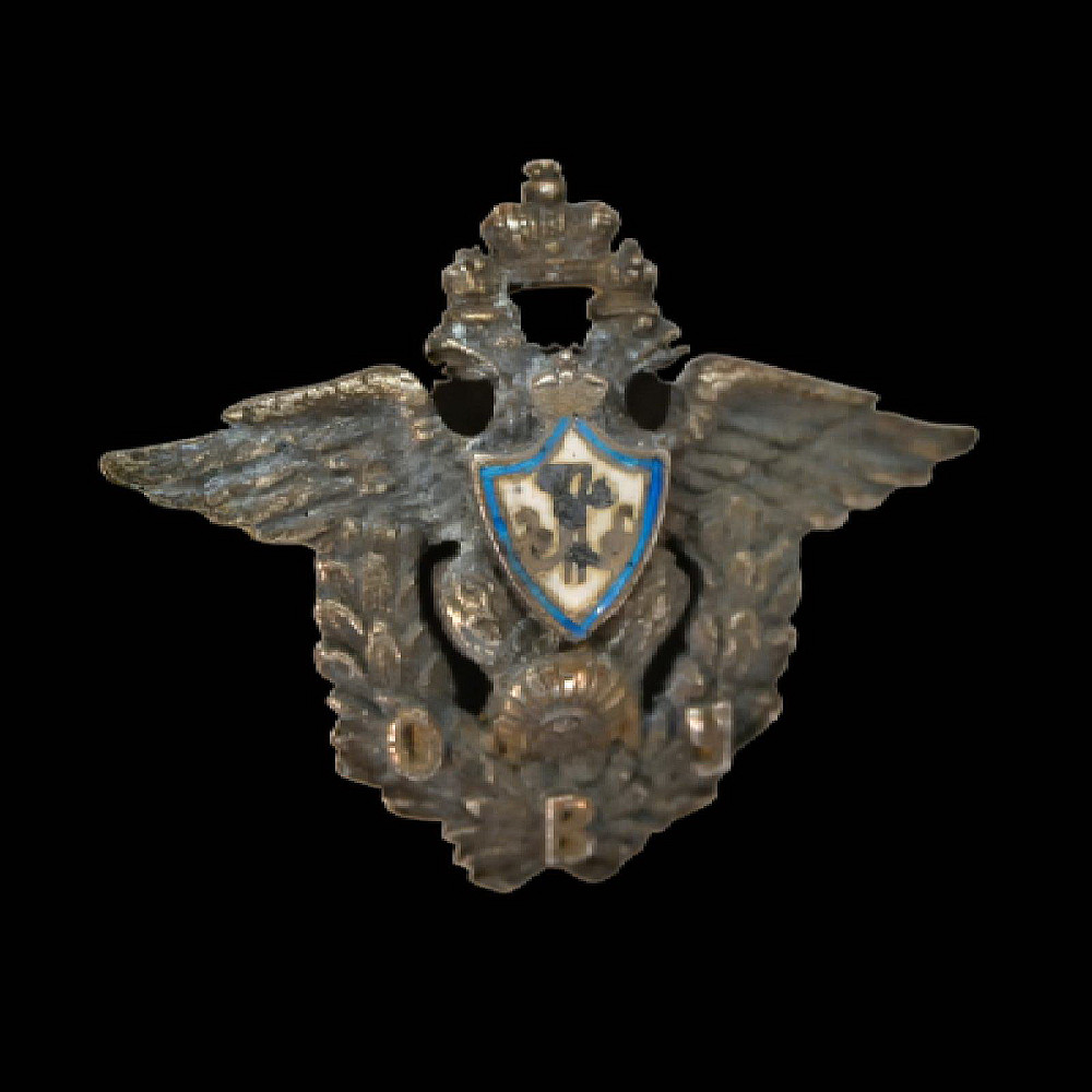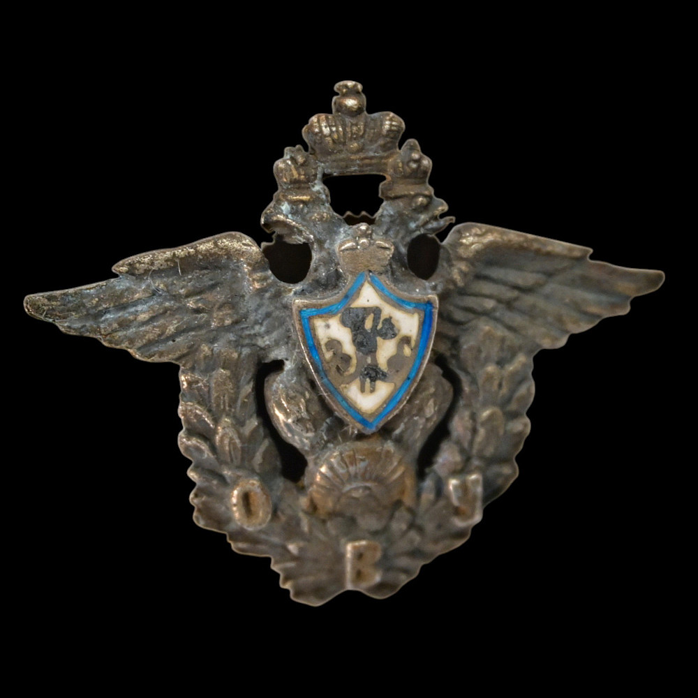 Miniature Badge of the Odessa Military School Imperial Russia, early 20th century. A rare badge of the Odessa Military School, Imperial Russia, early 20th century. The badge is finely crafted in silvered metal and enamel, featuring a double-headed Imperial eagle with outstretched wings surmounted by the Imperial crown. At the center, a blue-bordered shield bears the monogram of Emperor Nicholas 2. The lower part of the badge displays the initials O.V.U. (Odessa Military School) surrounded by laurel and oak leaves. Screwback construction with original nut. Badges of Imperial Russian military schools are highly collectible, representing the final generation of officer education before the fall of the Empire in 1917. Condition: Good condition, traces of age, patina. Dimensions: approx. 33 x 27 mm