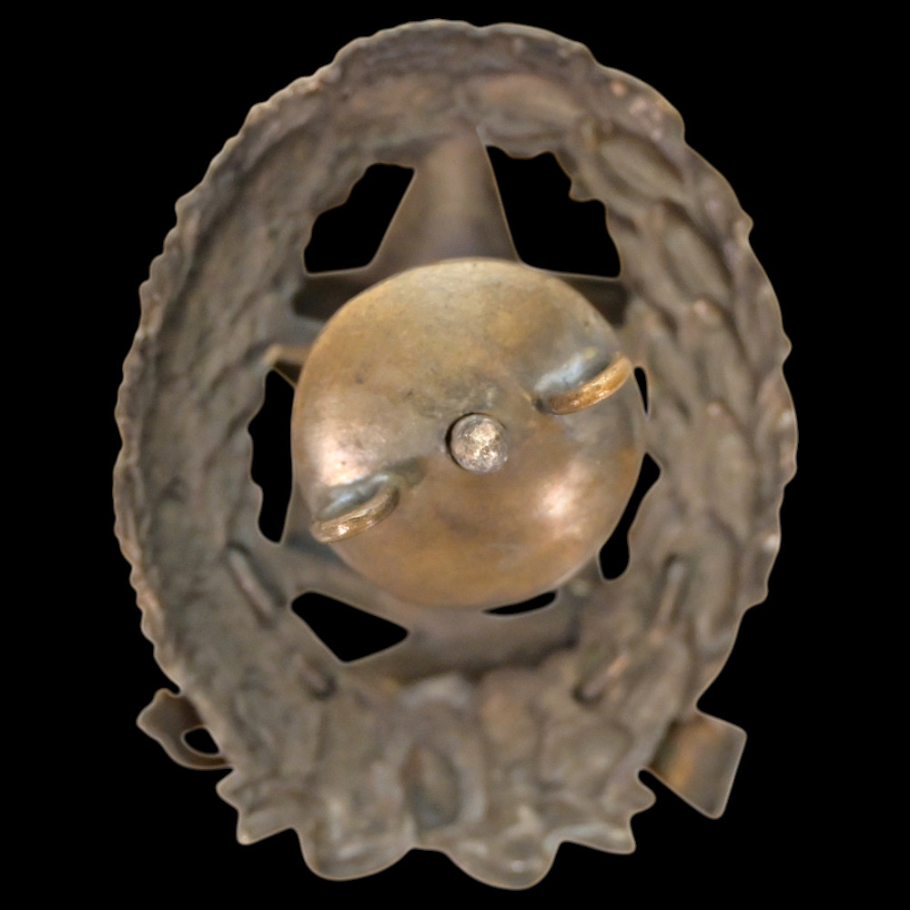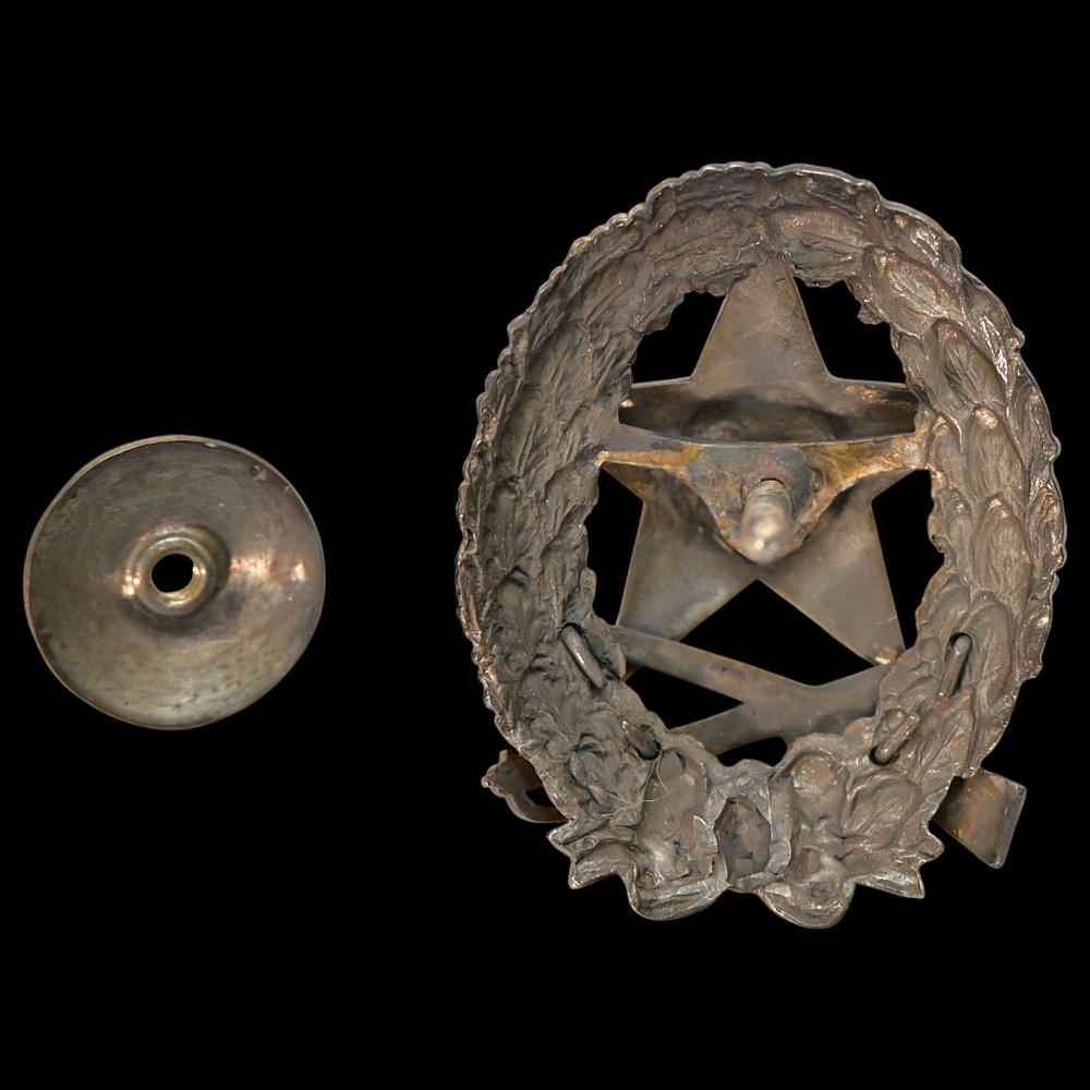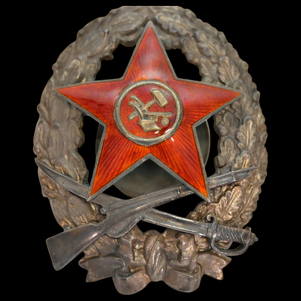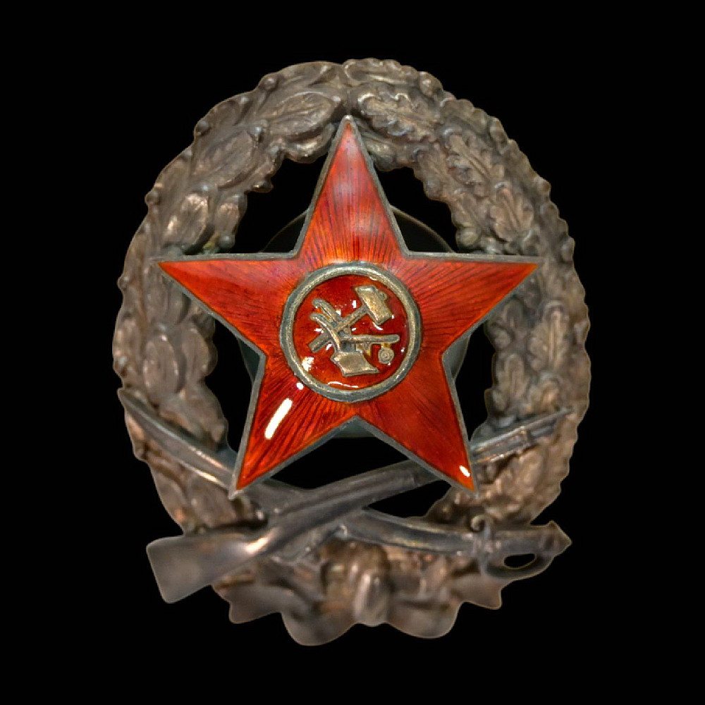 Badge “Red Commander” of the Workers’ and Peasants’ Red Army (RKKA), issued 1918–1922. The badge features a bright red enamel five-pointed star with the golden hammer and plow emblem, symbolizing the unity of workers and peasants. It is set against a silvered wreath of oak and laurel leaves, crossed rifle and sword at the base. Fastening on reverse. One of the earliest Red Army distinctions, representing the revolutionary spirit and military valor of the Soviet state’s founding years. Good condition. Height 4.5 cm.
