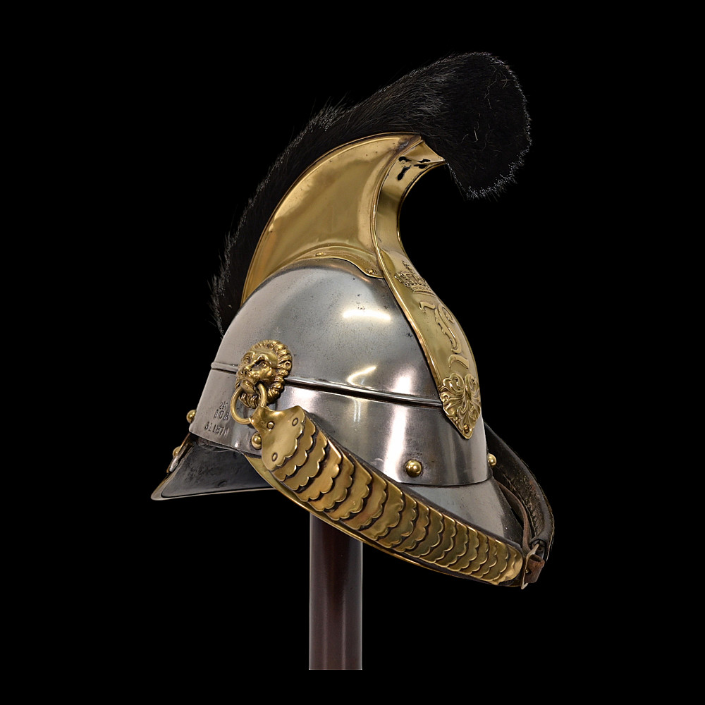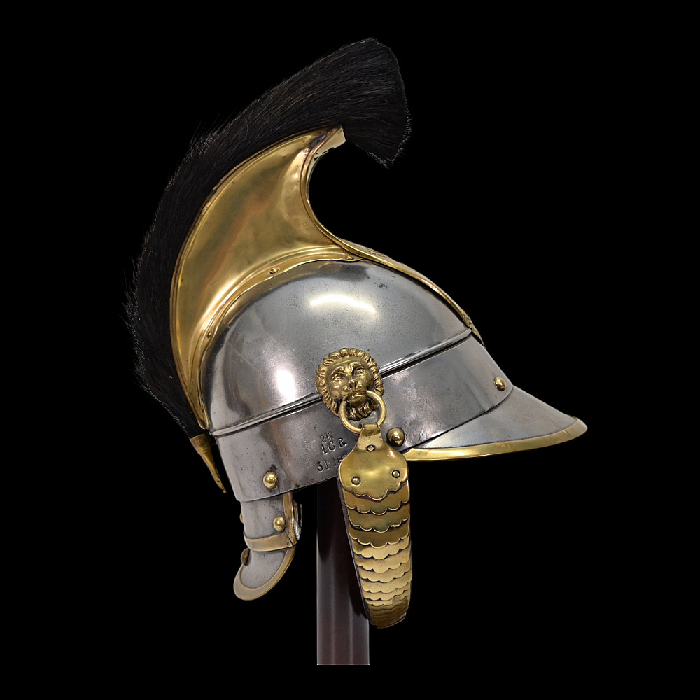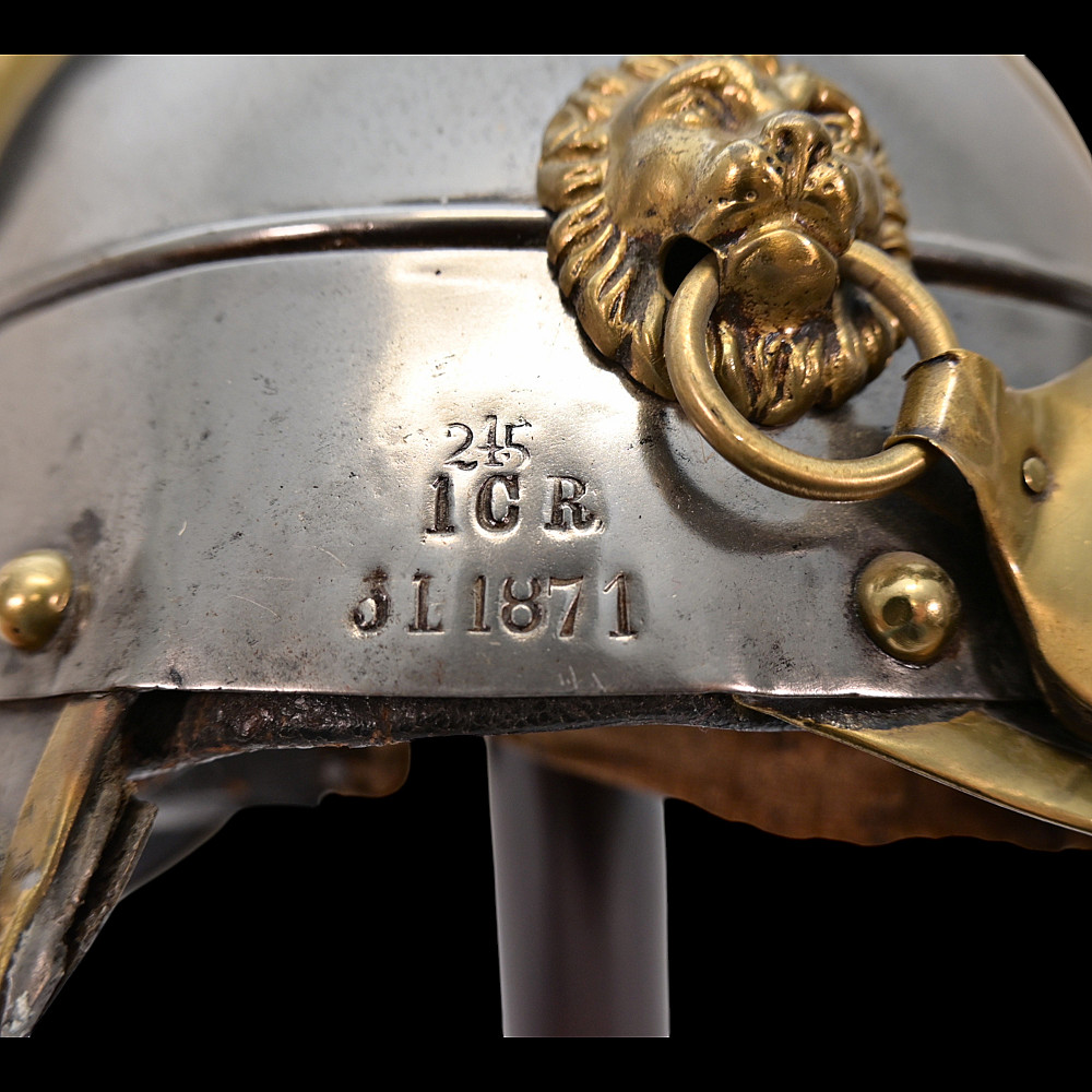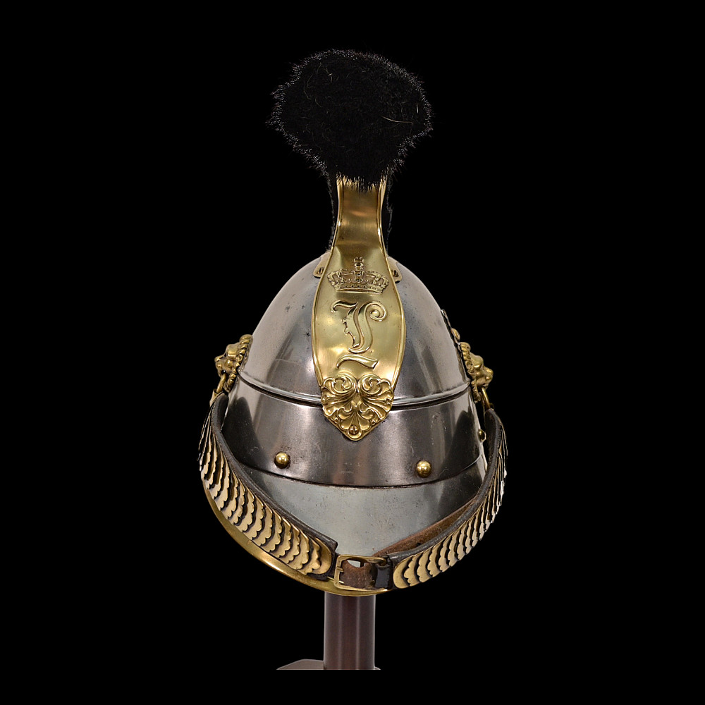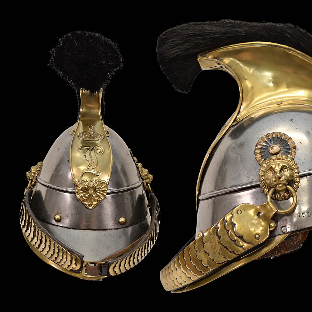 Bavarian Cuirassier Helmet, Model 1842 (Ludwig I Period, ca. 1842 - 1848). A fine and scarce example of the Bavarian heavy-cavalry helmet introduced in 1842 for cuirassier regiments serving under King Ludwig I of Bavaria. Constructed of bright polished steel with brass fittings, this model reflects the transitional neoclassical design of mid-19th-century German heavy-cavalry headgear. Tall steel skull with gilt-brass comb and crest, surmounted by the royal Bavarian crowned cipher “L” (for Ludwig), finely chased and mounted to the front. The black horsehair mane runs along the crest’s upper ridge. Brass lion-mask bosses retain the scaled chin-chains; the left boss bears the Bavarian cockade. Brim edged in brass, the underside of the front visor painted dark green. Interior lined in leather. Stamped on the shell with various issue marks: “245 I C R / 31 1871” (indicating later regimental reissue after unification), plus additional assembly numbers “614” and “735.” Condition: Very good for its age; light surface oxidation, wear to the leather lining, brass mounts with warm patina; overall a well-preserved and fully original example. Dimensions: approx. 32 cm high.