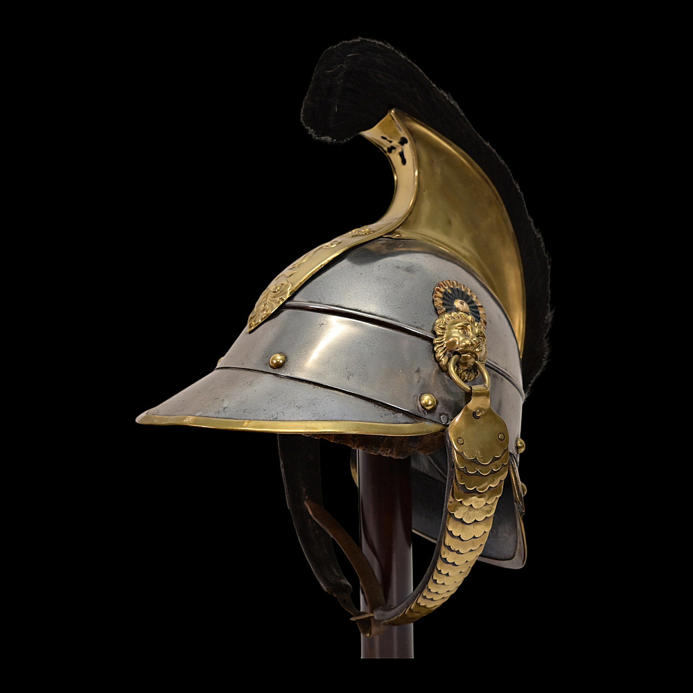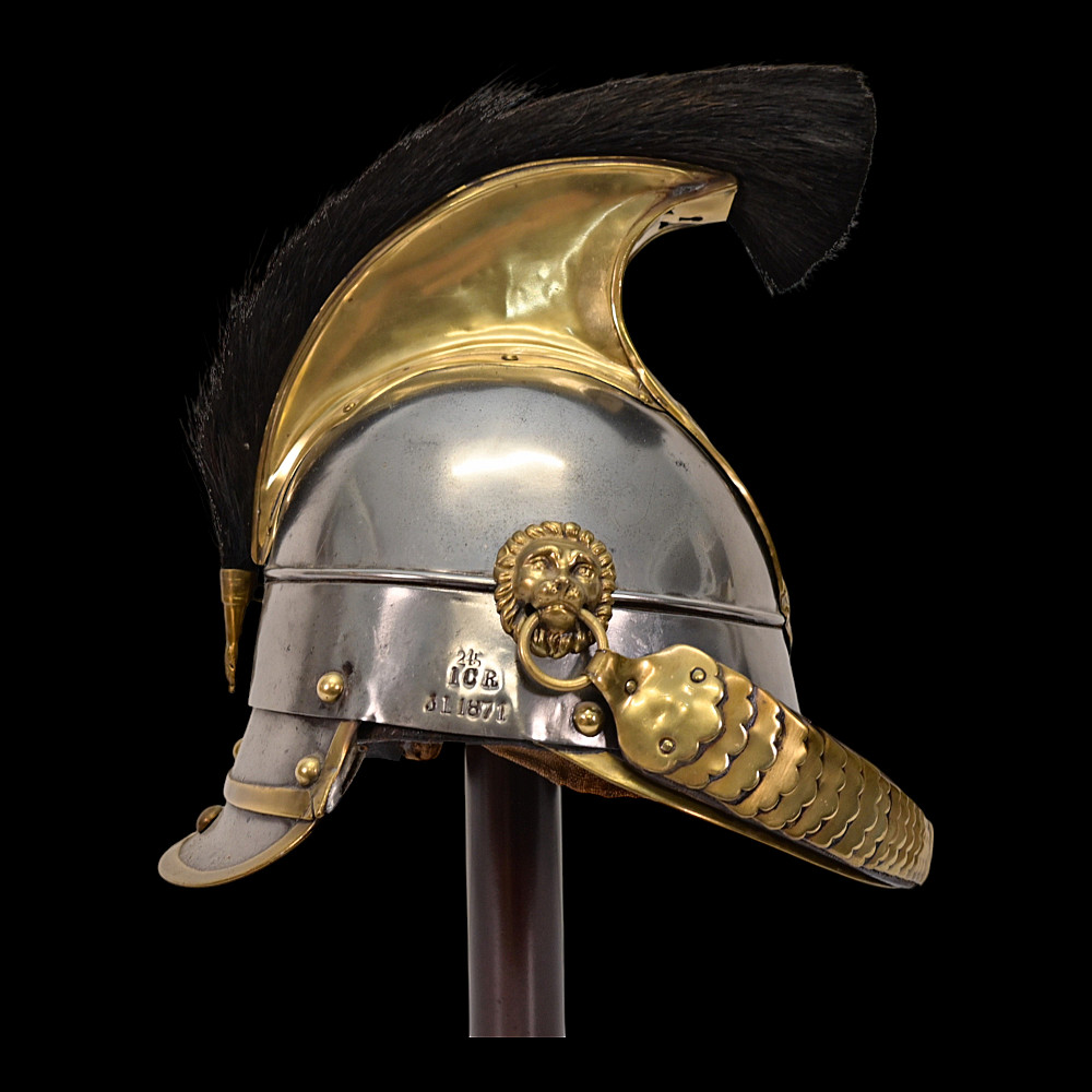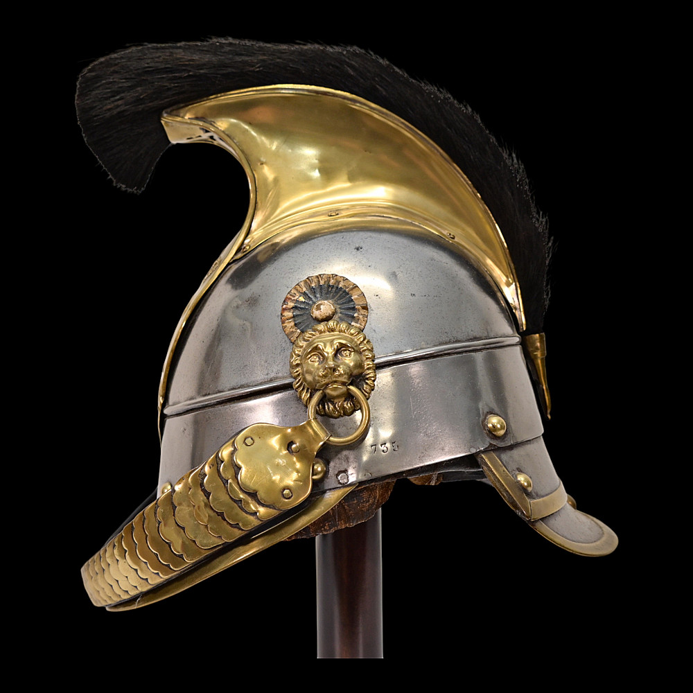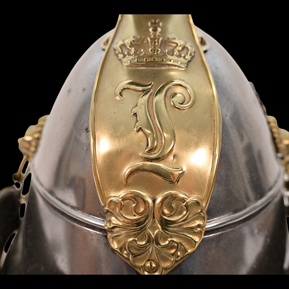 Bavarian Cuirassier Helmet, Model 1842 (Ludwig I Period, ca. 1842 - 1848). A fine and scarce example of the Bavarian heavy-cavalry helmet introduced in 1842 for cuirassier regiments serving under King Ludwig I of Bavaria. Constructed of bright polished steel with brass fittings, this model reflects the transitional neoclassical design of mid-19th-century German heavy-cavalry headgear. Tall steel skull with gilt-brass comb and crest, surmounted by the royal Bavarian crowned cipher “L” (for Ludwig), finely chased and mounted to the front. The black horsehair mane runs along the crest’s upper ridge. Brass lion-mask bosses retain the scaled chin-chains; the left boss bears the Bavarian cockade. Brim edged in brass, the underside of the front visor painted dark green. Interior lined in leather. Stamped on the shell with various issue marks: “245 I C R / 31 1871” (indicating later regimental reissue after unification), plus additional assembly numbers “614” and “735.” Condition: Very good for its age; light surface oxidation, wear to the leather lining, brass mounts with warm patina; overall a well-preserved and fully original example. Dimensions: approx. 32 cm high.