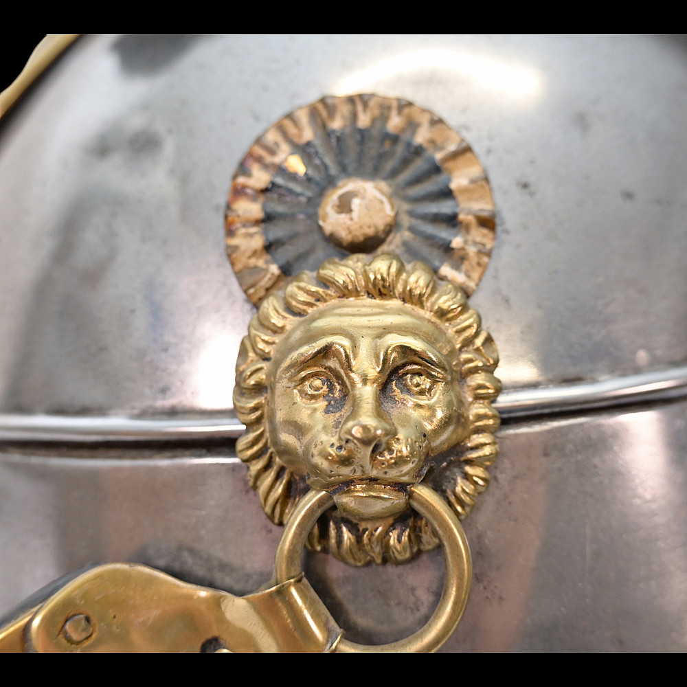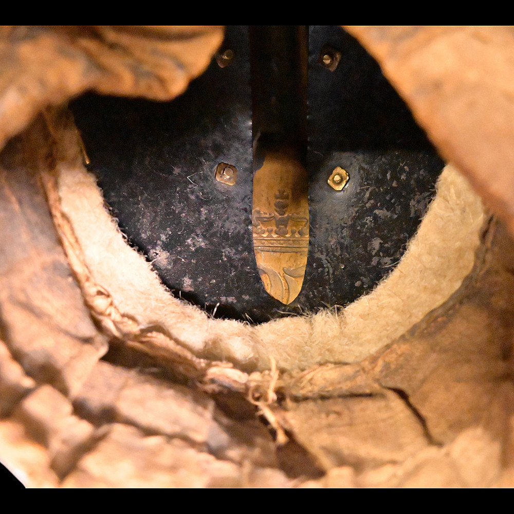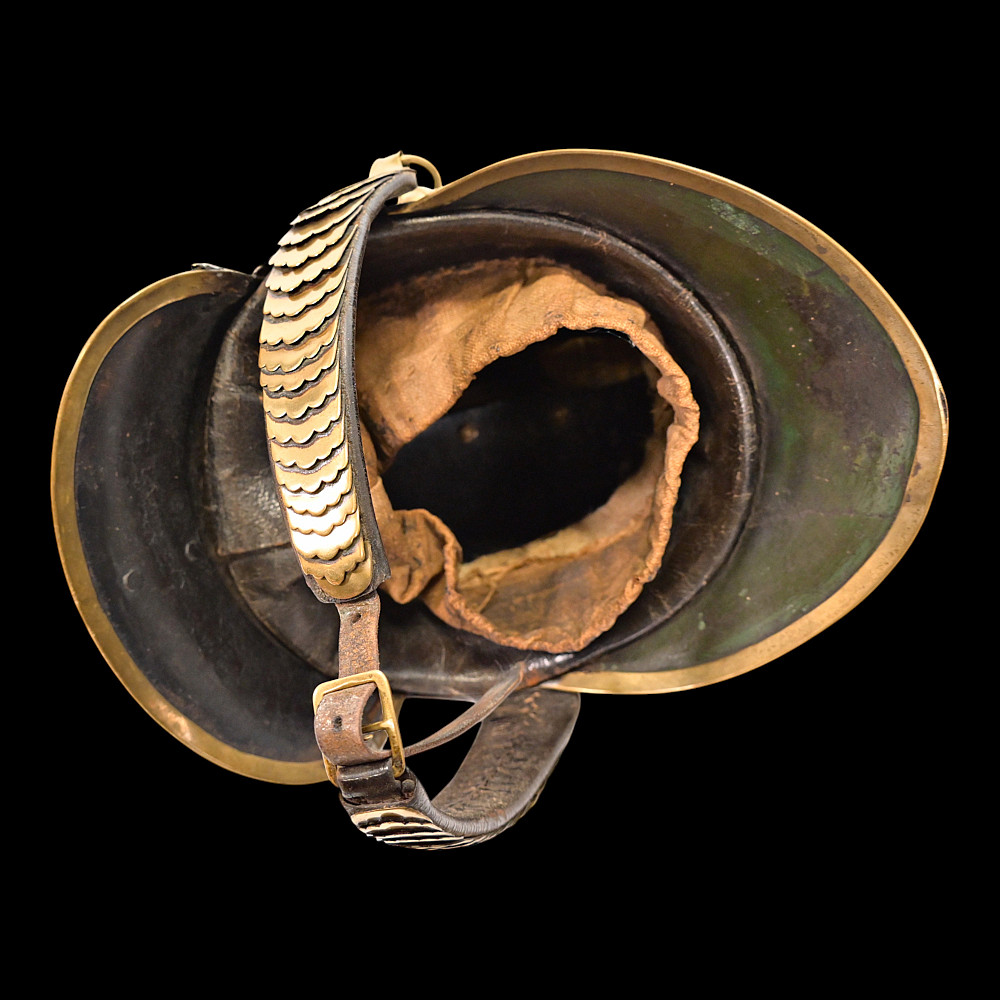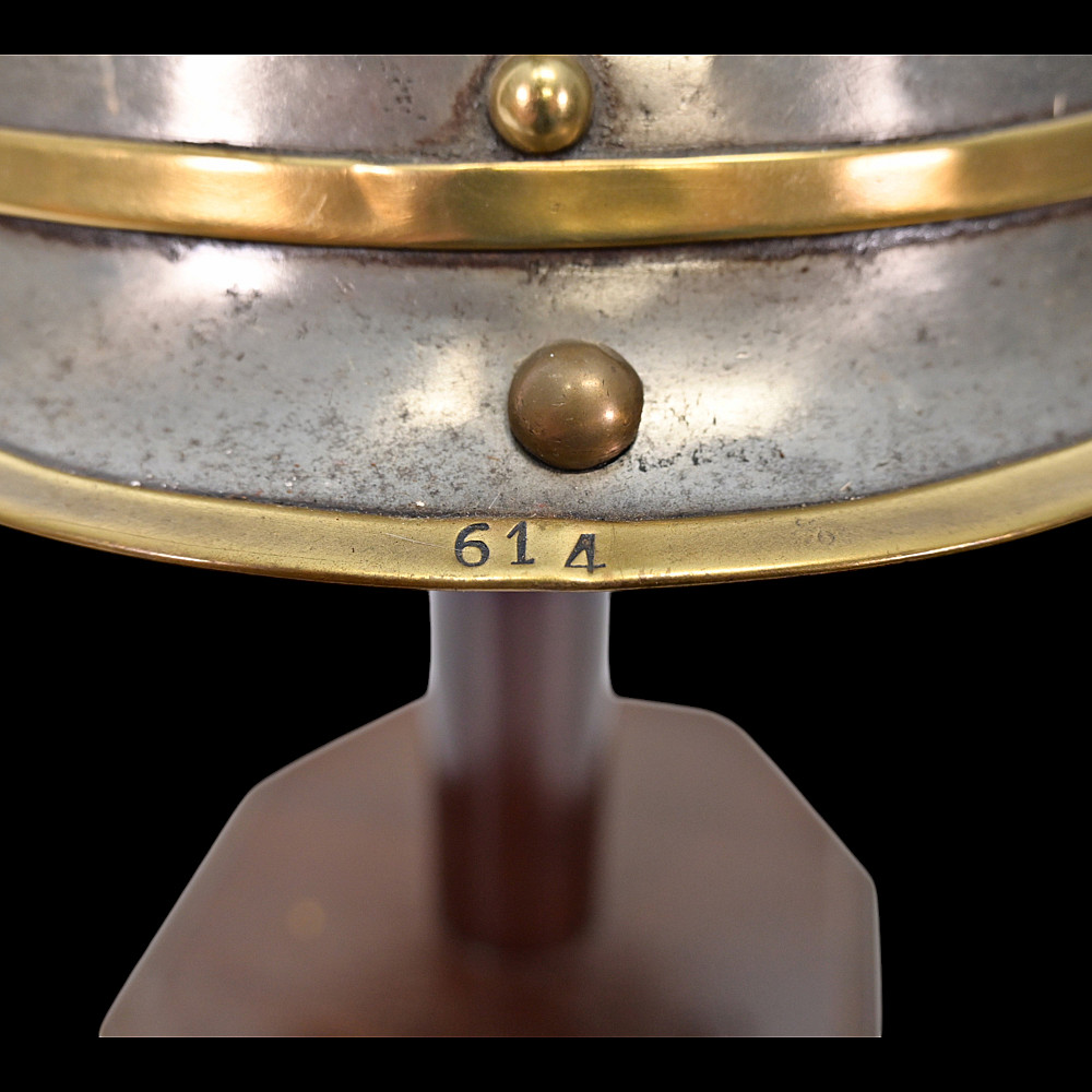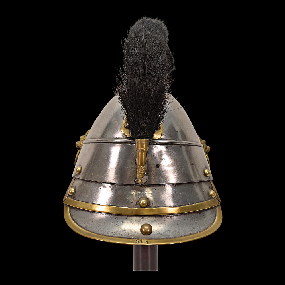 Bavarian Cuirassier Helmet, Model 1842 (Ludwig I Period, ca. 1842 - 1848). A fine and scarce example of the Bavarian heavy-cavalry helmet introduced in 1842 for cuirassier regiments serving under King Ludwig I of Bavaria. Constructed of bright polished steel with brass fittings, this model reflects the transitional neoclassical design of mid-19th-century German heavy-cavalry headgear. Tall steel skull with gilt-brass comb and crest, surmounted by the royal Bavarian crowned cipher “L” (for Ludwig), finely chased and mounted to the front. The black horsehair mane runs along the crest’s upper ridge. Brass lion-mask bosses retain the scaled chin-chains; the left boss bears the Bavarian cockade. Brim edged in brass, the underside of the front visor painted dark green. Interior lined in leather. Stamped on the shell with various issue marks: “245 I C R / 31 1871” (indicating later regimental reissue after unification), plus additional assembly numbers “614” and “735.” Condition: Very good for its age; light surface oxidation, wear to the leather lining, brass mounts with warm patina; overall a well-preserved and fully original example. Dimensions: approx. 32 cm high.