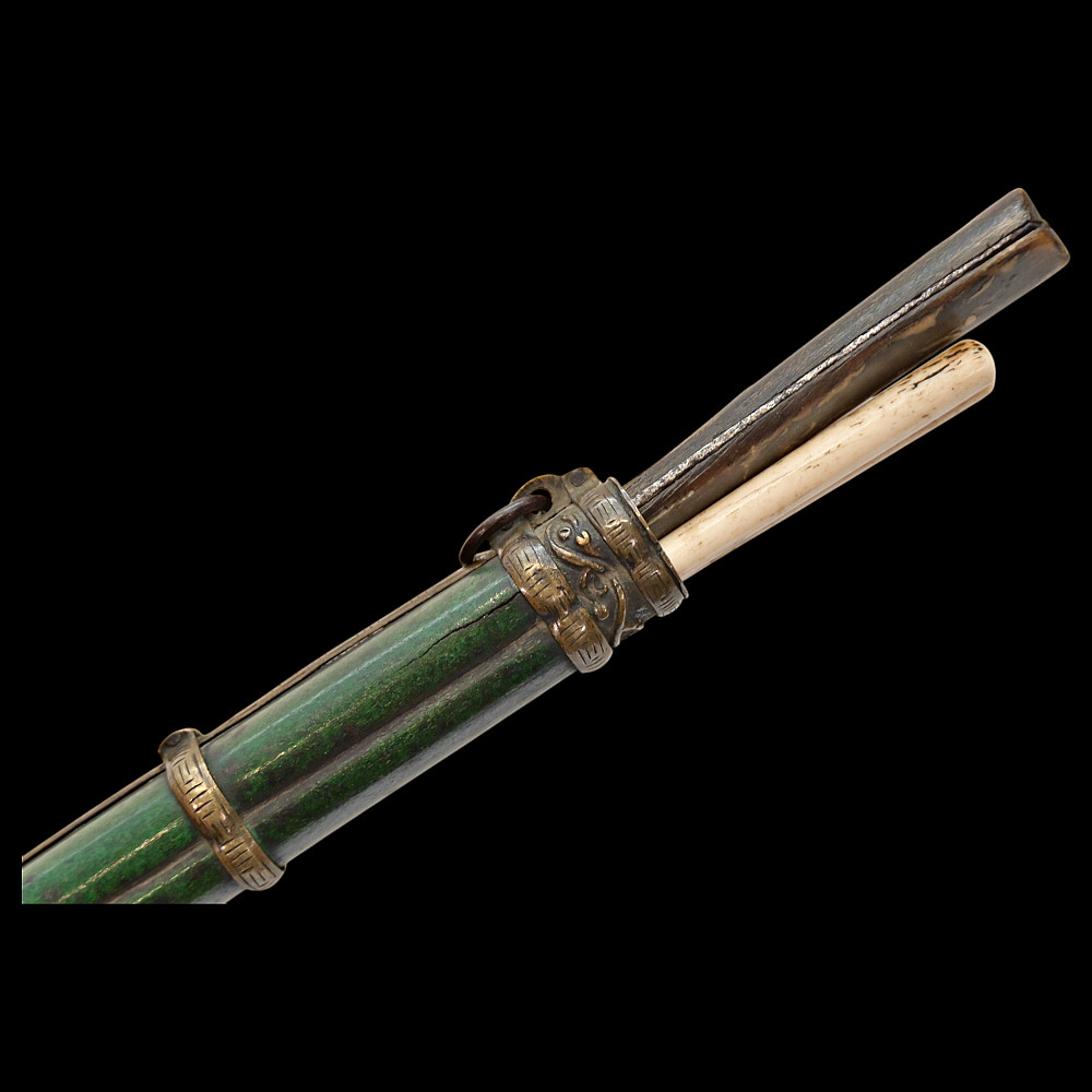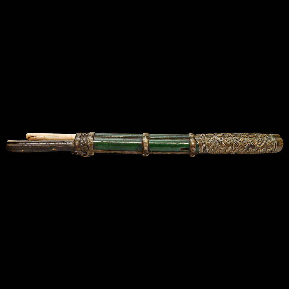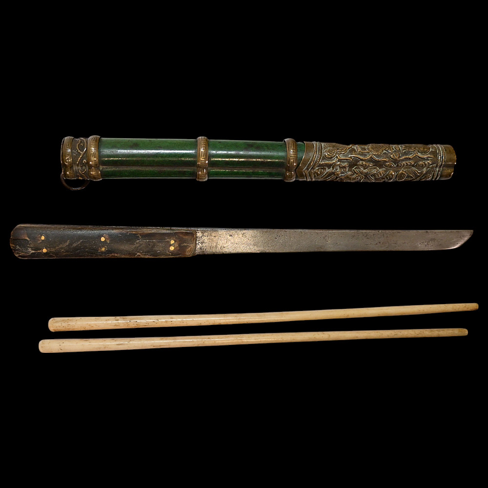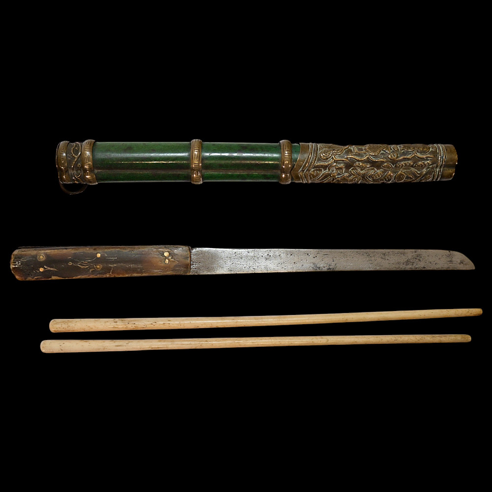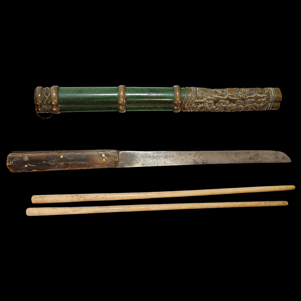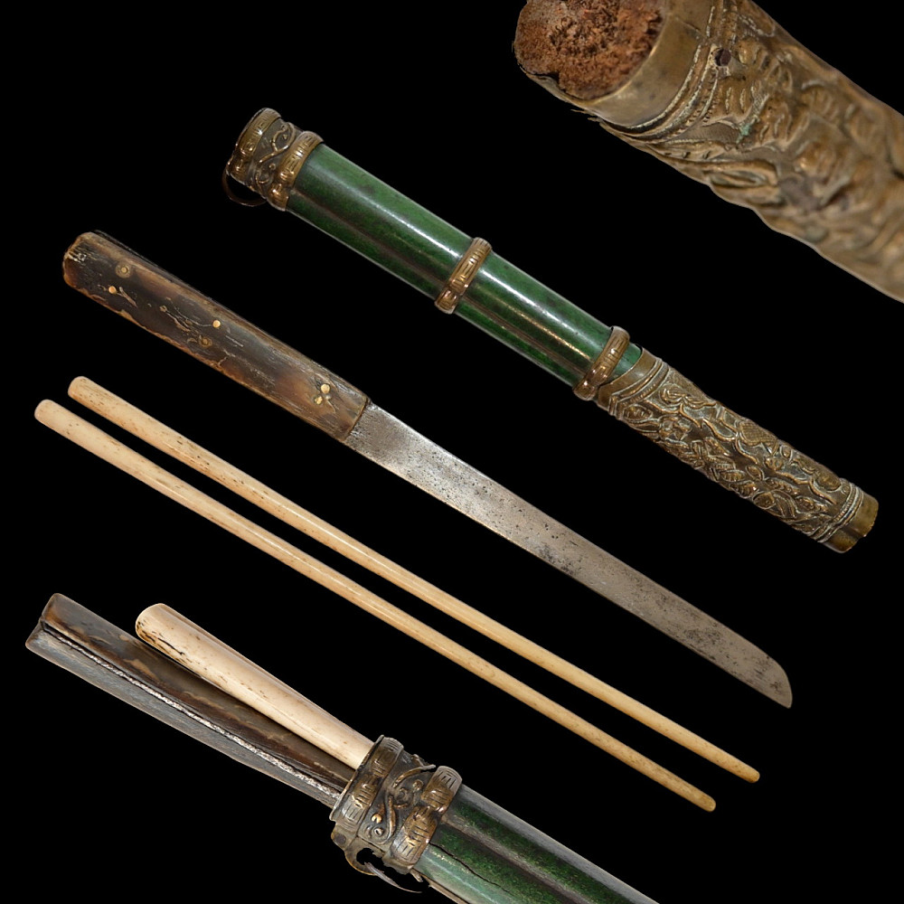 Chinese Bone Chopsticks & Steel Knife, Travel Set circa 1900. A horny grip steel knife, leather sheath dyed green to imitate jade. The bronze fittings of the sheath are decorated with beautiful embossed patterns in the traditional Chinese style. A wonderful travel set circa 1900. Good condition with light age related wear. Length 27 cm.