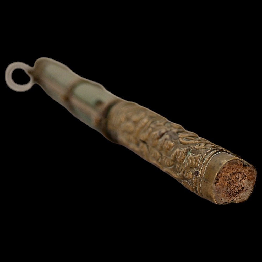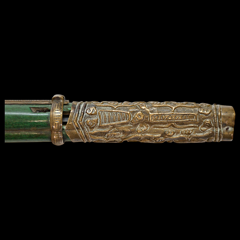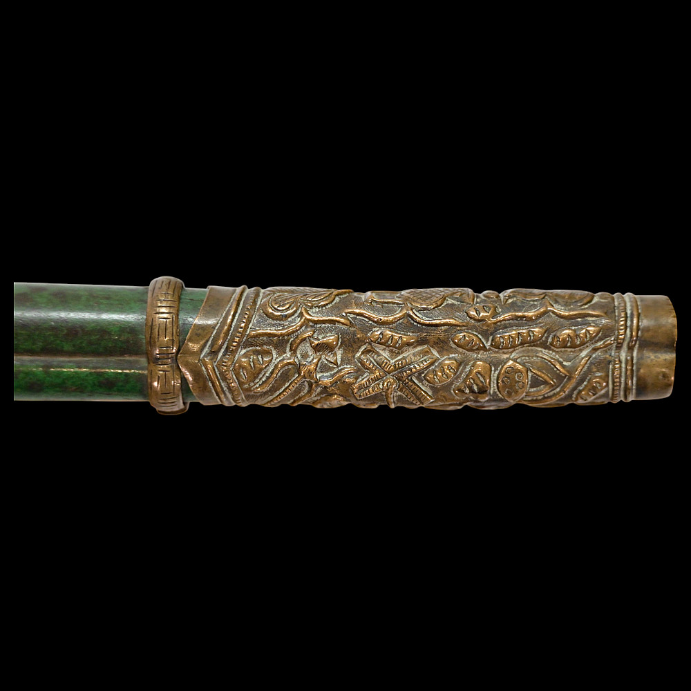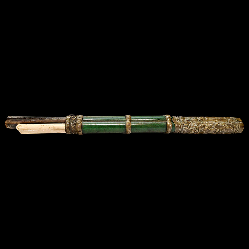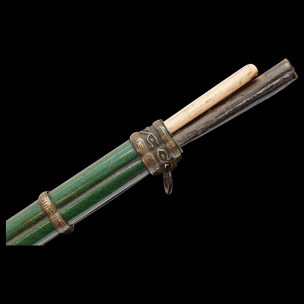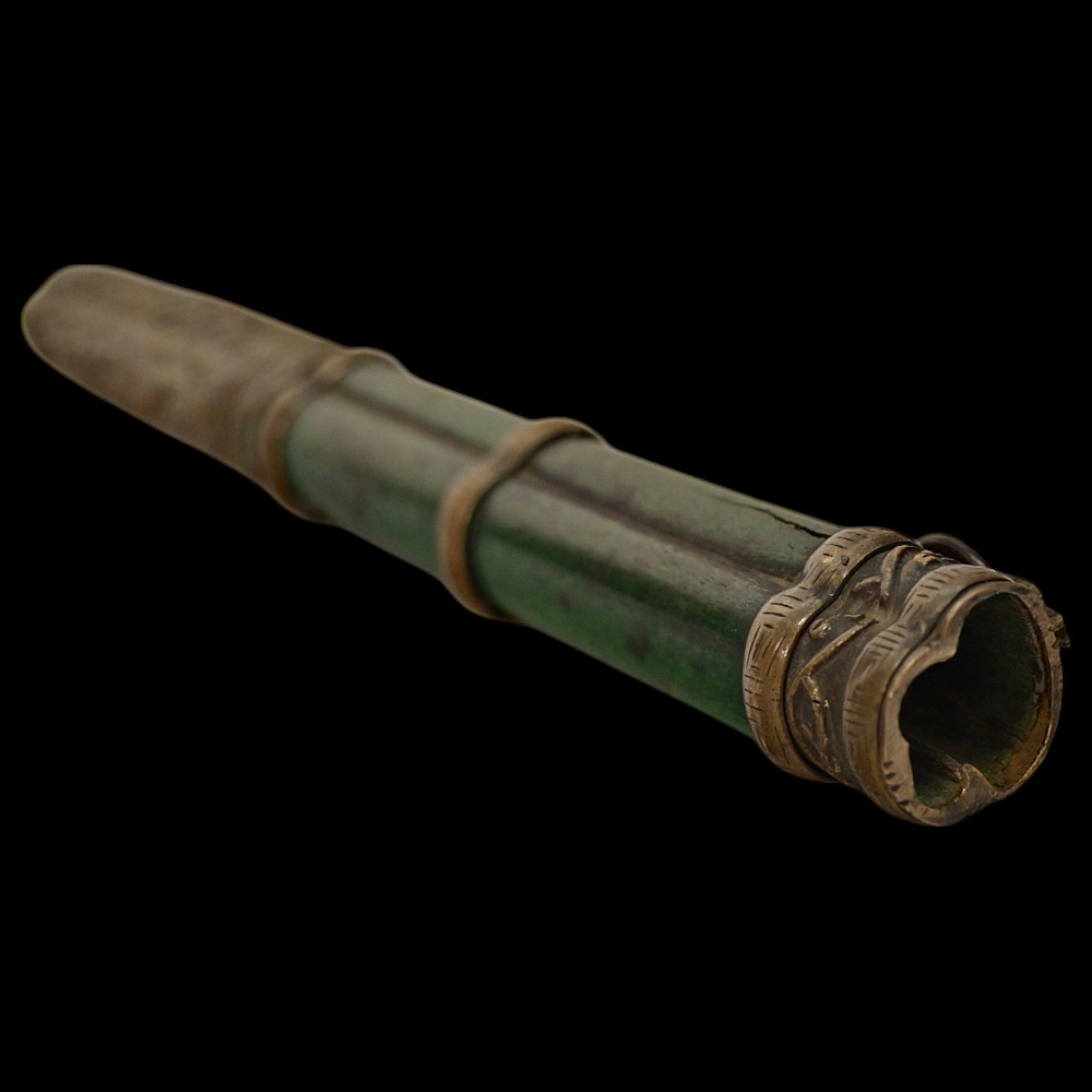 Chinese Bone Chopsticks & Steel Knife, Travel Set circa 1900. A horny grip steel knife, leather sheath dyed green to imitate jade. The bronze fittings of the sheath are decorated with beautiful embossed patterns in the traditional Chinese style. A wonderful travel set circa 1900. Good condition with light age related wear. Length 27 cm.