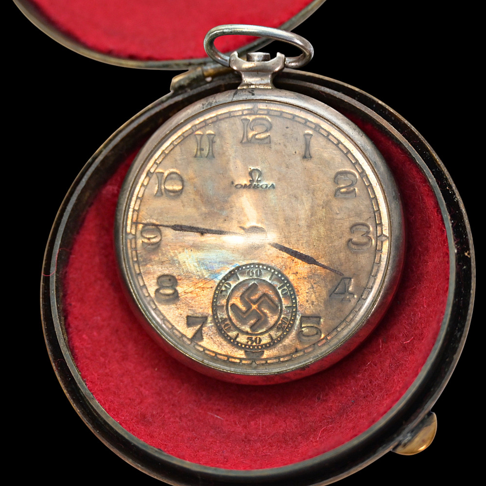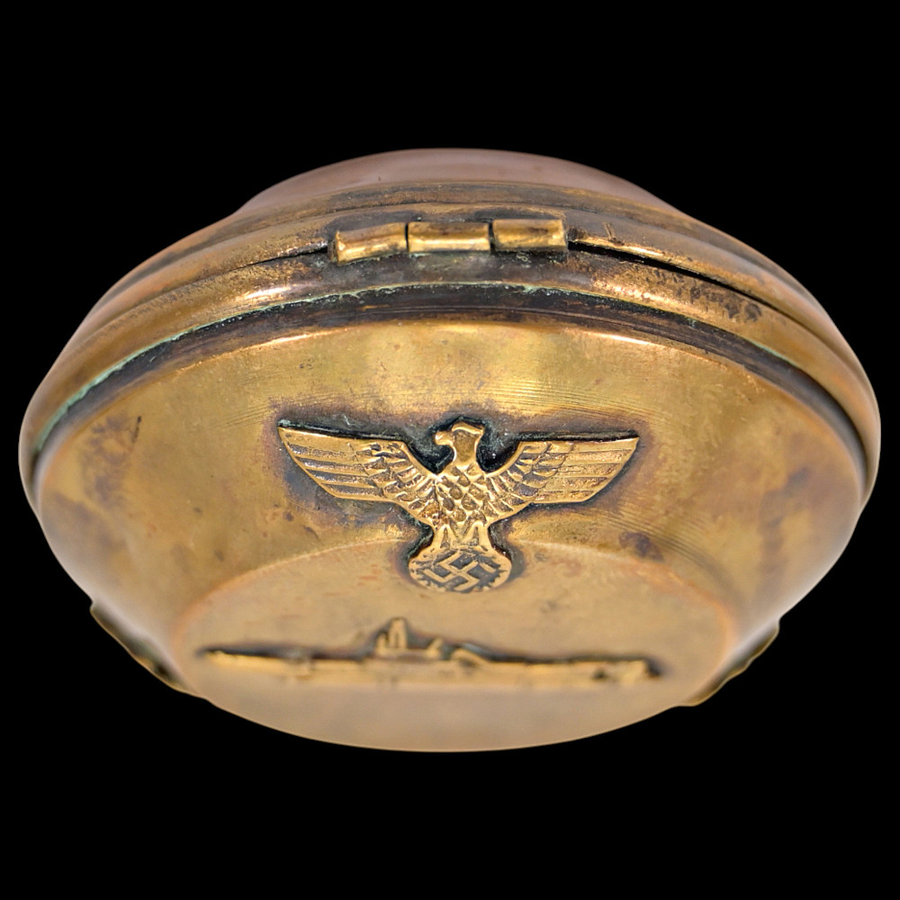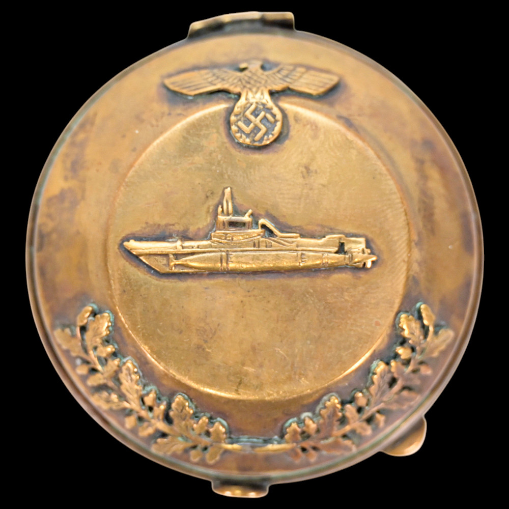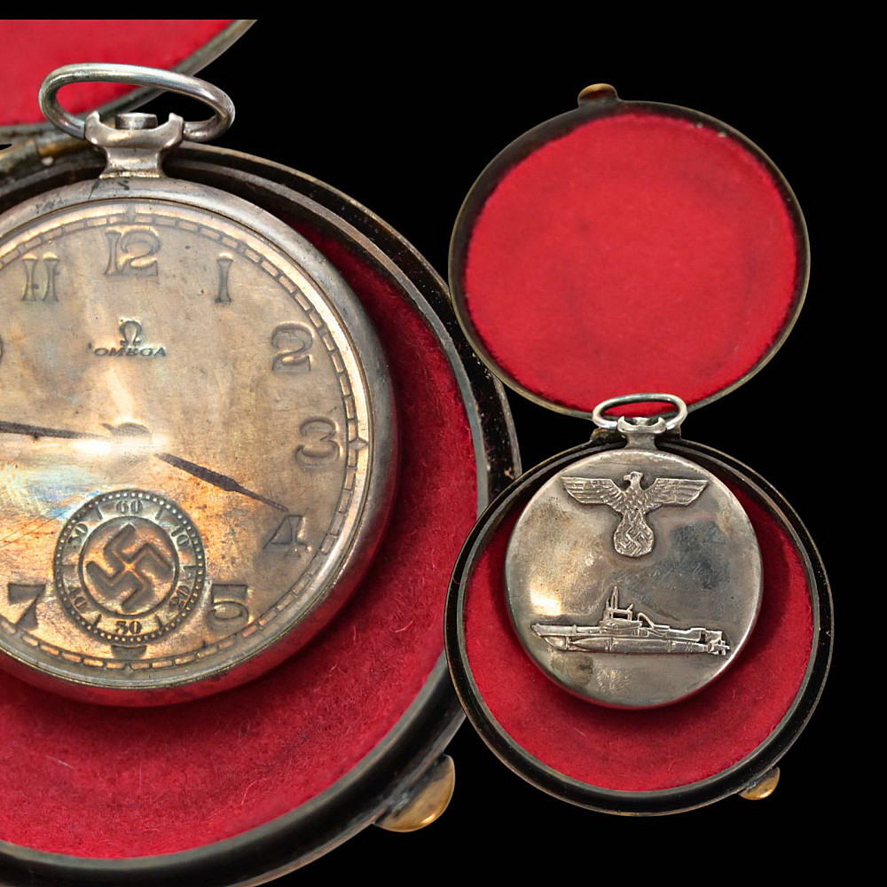 Commemorative Pocket Watch, Kriegsmarine U-Boat Command, 1940, Nazi Germany, Third Reich. A German commemorative pocket watch presented circa 1940, associated with the Kriegsmarine submarine (U-Boot) service, preserved together with its original brass presentation case.The watch case is silver-plated, the obverse featuring a submarine in relief, set upon a large emblematic geometric background, the reverse engraved with “1940 / 5314.” The dial displays Roman numerals with subsidiary seconds dial and emblematic "OMEGA". The presentation case is made of brass with dark blue velvet lining, the exterior decorated with the submarine motif and eagle insignia in relief. Condition: good. Watch diameter: approximately 4.2 cm. Case diameter: approximately 6.2 cm.