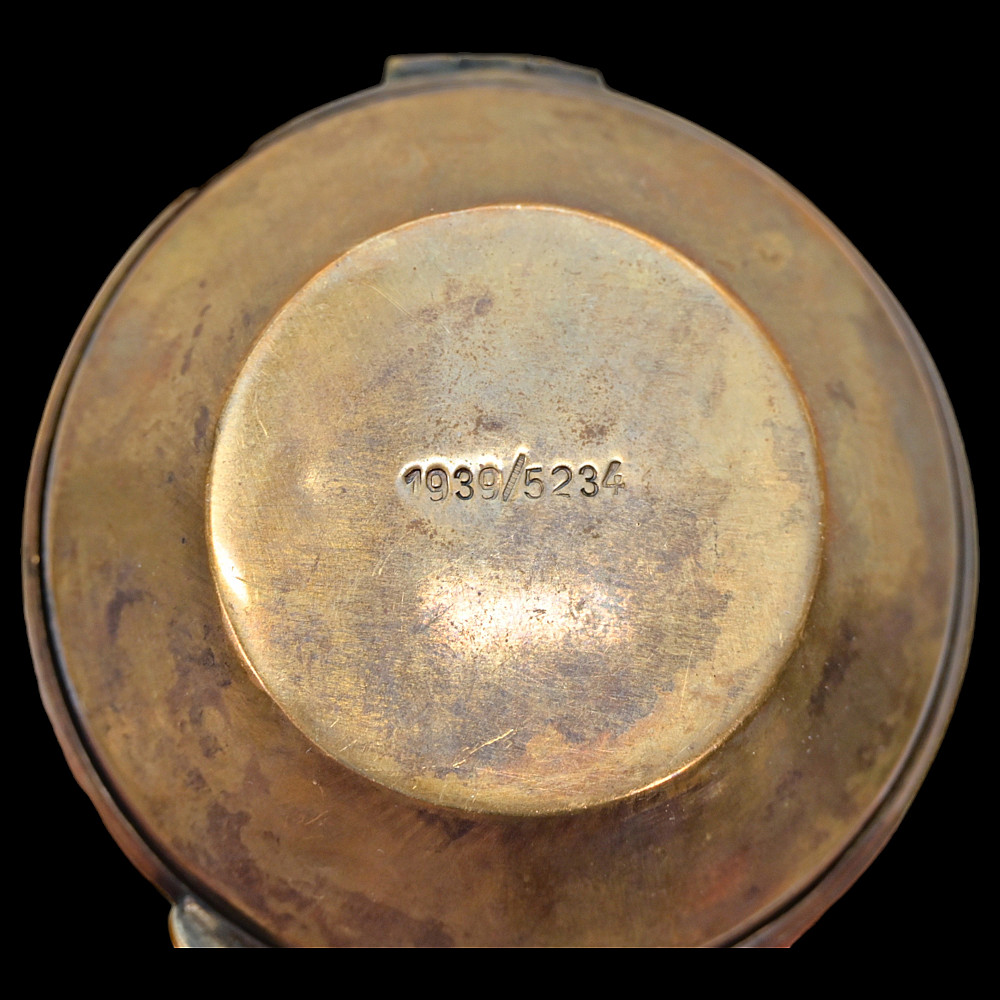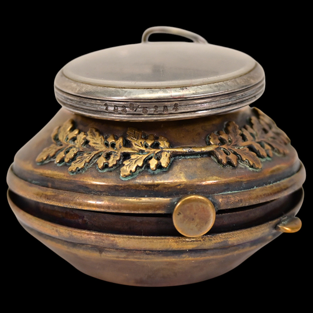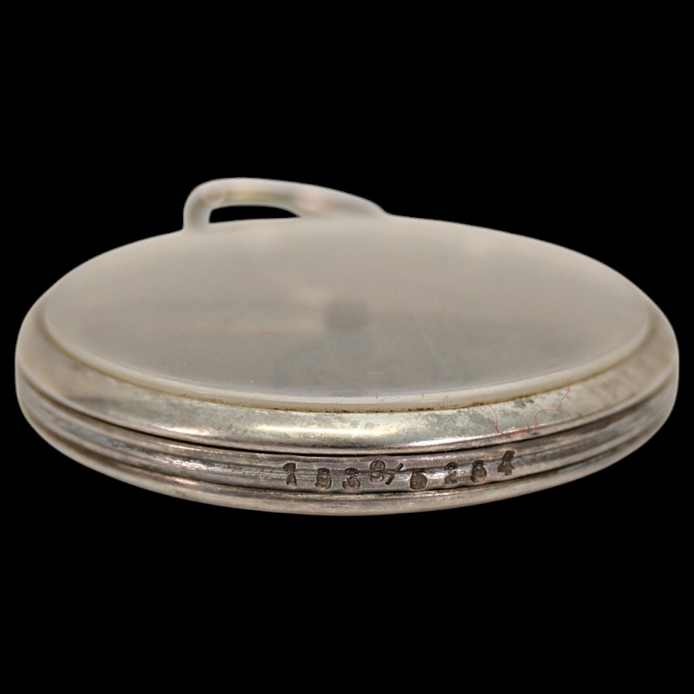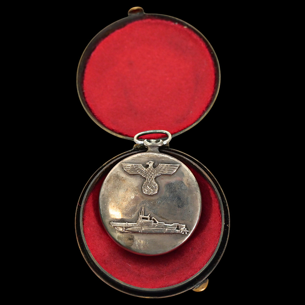 Commemorative Pocket Watch, Kriegsmarine U-Boat Command, 1940, Nazi Germany, Third Reich. A German commemorative pocket watch presented circa 1940, associated with the Kriegsmarine submarine (U-Boot) service, preserved together with its original brass presentation case.The watch case is silver-plated, the obverse featuring a submarine in relief, set upon a large emblematic geometric background, the reverse engraved with “1940 / 5314.” The dial displays Roman numerals with subsidiary seconds dial and emblematic "OMEGA". The presentation case is made of brass with dark blue velvet lining, the exterior decorated with the submarine motif and eagle insignia in relief. Condition: good. Watch diameter: approximately 4.2 cm. Case diameter: approximately 6.2 cm.