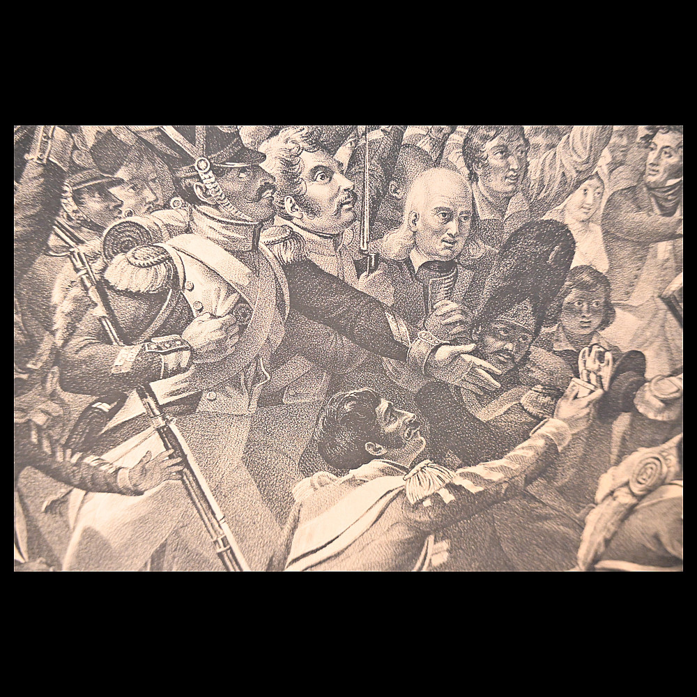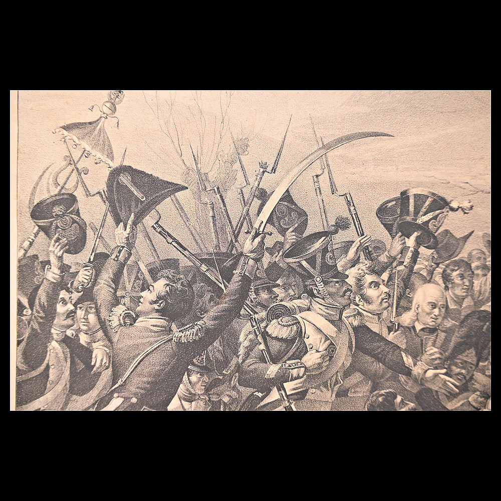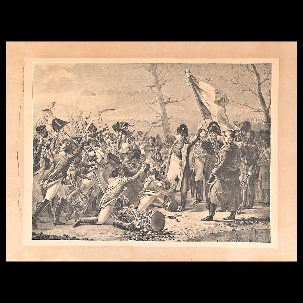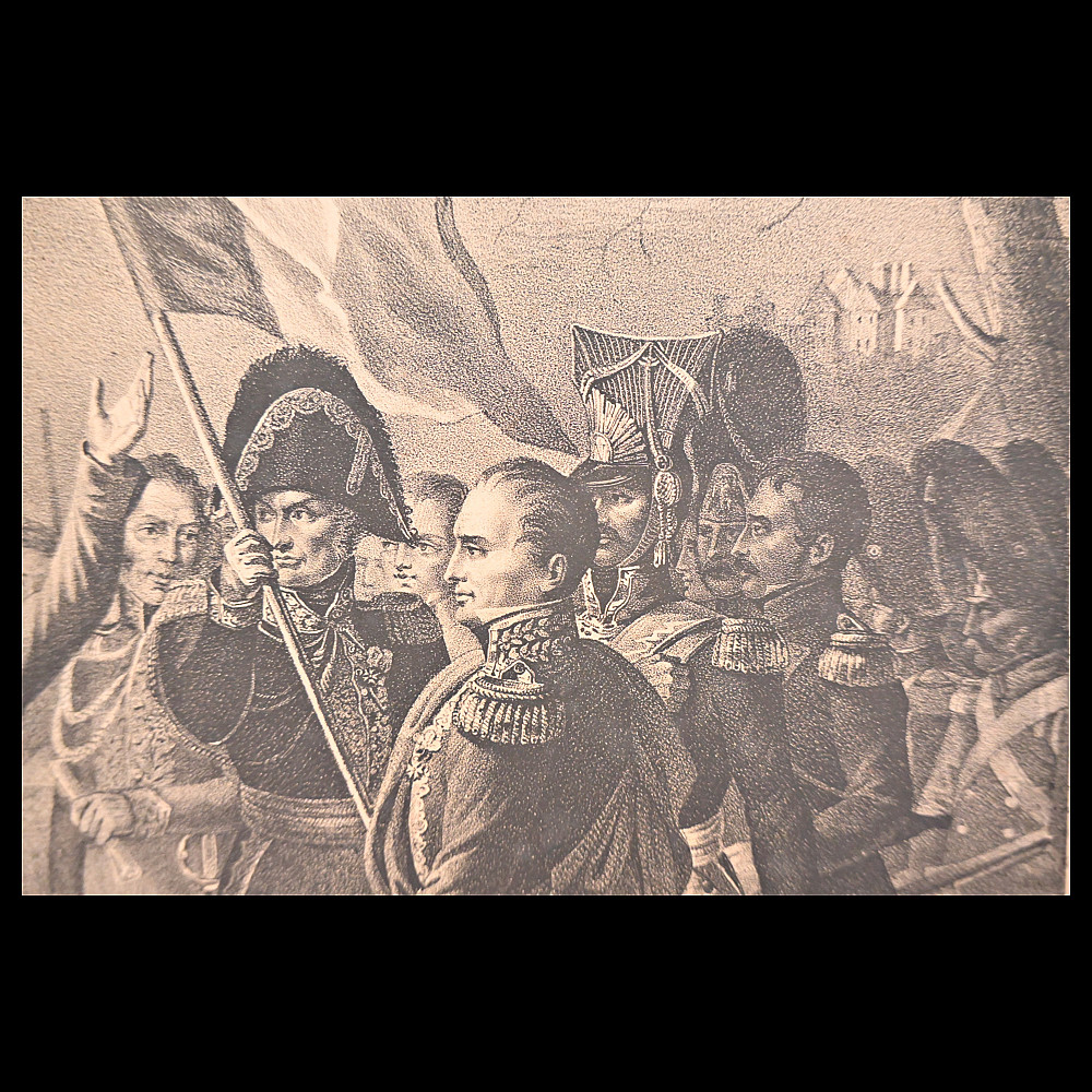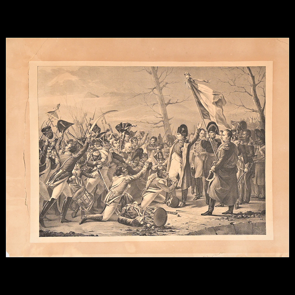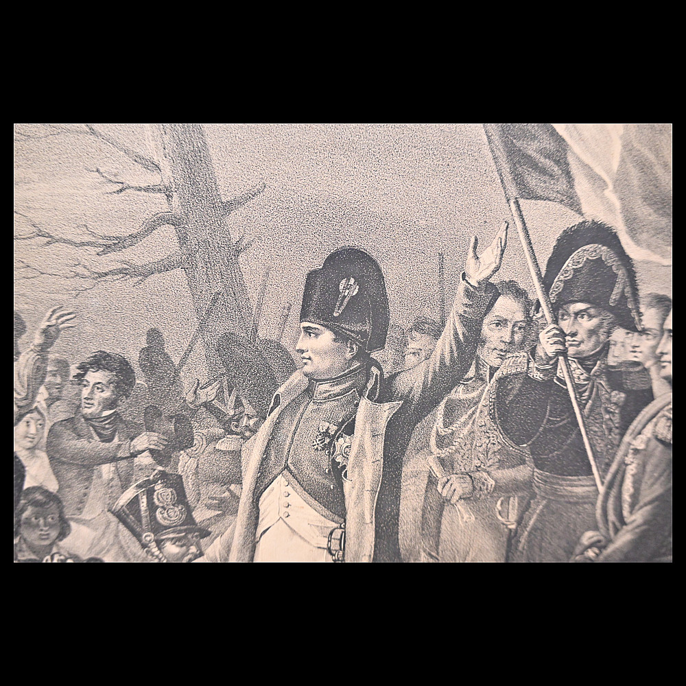 Engraving, Napoleon's return from the island of Elba with cheering soldiers, 1815, 19th century. Engraving by George Sanders (1774-1846) after a painting by Charles Baron Von Steuben. The artwork shows a dramatic scene in which Napoleon is greeted by a cheering crowd. Napoleon stands in the centre, surrounded by soldiers and flags, indicating his military and political importance. The scene conveys dynamism and combines historical and iconographic elements. A wonderful engraving for collectors and interior decoration. Minor damage, see photo. Overall size 48x64 cm.