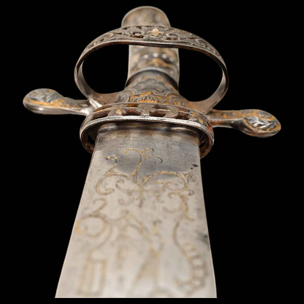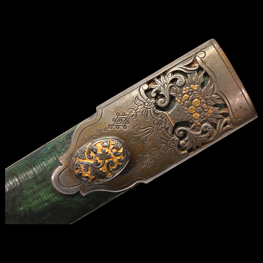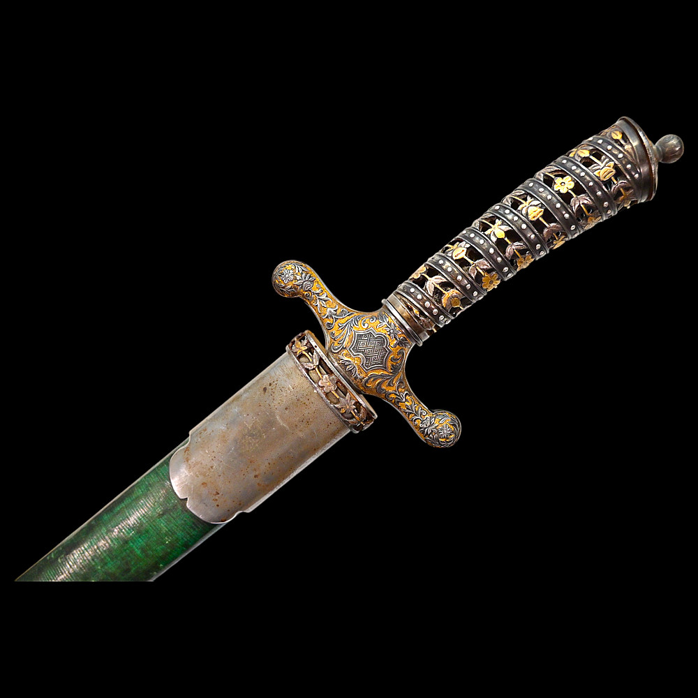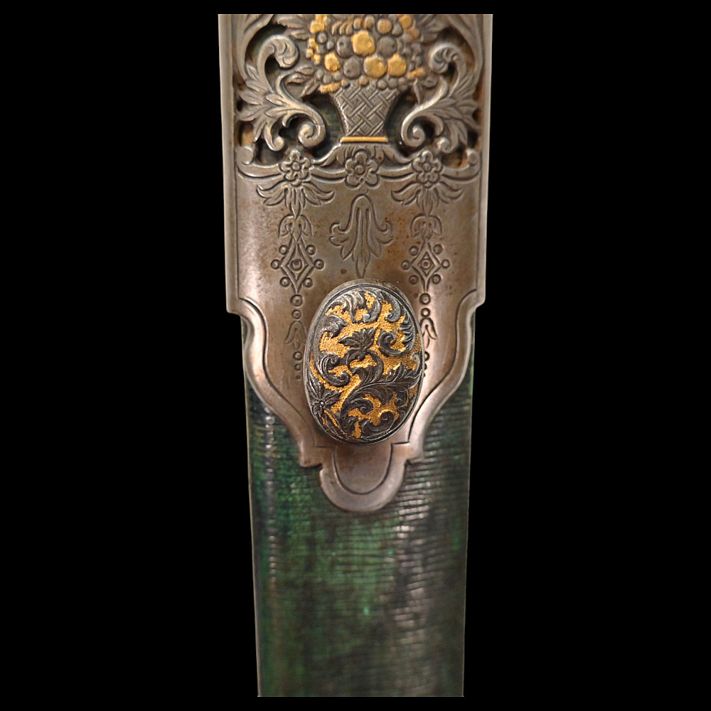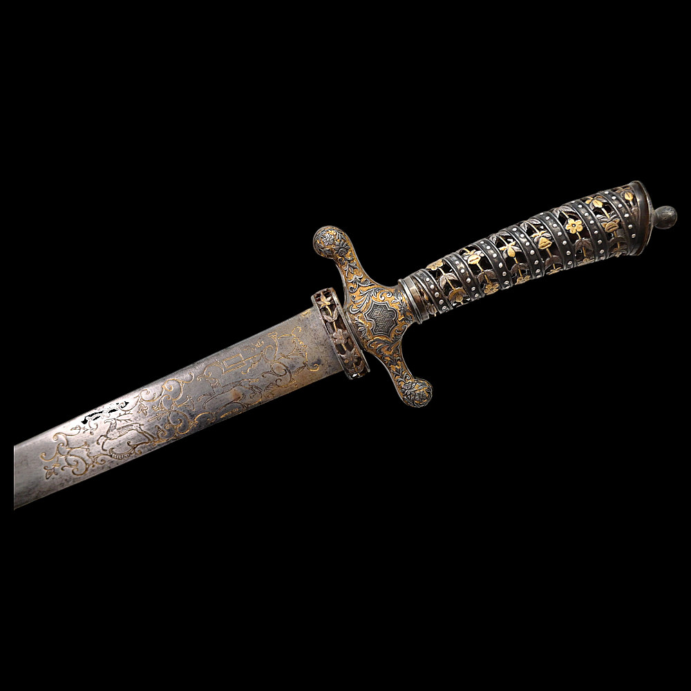 Extra quality hunting sword, engraving, gilding, France, 18th century. Straight, double-edged blade is decorated on both sides with engraved hunting scenes. Steel, figured hilt is richly decorated with volumetric engraving and gold, openwork handle is decorated with plant ornament. Green leather scabbard has magnificent steel fittings, decorated in the style of the handle. Very rare collectible hunting sword in excellent condition. Length 77 cm. See the same in Turin's Royal Armory