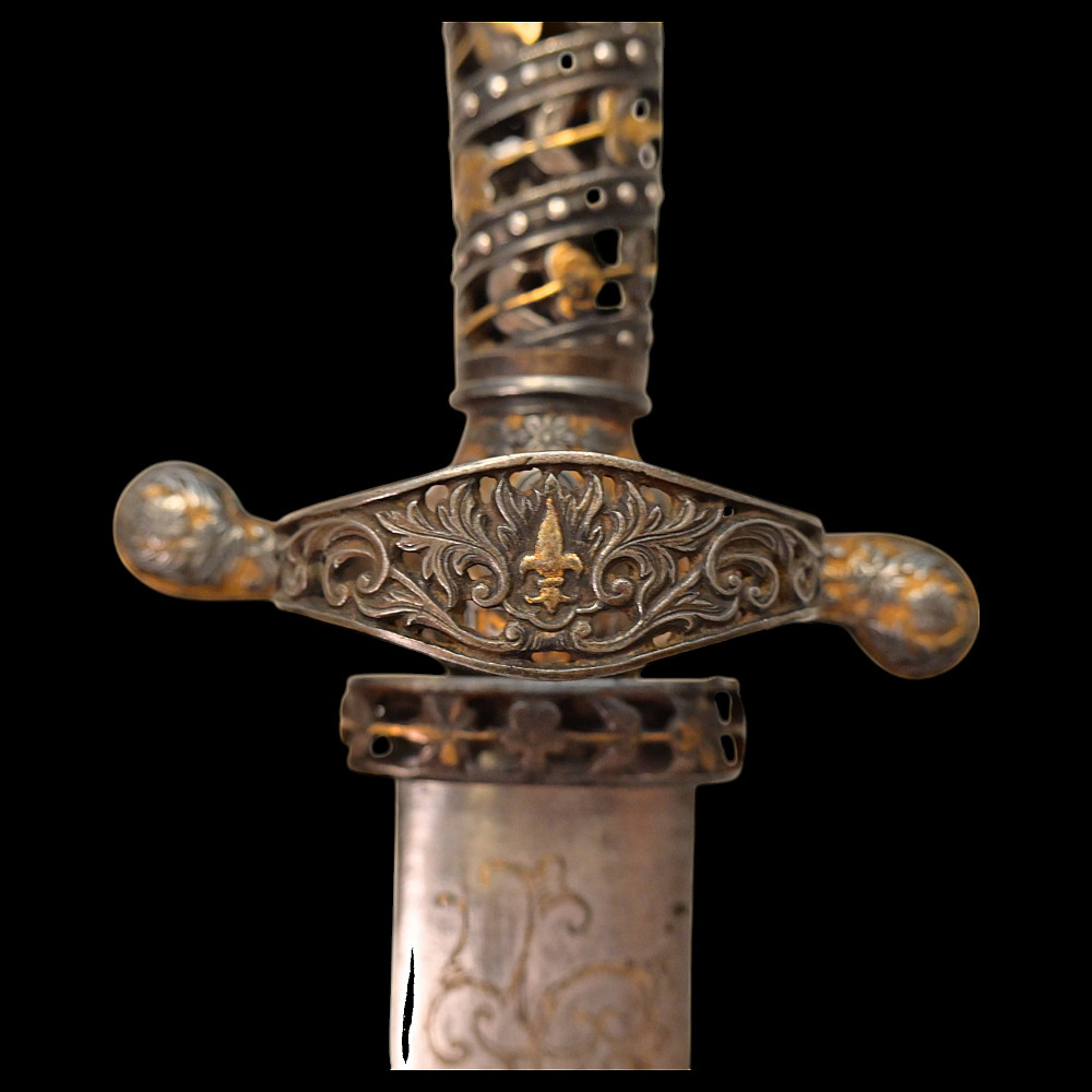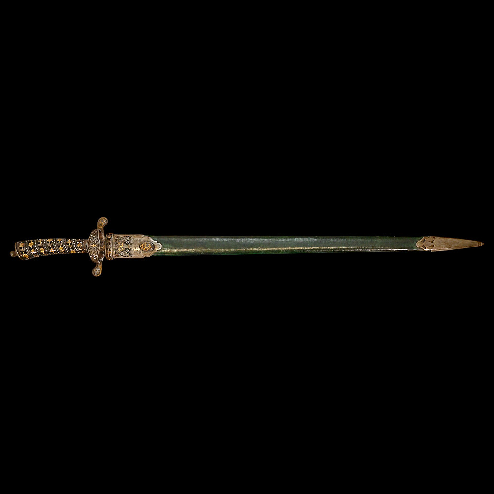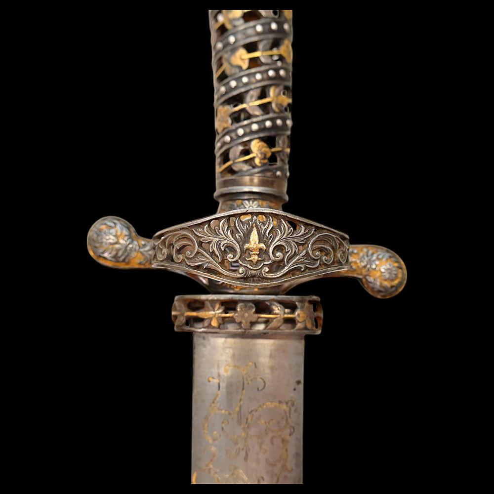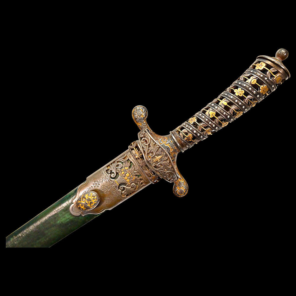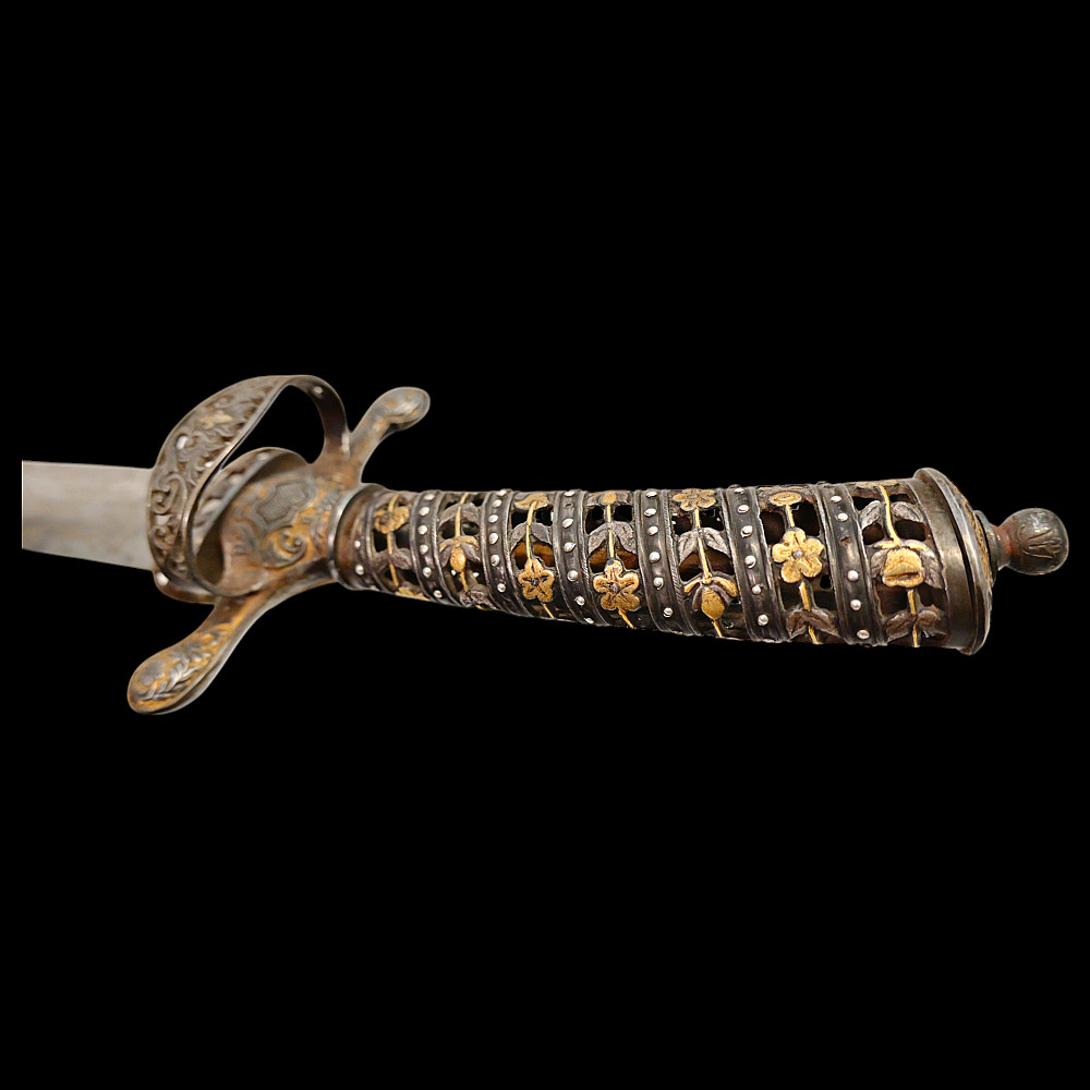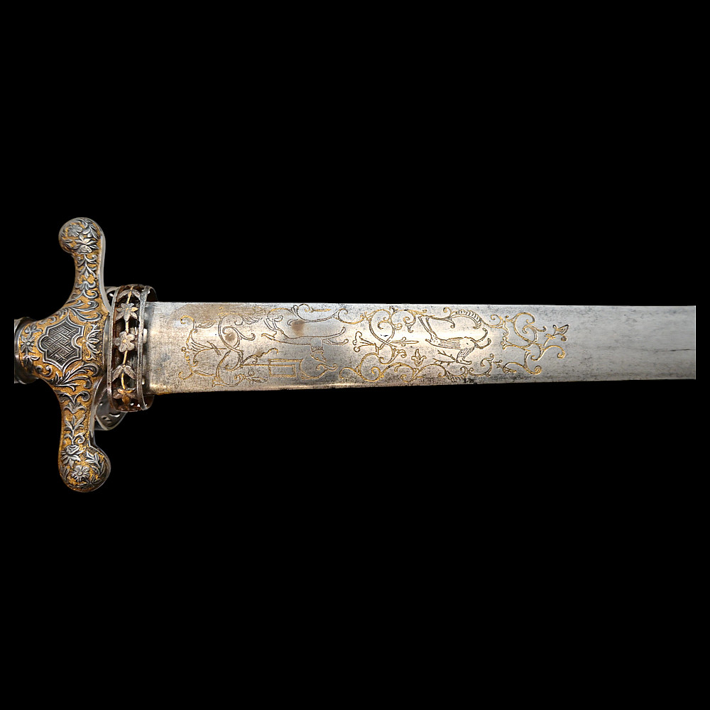 Extra quality hunting sword, engraving, gilding, France, 18th century. Straight, double-edged blade is decorated on both sides with engraved hunting scenes. Steel, figured hilt is richly decorated with volumetric engraving and gold, openwork handle is decorated with plant ornament. Green leather scabbard has magnificent steel fittings, decorated in the style of the handle. Very rare collectible hunting sword in excellent condition. Length 77 cm. See the same in Turin's Royal Armory
