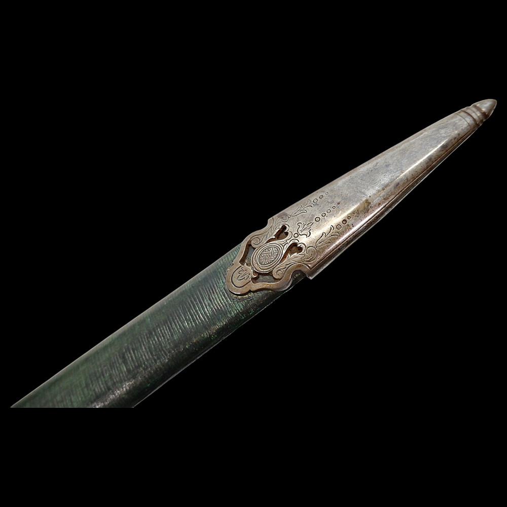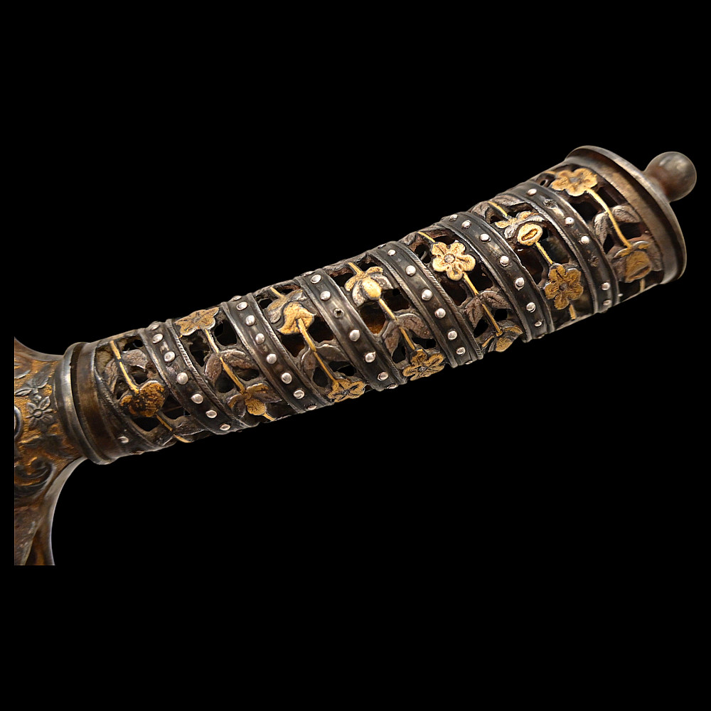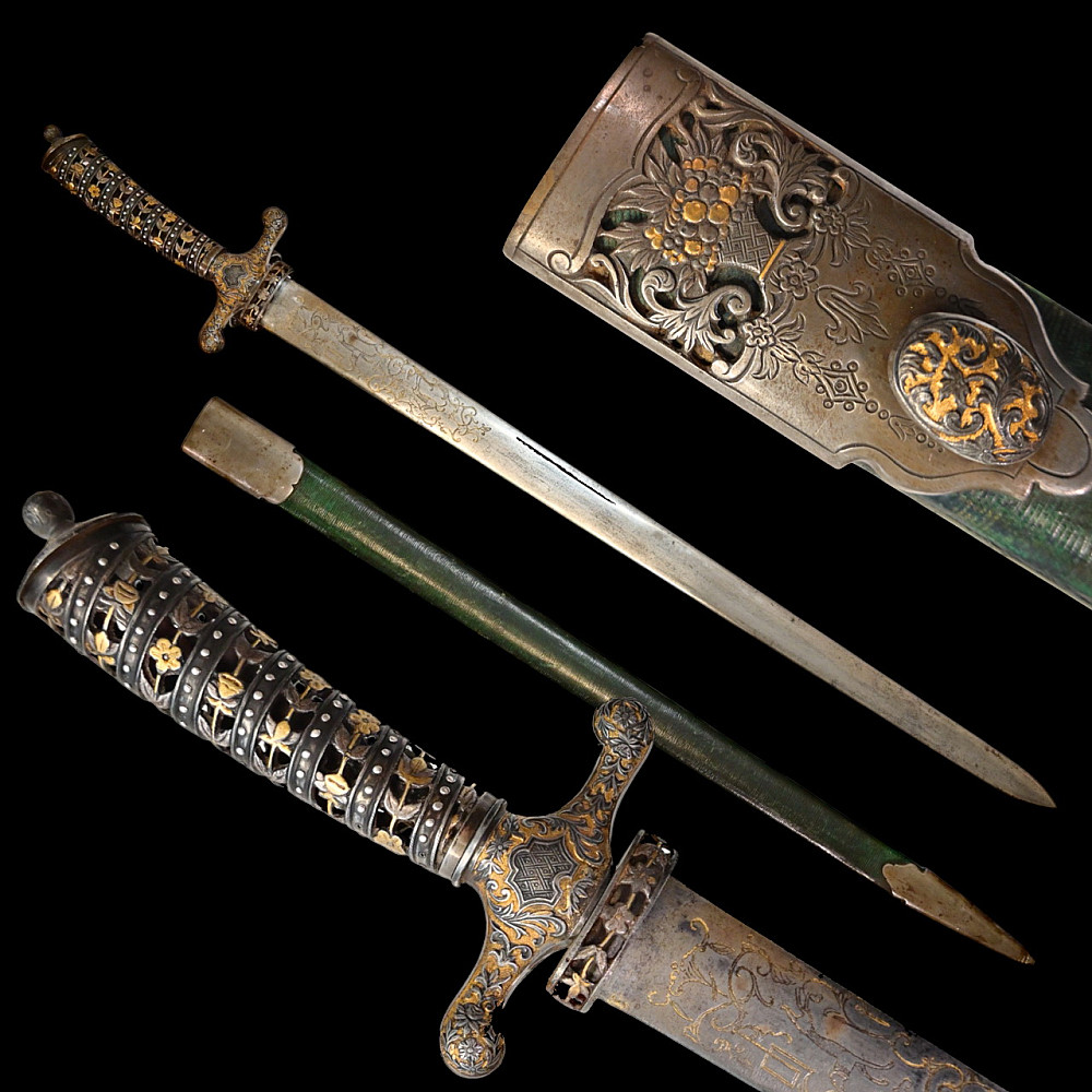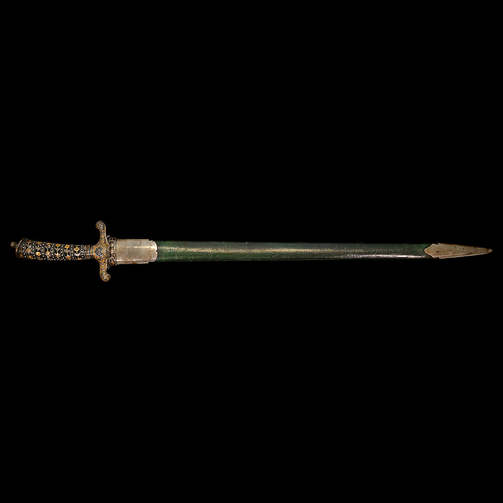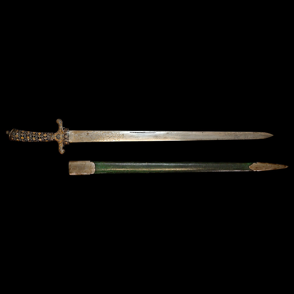 Extra quality hunting sword, engraving, gilding, France, 18th century. Straight, double-edged blade is decorated on both sides with engraved hunting scenes. Steel, figured hilt is richly decorated with volumetric engraving and gold, openwork handle is decorated with plant ornament. Green leather scabbard has magnificent steel fittings, decorated in the style of the handle. Very rare collectible hunting sword in excellent condition. Length 77 cm. See the same in Turin's Royal Armory