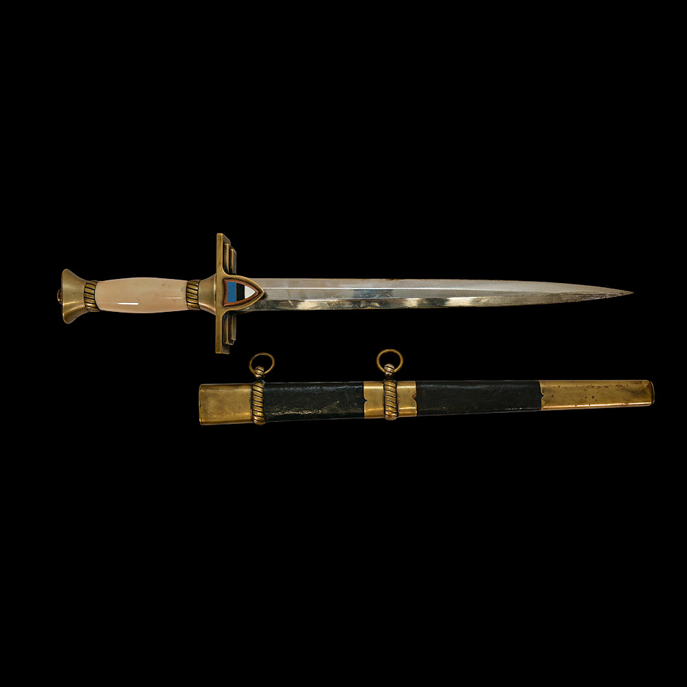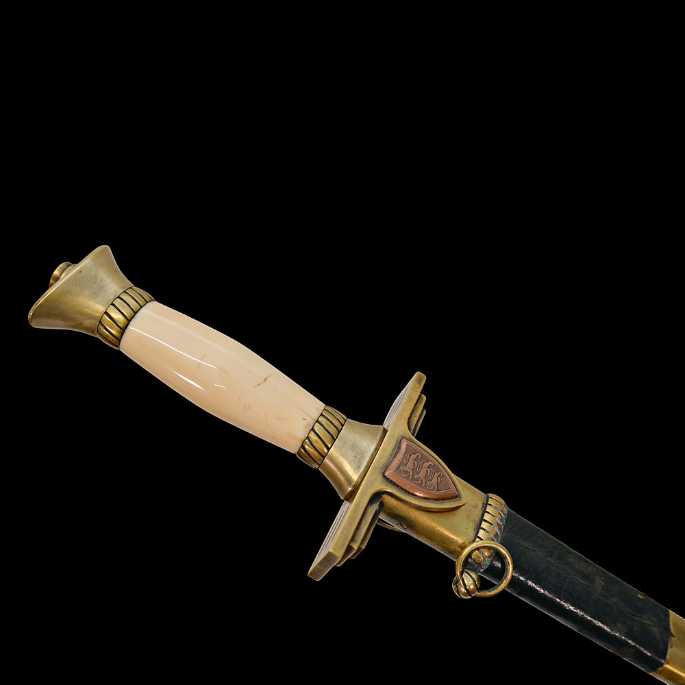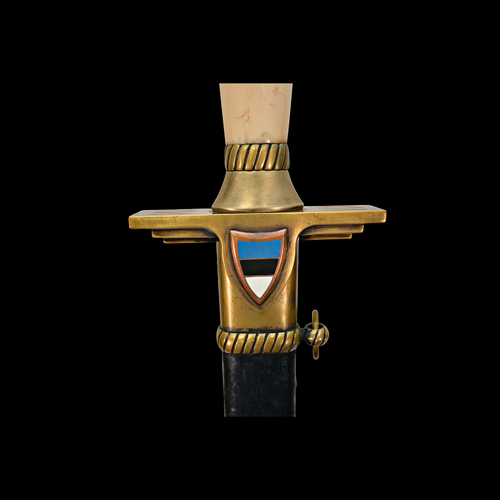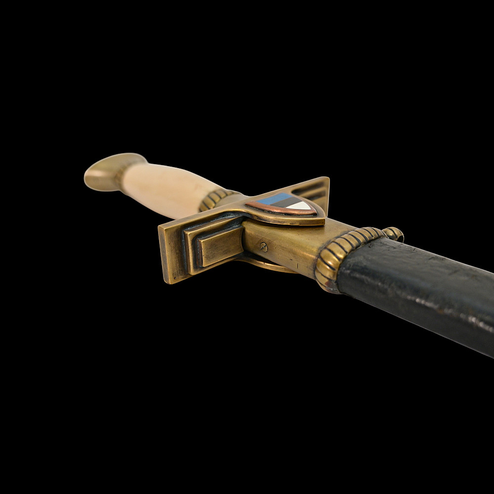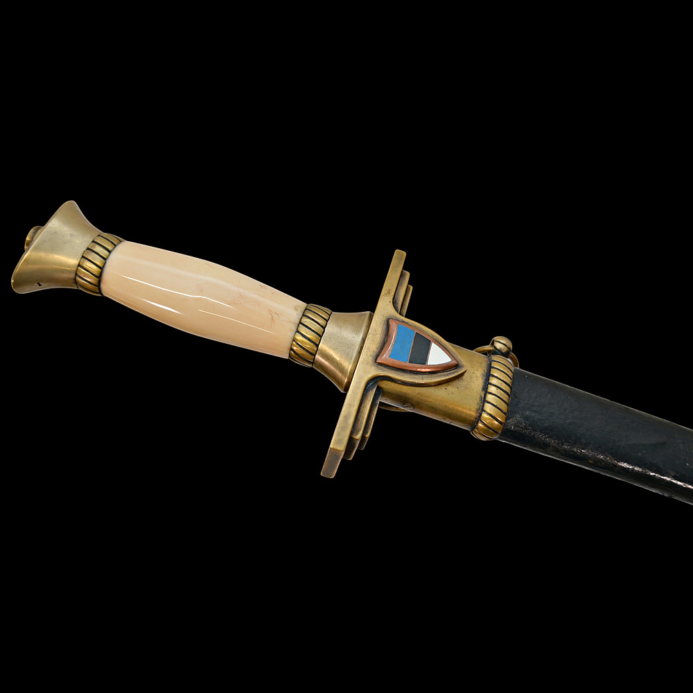 Extra Rare Estonian Officer's Dagger, First Republic Period (1918–1940). An exceptionally rare Estonian officer’s dress dagger, dating from the era of the First Republic of Estonia (1918–1940). These daggers were privately commissioned and carried by senior officers as symbols of national service and status. The dagger features a straight, double-edged blade housed in its original leather-covered brass scabbard with two suspension rings. The hilt is mounted in gilt brass with a finely polished bone grip, and the crossguard bears enamelled national shields—one side with the Estonian tricolor (blue, black, and white), the other with the coat of arms of Estonia, depicting three lions passant guardant. Elegant in proportion and refined in execution, this dagger reflects both the Art Deco influences of the interwar period and the patriotic spirit of the newly independent Estonian state. Such examples are exceedingly scarce, especially in complete and well-preserved condition. A highly desirable collector’s piece representing one of the rarest military daggers of the Baltic region. Good condition. Length: approx. 44 cm.