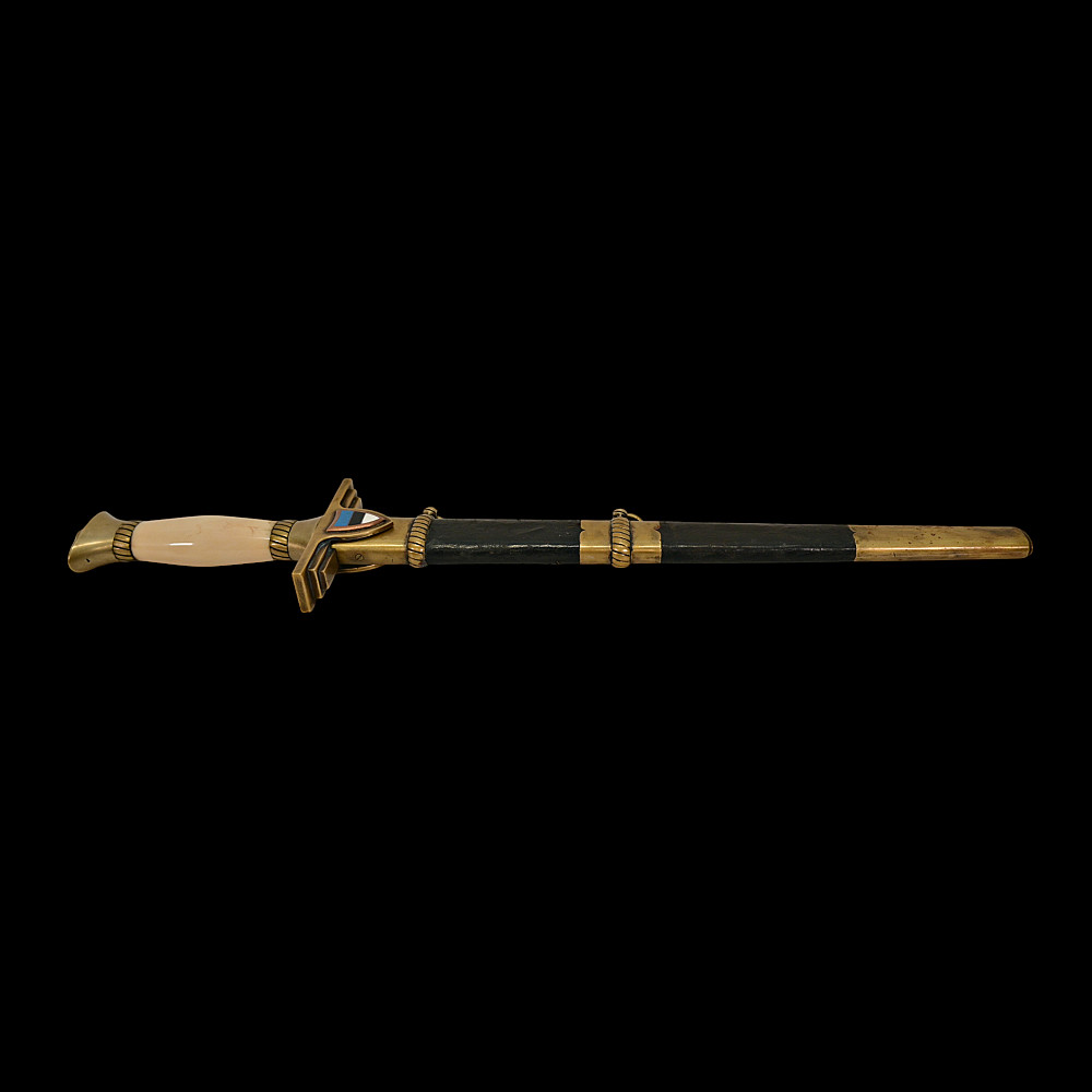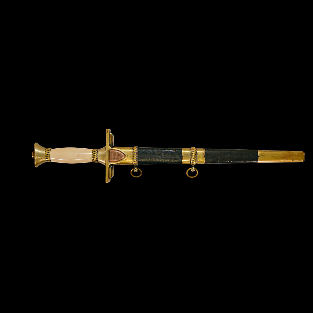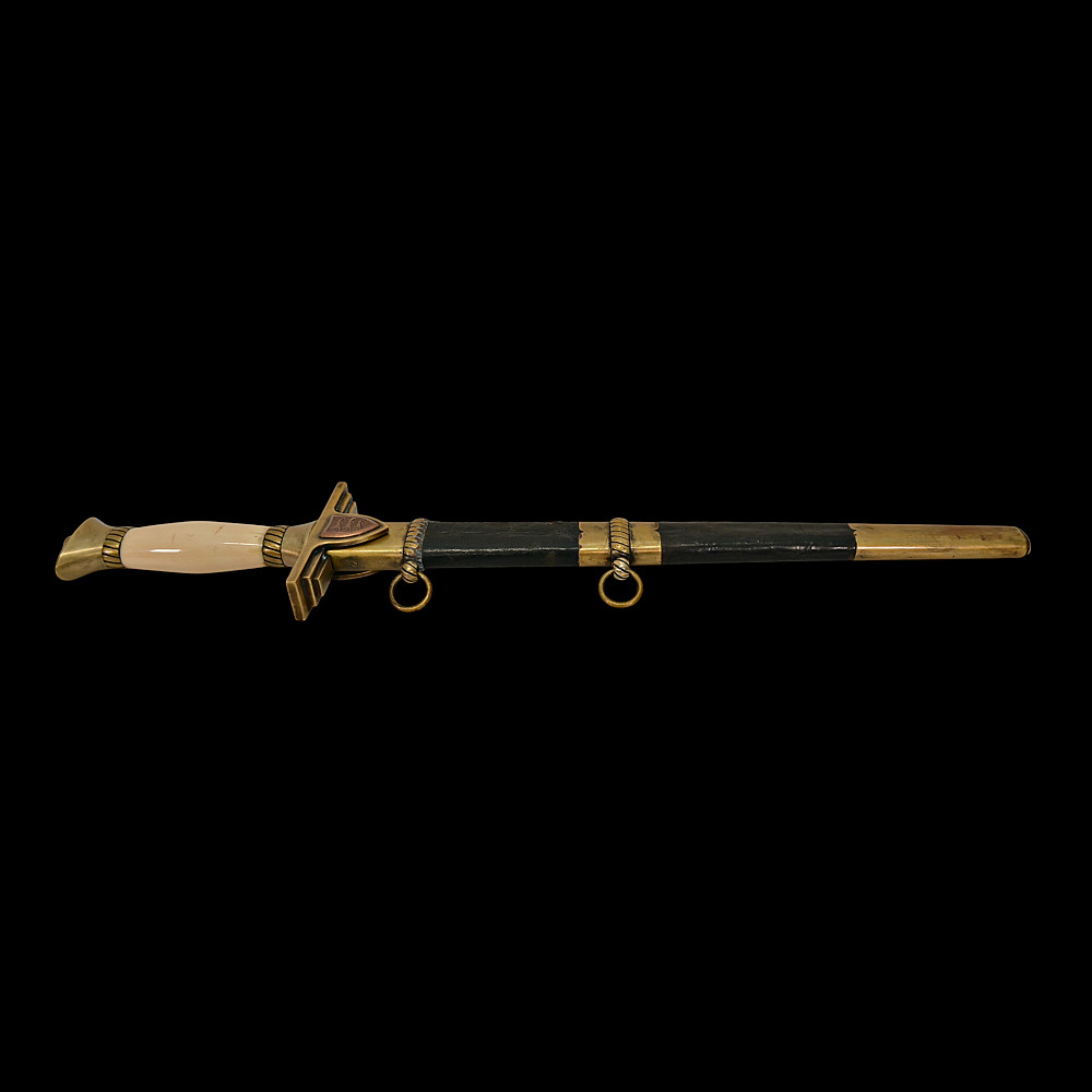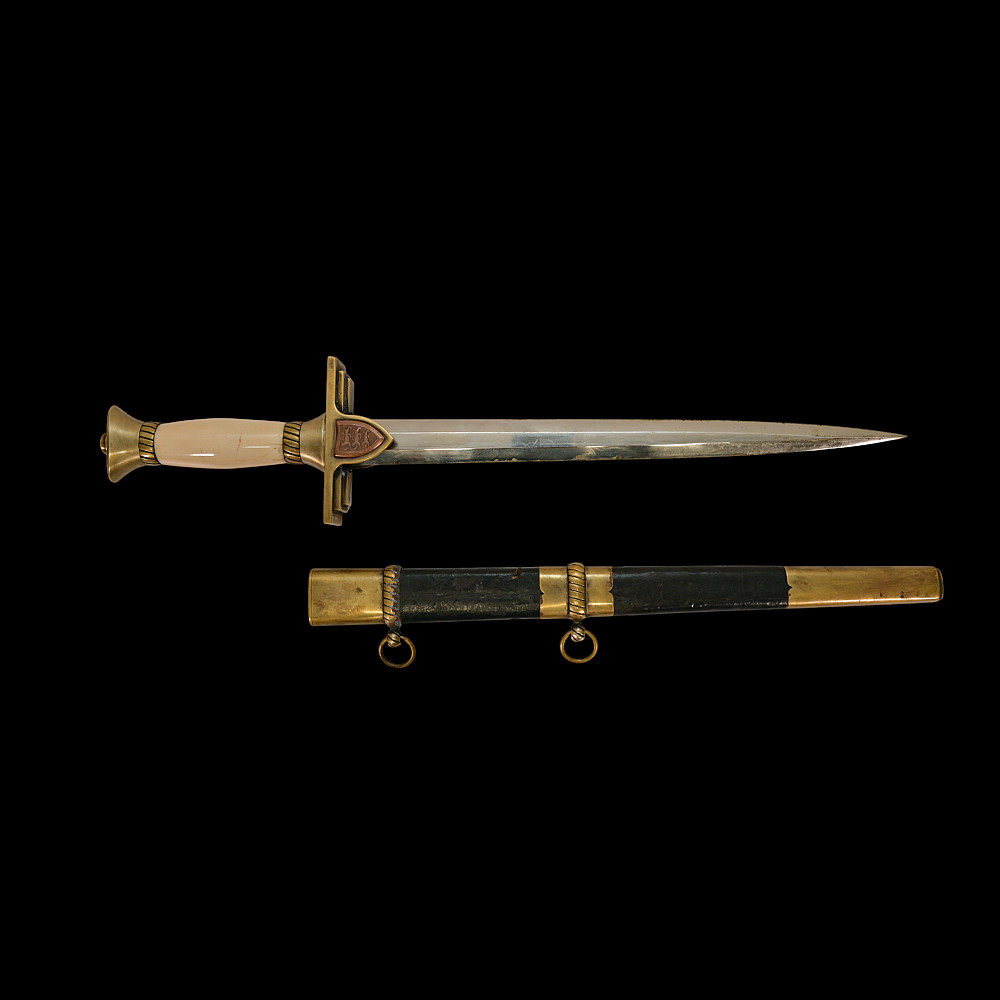 Extra Rare Estonian Officer's Dagger, First Republic Period (1918–1940). An exceptionally rare Estonian officer’s dress dagger, dating from the era of the First Republic of Estonia (1918–1940). These daggers were privately commissioned and carried by senior officers as symbols of national service and status. The dagger features a straight, double-edged blade housed in its original leather-covered brass scabbard with two suspension rings. The hilt is mounted in gilt brass with a finely polished bone grip, and the crossguard bears enamelled national shields—one side with the Estonian tricolor (blue, black, and white), the other with the coat of arms of Estonia, depicting three lions passant guardant. Elegant in proportion and refined in execution, this dagger reflects both the Art Deco influences of the interwar period and the patriotic spirit of the newly independent Estonian state. Such examples are exceedingly scarce, especially in complete and well-preserved condition. A highly desirable collector’s piece representing one of the rarest military daggers of the Baltic region. Good condition. Length: approx. 44 cm.