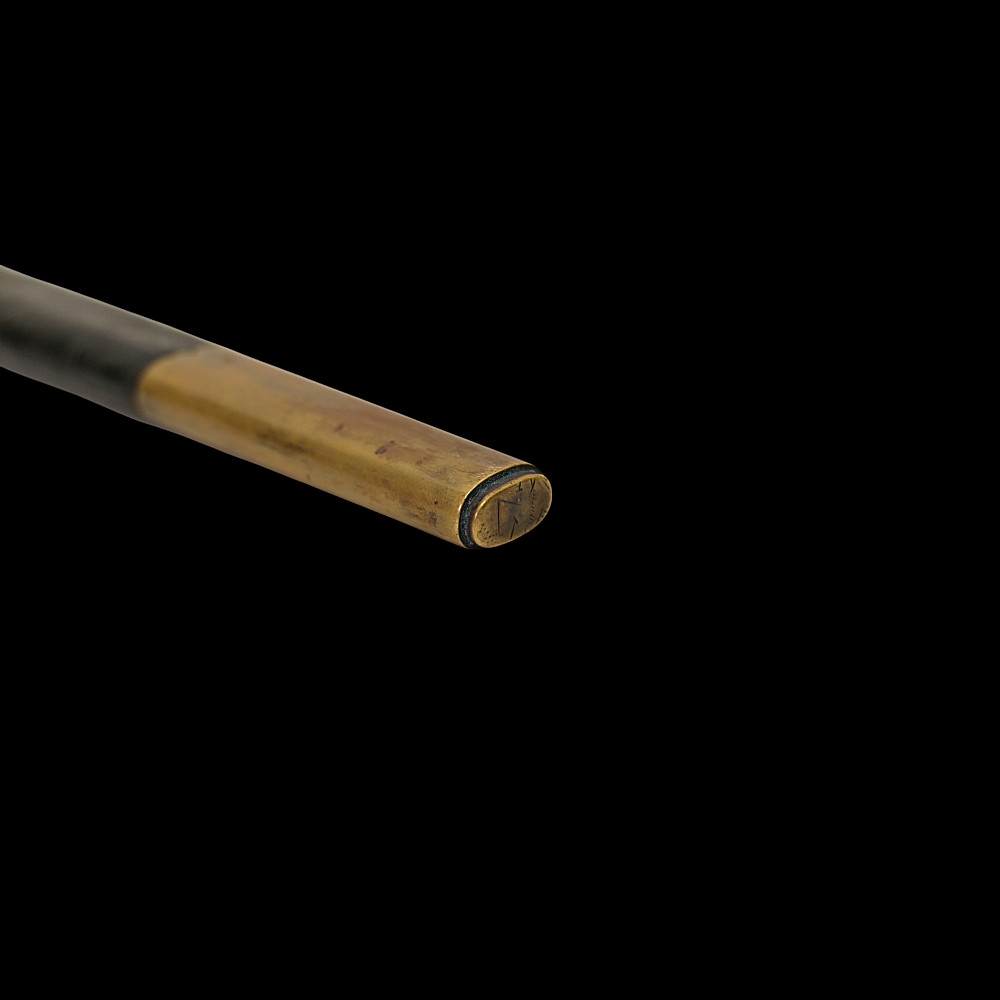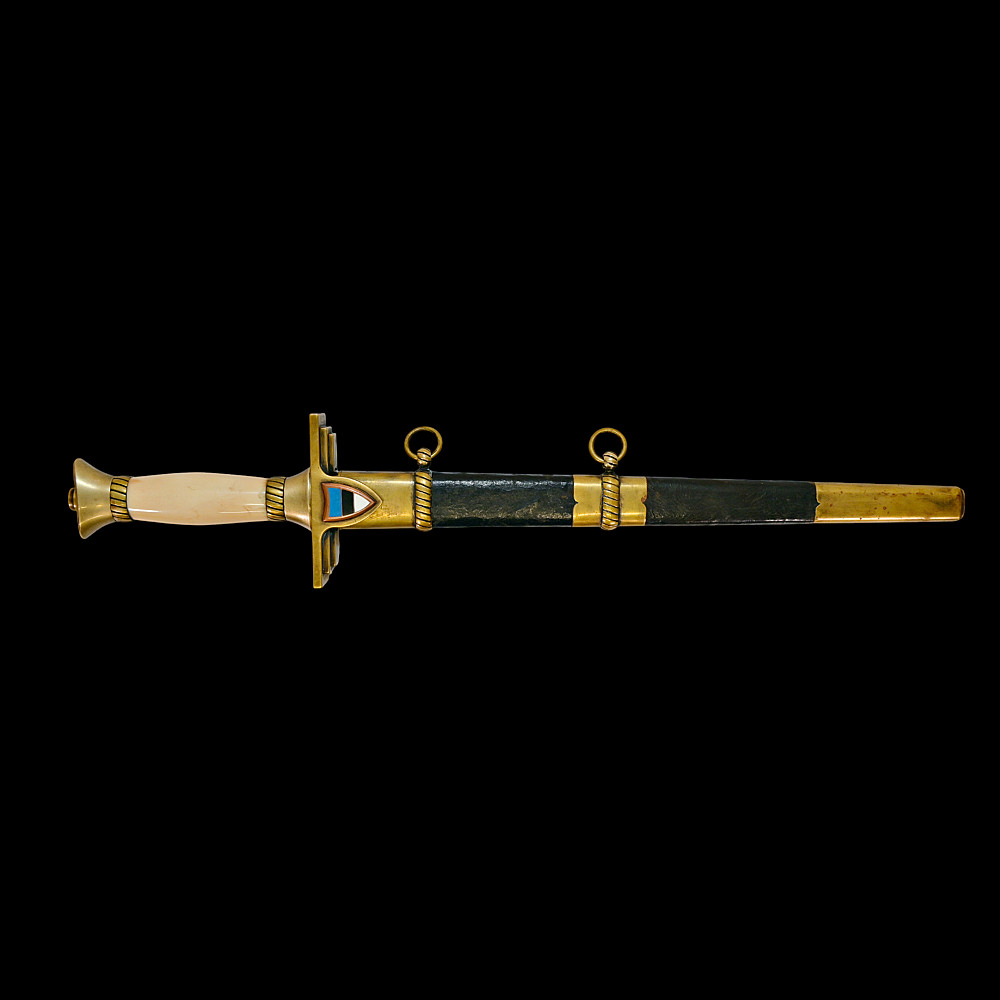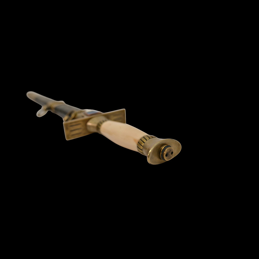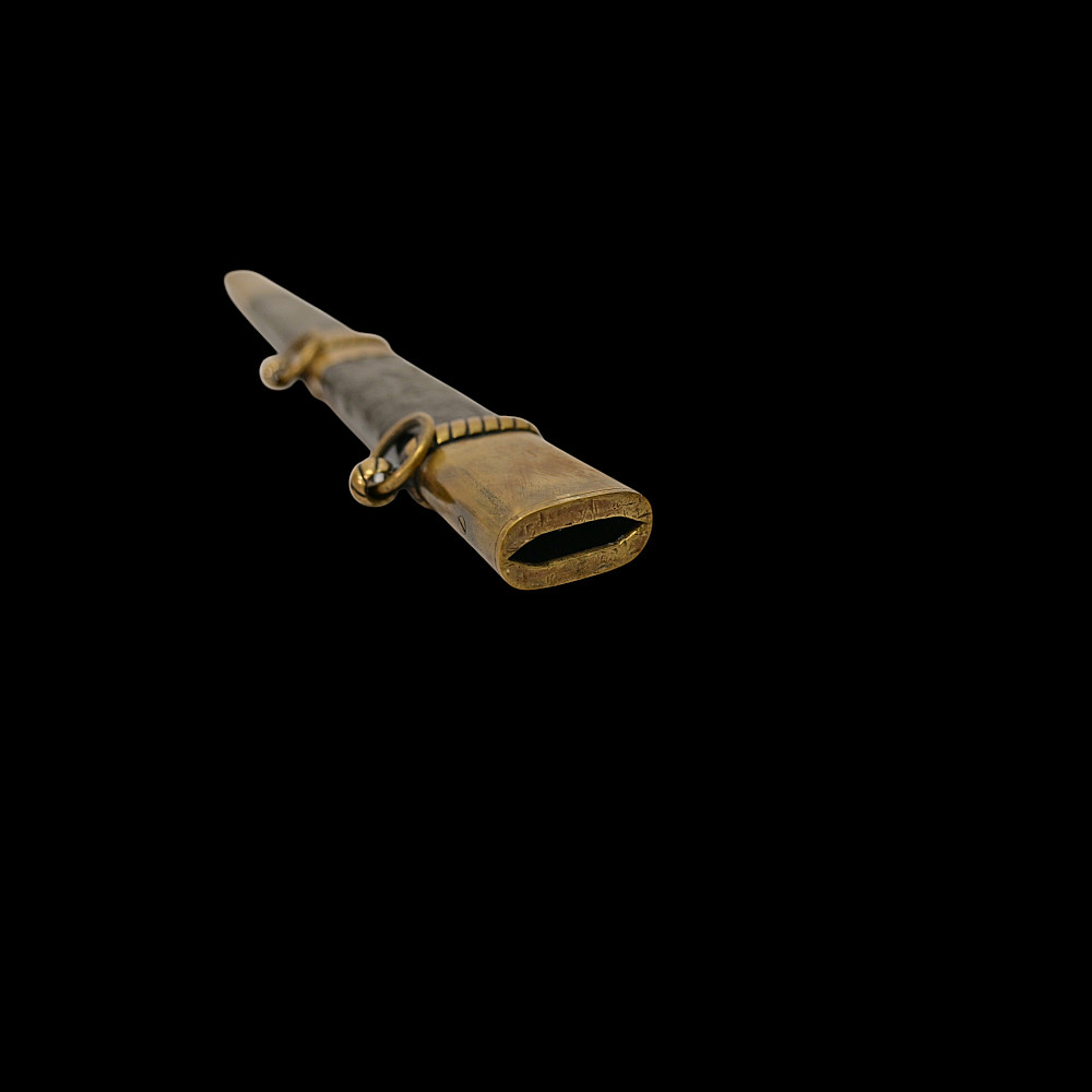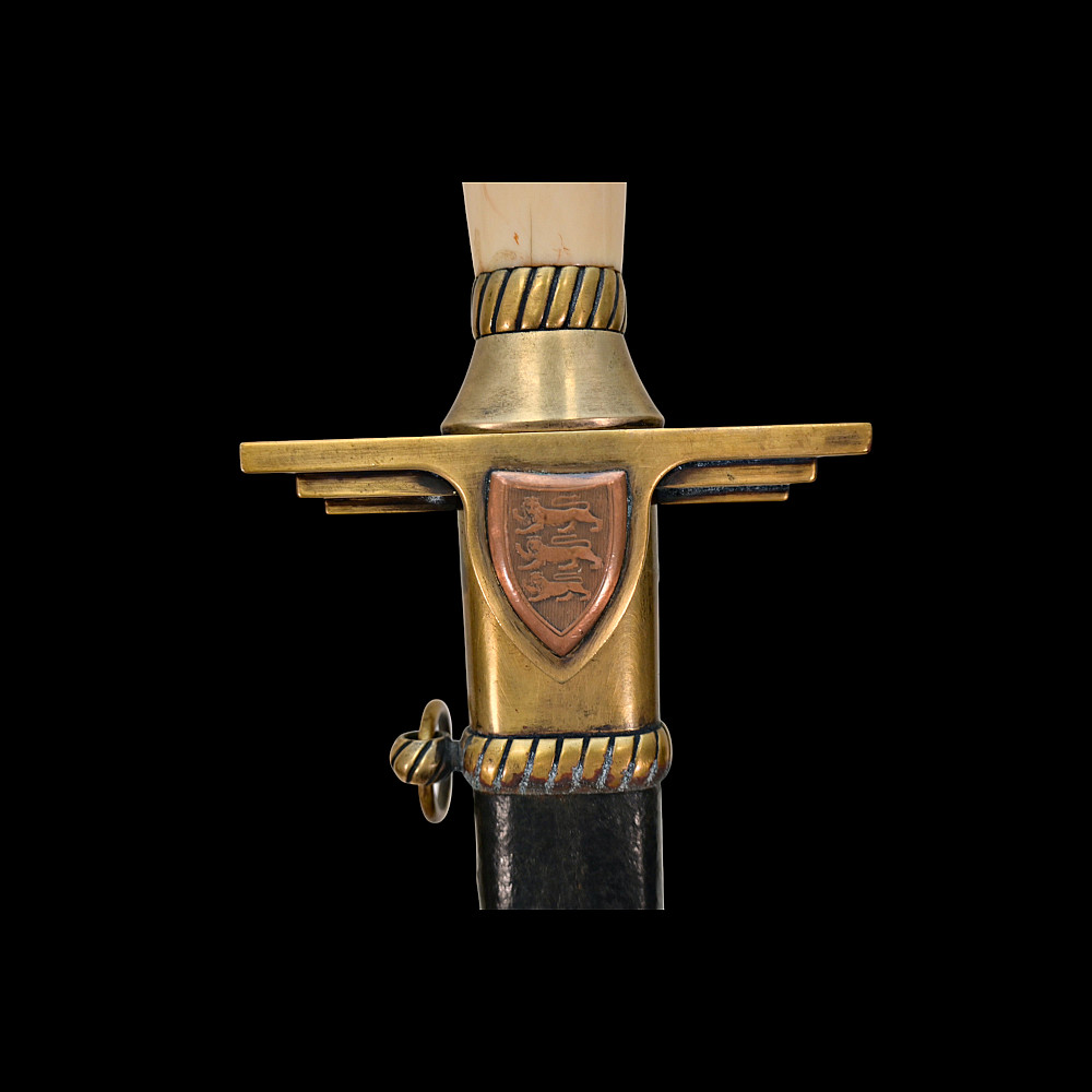 Extra Rare Estonian Officer's Dagger, First Republic Period (1918–1940). An exceptionally rare Estonian officer’s dress dagger, dating from the era of the First Republic of Estonia (1918–1940). These daggers were privately commissioned and carried by senior officers as symbols of national service and status. The dagger features a straight, double-edged blade housed in its original leather-covered brass scabbard with two suspension rings. The hilt is mounted in gilt brass with a finely polished bone grip, and the crossguard bears enamelled national shields—one side with the Estonian tricolor (blue, black, and white), the other with the coat of arms of Estonia, depicting three lions passant guardant. Elegant in proportion and refined in execution, this dagger reflects both the Art Deco influences of the interwar period and the patriotic spirit of the newly independent Estonian state. Such examples are exceedingly scarce, especially in complete and well-preserved condition. A highly desirable collector’s piece representing one of the rarest military daggers of the Baltic region. Good condition. Length: approx. 44 cm.
