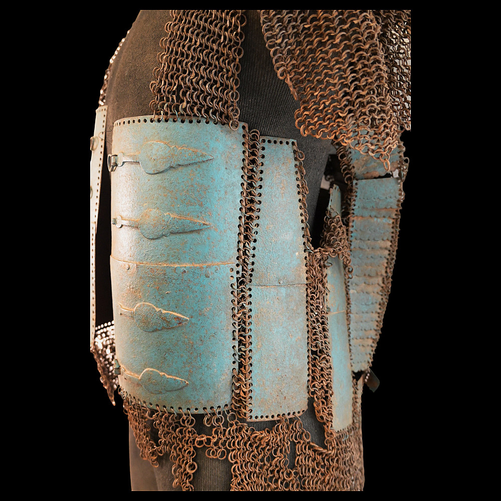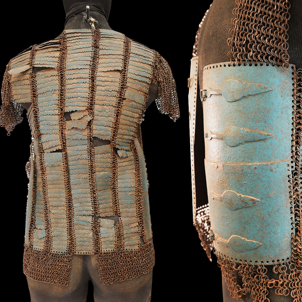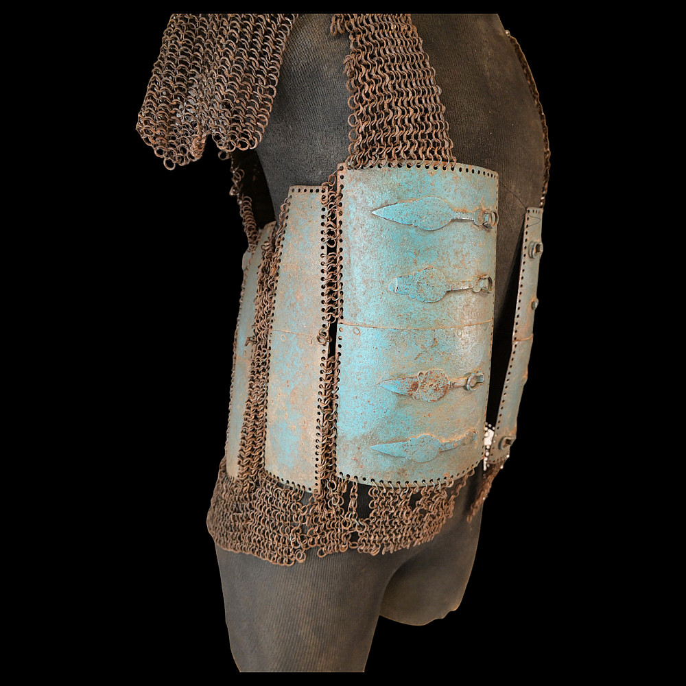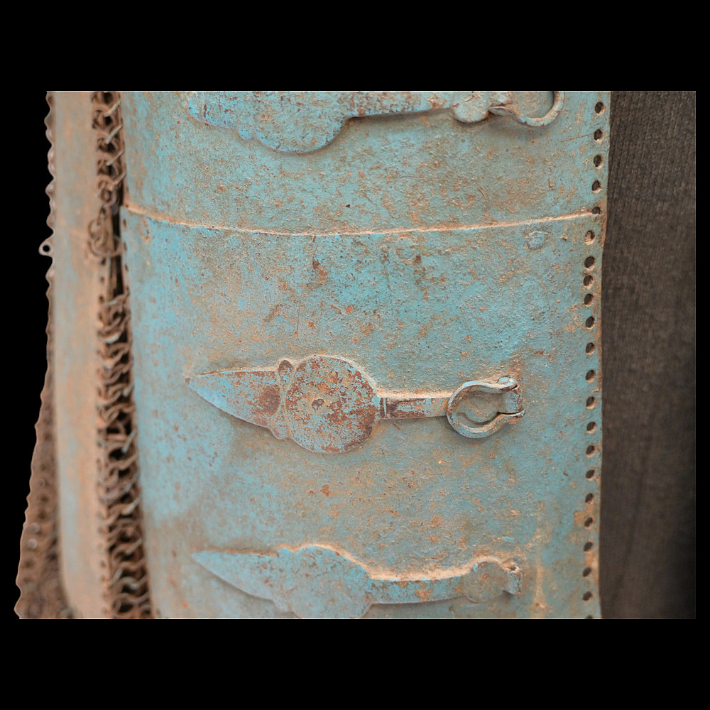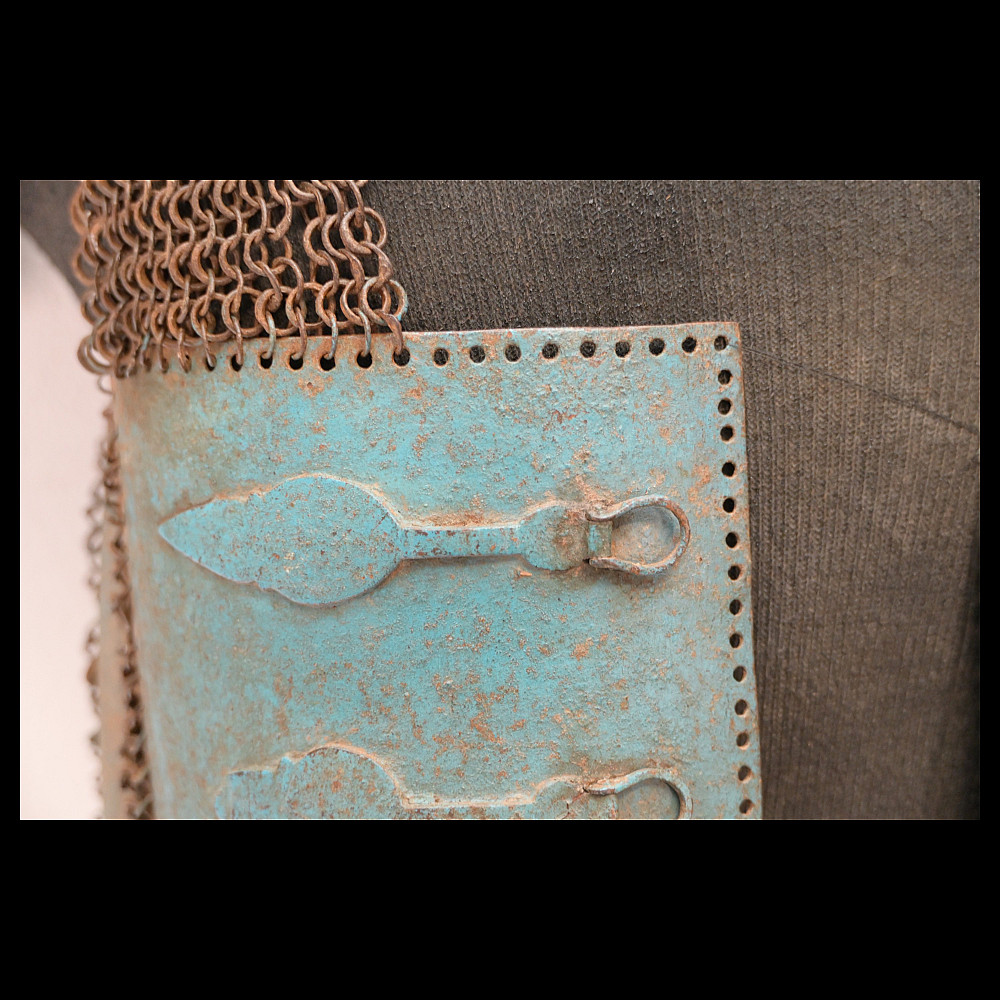 Extra rare Indian armor, Sikh warrior order Dal Khalsa, Nihang or Akali, early 18th century. Forged of riveted rings set with forged steel plates in the characteristic pattern, with applied, profiled closures. The armor plates are painted blue. Defects in chain mail due to old age. The Nihang (also spelled as Nihung lit. "Crocodiles") or Akali (lit. "Immortals"), also known as Dal Khalsa, is an armed Sikh warrior order originating in the Indian subcontinent. Traditional Nihang dress is known as Khalsa Swarupa. This comprises full attire of navy blue selected by Guru Gobind Singh after conflicts with Vazir Khan. Probably the blue color of the armor is associated with these historical events. A very rare collector's item. length 51 cm.
