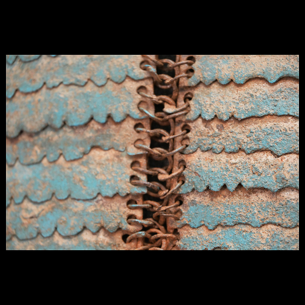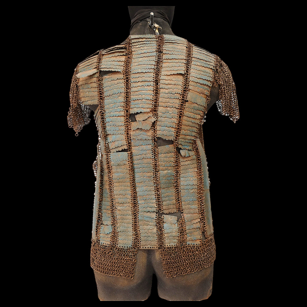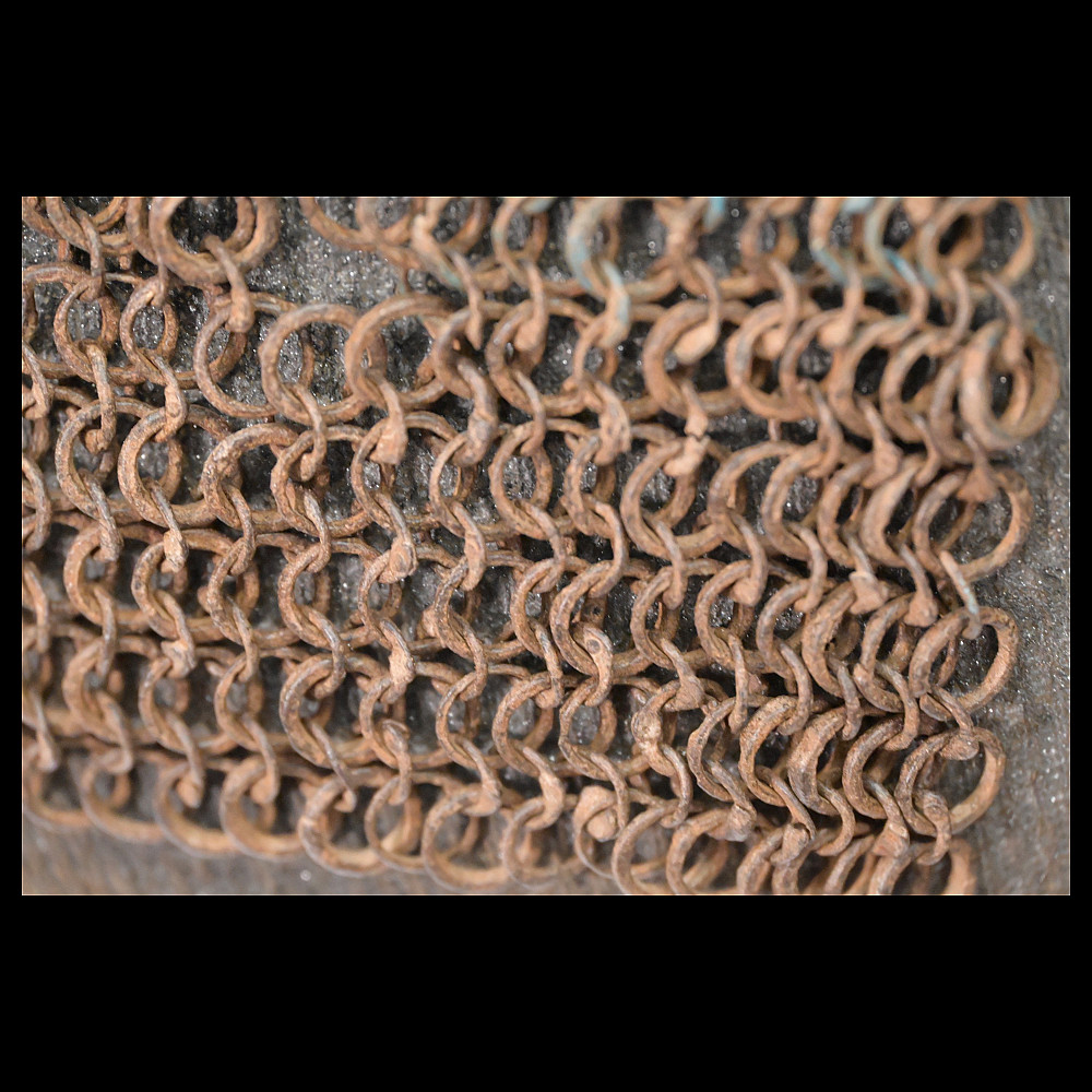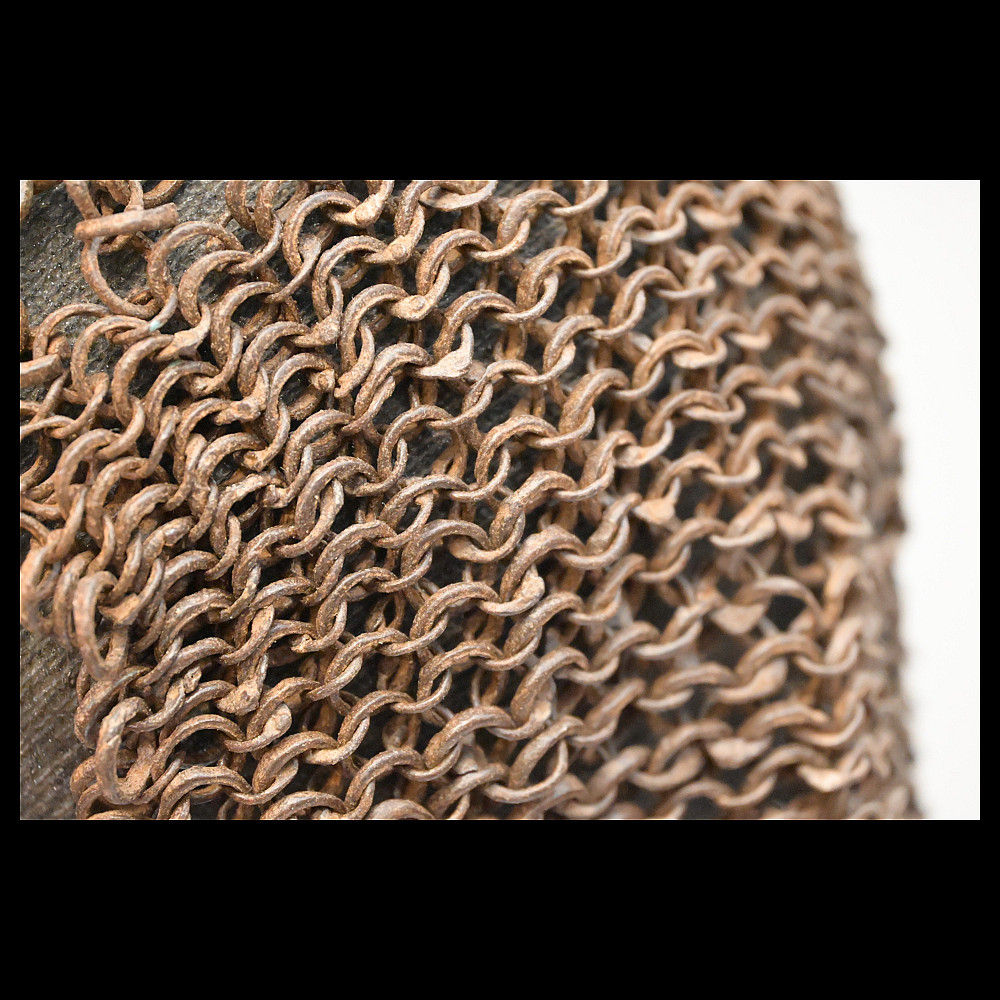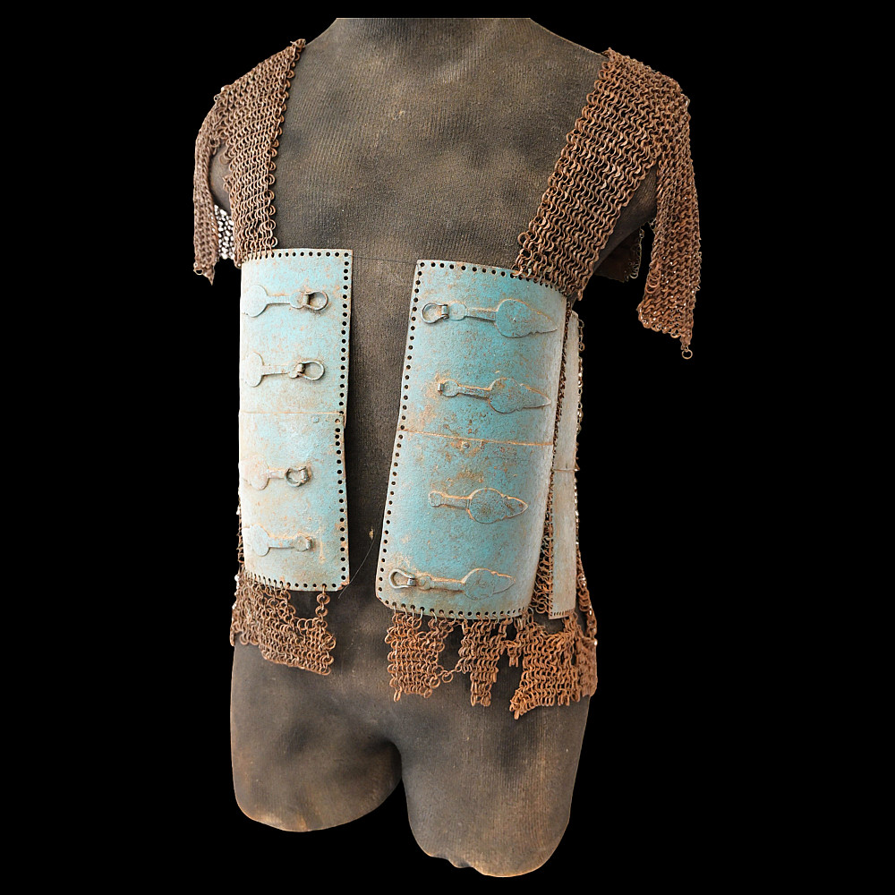 Extra rare Indian armor, Sikh warrior order Dal Khalsa, Nihang or Akali, early 18th century. Forged of riveted rings set with forged steel plates in the characteristic pattern, with applied, profiled closures. The armor plates are painted blue. Defects in chain mail due to old age. The Nihang (also spelled as Nihung lit. "Crocodiles") or Akali (lit. "Immortals"), also known as Dal Khalsa, is an armed Sikh warrior order originating in the Indian subcontinent. Traditional Nihang dress is known as Khalsa Swarupa. This comprises full attire of navy blue selected by Guru Gobind Singh after conflicts with Vazir Khan. Probably the blue color of the armor is associated with these historical events. A very rare collector's item. length 51 cm.